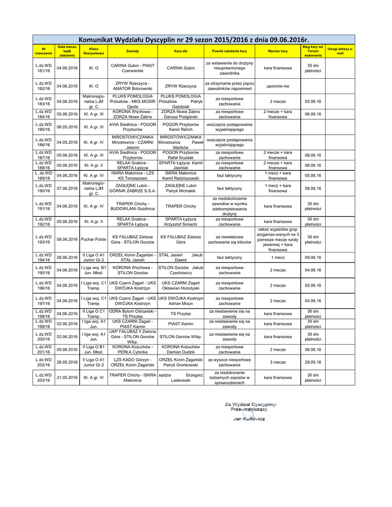 Komunikat Wydziału Dyscyplin nr 29 sezon 2015/2016 z dnia 09.06.2016r. Nr orzeczenia Data meczu bądź zdarzenia Klasa Rozrywkowa Zawody Kara dla Powód nałożenia kary Wymiar kary Bieg kary od. Termin wykonania L.dz.WD 181/16 04.06.2016 Kl. O CARINA Gubin - PIAST Czerwieńsk CARINA Gubin za wstawienie do drużyny nieuprawnionego zawodnika kara finansowa 30 dni płatności L.dz.WD 182/16 04.06.2016 Kl. O ZRYW Rzeczyca AMATOR Bobrowniki ZRYW Rzeczyca za otrzymanie przez pięciu zawodników napomnień upomnie-nie L.dz.WD 183/16 04.06.2016 Makroregionalna LJM gr. C za niesportowe zachowanie 2 mecze 05.06.16 L.dz.WD 184/16 05.06.2016 Kl. A gr. III za niesportowe zachowanie 2 mecze + kara finansowa 06.06.16 L.dz.WD 185/16 06.05.2016 Kl. A gr. III L.dz.WD 186/16 04.05.2016 Kl. A gr. IV 05.06.2016 Kl. A gr. III 05.06.2016 Kl. A gr. II L.dz.WD 187/16 L.dz.WD 188/16 L. dz.WD 189/16 PLUKS POMOLOGIA PLUKS POMOLOGIA Prószków - MKS MOSIR Prószków Patryk Opole Gaździak KORONA Wschowa ZORZA Nowe Żabno ZORZA Nowe Żabno Dariusz Podgórski AVIA Siedlnica - POGOŃ Przyborów POGOŃ Przyborów Kamil Relich wszczęcie postępowania wyjaśniającego MIROSTOWICZANKA MIROSTOWICZANKA wszczęcie postępowania Mirostowice - CZARNI Mirostowice Paweł wyjaśniającego Jelenin Maćków AVIA Siedlnica - POGOŃ POGOŃ Przyborów za niesportowe Przyborów Rafał Siuzdak zachowanie RELAX Grabice SPARTA Łężyca Kamil za niesportowe SPARTA Łężyca Jasiński zachowanie ISKRA Małomice - LZS ISKRA Małomice faul taktyczny KS Tomaszowo Kamil Radziszowski 2 mecze + kara finansowa 2 mecze + kara finansowa 1 mecz + kara finansowa 1 mecz + kara finansowa 08.06.16 kara finansowa 30 dni płatności kara finansowa 30 dni płatności 06.06.16 06.06.16 04.06.2016 Kl. A gr. IV L.dz.WD 190/16 07.06.2016 Makroregionalna LJM gr. C ZAGŁĘBIE Lubin GÓRNIK ZABRZE S.S.A. ZAGŁĘBIE Lubin Patryk Michałek L.dz.WD 191/16 04.06.2016 Kl. A gr. IV TRAPER Chichy BUDOWLANI Gozdnica TRAPER Chichy L.dz.WD 192/16 05.06.2016 Kl. A gr. II RELAX Grabice SPARTA Łężyca SPARTA Łężyca Krzysztof Simachi za niedokończenie zawodów w wyniku zdekompletowania drużyny za niesportowe zachowanie KS FALUBAZ Zielona Góra - STILON Gorzów KS FALUBAZ Zielona Góra za niewłaściwe zachowanie się kibiców zakaz wyjazdów grup zorganizo-wanych na 3 pierwsze mecze rundy jesiennej + kara finansowa 30 dni płatności faul taktyczny 1 mecz 09.06.16 STILON Gorzów Jakub Czechowicz za niesportowe zachowanie 2 mecze 04.06.16 UKS CZARNI Żagań Oktawian Horodyski za niesportowe zachowanie 2 mecze 05.06.16 2 mecze 04.06.16 faul taktyczny L.dz.WD 193/16 08.06.2016 Puchar Polski L.dz.WD 194/16 08.06.2016 II Liga O A1 Junior Gr.2 L.dz.WD 195/16 04.06.2016 I Liga woj. B1 Jun. Młod. L.dz.WD 196/16 04.06.2016 I Liga woj. C1 UKS Czarni Żagań - UKS Tramp. DWÓJKA Kostrzyn L.dz.WD 197/16 04.06.2016 I Liga woj. C1 UKS Czarni Żagań - UKS UKS DWÓJKA Kostrzyn Tramp. DWÓJKA Kostrzyn Adrian Misun za niesportowe zachowanie II Liga O C1 ODRA Bytom Odrzański TS Przylep Tramp. TS Przylep I liga woj. A1 UKS CZARNI Żagań PIAST Karnin Jun. PIAST Karnin UKP FALUBAZ II Zielona I liga woj. A1 Góra - STILON Gorzów STILON Gorzów Wlkp. Jun. Wlkp. II Liga O B1 KORONA Kożuchów KORONA Kożuchów Jun. Młod. PERŁA Cybinka Damian Dudzik za niestawienie się na zawody za niestawienie się na zawody L.dz.WD 198/16 L.dz.WD 199/16 04.06.2016 02.06.2016 L.dz.WD 200/16 02.06.2016 L.dz.WD 201/16 05.06.2016 L.dz.WD 202/16 28.05.2016 II Liga O A1 Junior Gr.2 L.dz.WD 203/16 21.05.2016 Kl. A gr. IV ORZEŁ Konin Żagański - STAL Jasień STAL Jasień Dawid KORONA Wschowa STILON Gorzów LZS KADO Górzyn ORZEŁ Konin Żagański Jakub ORZEŁ Konin Żagański Patryk Gronkowski TRAPER Chichy - ISKRA sędzia Grzegorz Małomice Laskowski kara finansowa kara finansowa 05.06.16 30 dni płatności 30 dni płatności za niestawienie się na zawody kara finansowa 30 dni płatności za niesportowe zachowanie 2 mecze 06.06.16 za wysoce niesportowe zachowanie 3 mecze 29.05.16 za niedokonanie tożsamych zapisów w sprawozdaniach kara finansowa 30 dni płatności Uwagi adresy email