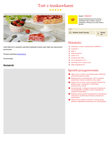 Tort z truskawkami Autor: WINIARY Zespół doświadczonych kucharzy i dietetyków dba o jakość naszych przepisów. Winiary.pl to znak smaku i jakości. Kalorie: kcal/1 porcję Porcji: 10 Składniki: Letni lekki tort z owocami (zamiast truskawek można użyć malin lub czerwonych porzeczek). Galaretka o smaku truskawkowym WINIARY 1 truskawki 1 jajka 4 Przepis autorstwa tortownia.pl mąka pszenna 1 cukier 0,75 Smacznego! śmietana 30% 500 sok truskawkowy 0,75 wyciśnięty sok z cytryny 0,25 Notatnik płatki migdałowe 50 Sposób przygotowania: Jajka utrzyj z cukrem na puszystą masę. Delikatnie domieszaj przesianą mąkę. Biszkopt upiecz w temperaturze 160°C (sprawdź patyczkiem), ostudź i przekrój na trzy części. Zagotuj 150 ml wody, wsyp zawartość Galaretki do gorącej wody i wymieszaj do całkowitego rozpuszczenia, ostudź. Kremówkę ubij, a następnie stopniowo dodawaj do zimnej galaretki, za każdym razem mieszając do połączenia składników. Biszkopt nasącz sokiem truskawkowym zmieszanym z cytrynowym, przełóż bitą śmietaną i pokrojonymi truskawkami. Wierzch tortu udekoruj owocami, a brzegi obsyp płatkami migdałowymi uprażonymi na suchej patelni.