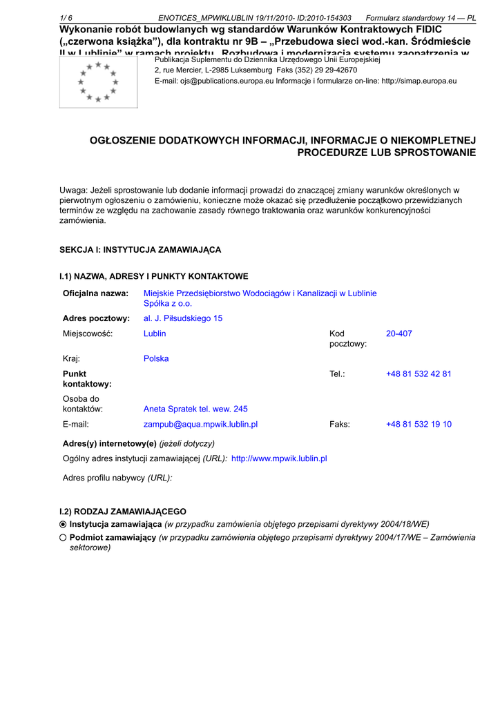 1/ 6 ENOTICES_MPWIKLUBLIN 19/11/2010- ID:2010-154303 Formularz standardowy 14 — PL Wykonanie robót budowlanych wg standardów Warunków Kontraktowych FIDIC („czerwona książka”), dla kontraktu nr 9B – „Przebudowa sieci wod.-kan. Śródmieście II w Lublinie” w ramach projektu „Rozbudowa i modernizacja systemu zaopatrzenia w Publikacja Suplementu do Dziennika Urzędowego Unii Europejskiej wodę i odprowadzania ścieków w Lublinie”. 2, rue Mercier, L-2985 Luksemburg Faks (352) 29 29-42670 E-mail: [email protected] Informacje i formularze on-line: http://simap.europa.eu OGŁOSZENIE DODATKOWYCH INFORMACJI, INFORMACJE O NIEKOMPLETNEJ PROCEDURZE LUB SPROSTOWANIE Uwaga: Jeżeli sprostowanie lub dodanie informacji prowadzi do znaczącej zmiany warunków określonych w pierwotnym ogłoszeniu o zamówieniu, konieczne może okazać się przedłużenie początkowo przewidzianych terminów ze względu na zachowanie zasady równego traktowania oraz warunków konkurencyjności zamówienia. SEKCJA I: INSTYTUCJA ZAMAWIAJĄCA I.1) NAZWA, ADRESY I PUNKTY KONTAKTOWE Oficjalna nazwa: Miejskie Przedsiębiorstwo Wodociągów i Kanalizacji w Lublinie Spółka z o.o. Adres pocztowy: al. J. Piłsudskiego 15 Miejscowość: Lublin Kraj: Polska Punkt kontaktowy: Osoba do kontaktów: Aneta Spratek tel. wew. 245 E-mail: [email protected] Kod pocztowy: 20-407 Tel.: +48 81 532 42 81 Faks: +48 81 532 19 10 Adres(y) internetowy(e) (jeżeli dotyczy) Ogólny adres instytucji zamawiającej (URL): http://www.mpwik.lublin.pl Adres profilu nabywcy (URL): I.2) RODZAJ ZAMAWIAJĄCEGO Instytucja zamawiająca (w przypadku zamówienia objętego przepisami dyrektywy 2004/18/WE) Podmiot zamawiający (w przypadku zamówienia objętego przepisami dyrektywy 2004/17/WE – Zamówienia sektorowe) 2/ 6 ENOTICES_MPWIKLUBLIN 19/11/2010- ID:2010-154303 Formularz standardowy 14 — PL Wykonanie robót budowlanych wg standardów Warunków Kontraktowych FIDIC („czerwona książka”), dla kontraktu nr 9B – „Przebudowa sieci wod.-kan. Śródmieście II w Lublinie” w ramach projektu „Rozbudowa i modernizacja systemu zaopatrzenia w SEKCJA II: PRZEDMIOT ZAMÓWIENIA wodę i odprowadzania ścieków w Lublinie”. II.1) OPIS II.1.1) Nazwa nadana zamówieniu przez instytucję zamawiającą (podano w pierwotnym ogłoszeniu) Wykonanie robót budowlanych wg standardów Warunków Kontraktowych FIDIC („czerwona książka”), dla kontraktu nr 9B – „Przebudowa sieci wod.-kan. Śródmieście II w Lublinie” w ramach projektu „Rozbudowa i modernizacja systemu zaopatrzenia w wodę i odprowadzania ścieków w Lublinie”. II.1.2) Krôtki opis (podano w pierwotnym ogłoszeniu) Przedmiot niniejszego zamówienia stanowi: Wykonanie robót budowlanych obejmujących przebudowę sieci i odgałęzień kanalizacji sanitarnej oraz sieci i odgałęzień wodociągowych w Lublinie w ramach Kontraktu nr 9B „Przebudowa sieci wod.-kan. Śródmieście II w Lublinie”, projektu pn. „Rozbudowa i modernizacja systemu zaopatrzenia w wodę i odprowadzania ścieków w Lublinie” współfinansowanego ze środków Unii Europejskiej – Program Operacyjny Infrastruktura i Środowisko 2007 – 2013 pod numerem OZ/321/57/10, realizowanych według "WARUNKÓW KONTRAKTOWYCH DLA BUDOWY DLA ROBÓT INŻYNIERYJNO-BUDOWLANYCH PROJEKTOWANYCH PRZEZ ZAMAWIAJĄCEGO, FIDIC – CZERWONA KSIĄŻKA ", opublikowanych przez Międzynarodową Federację Inżynierów Konsultantów (Fédération Internationale des Ingénieurs-Conseils – FIDIC), P.O. Box 86, CH-1000 Lausanne 12, Szwajcaria, czwarte wydanie angielsko-polskie 2008, tłumaczenie pierwszego wydania z 1999 r. Kontrakt 9B podzielony jest na cztery zadania inwestycyjne realizowane w ramach jednego zamówienia i obejmuje następujące zakresy robót: Zadanie 1 – Przebudowa sieci wodociągowej i kanalizacyjnej w ulicach: ul. Konopnicka (sieć wodociągowa), ul. Orla (sieć wodociągowa), ul. Krucza (sieć wodociągowa), ul. Gawareckich (sieć wodociągowa), ul. Górna (sieć wod.-kan.), ul. Dolna Panny Marii (Pl. Wolności-ul. Mościckiego – sieć wod.-kan.): Zadanie obejmuje przebudowę sieci wodociągowej i kanalizacyjnej w ulicach: ul. Konopnicka (sieć wodociągowa) – Ø125, Ø90, Ø 63 o łącznej długości ok.L=0,29 km, ul. Orla (sieć wodociągowa) – Ø125, Ø90, Ø 63 o łącznej długości ok. L=0,25 km, ul. Krucza (sieć wodociągowa) – Ø125, Ø90, Ø 63 o łącznej długości ok. L=0,13 km, ul. Gawareckich (sieć wodociągowa) – Ø125, Ø90, Ø 63 o łącznej długości ok. L=0,14 km, ul. Górna (sieć wodociągowa) – Ø125, Ø90, Ø 63 o łącznej długości ok. L=0,30 km, ul. Górna (sieć kanalizacyjna) – Ø200, Ø 150 o łącznej długości ok. L=0,27 km, ul. Dolna Panny Marii (Pl. Wolności – ul. Mościckiego; sieć wodociągowa) – Ø180, Ø90, Ø 63, Ø40 o łącznej długości ok. L=0,50 km ul. Dolna Panny Marii (Pl. Wolności – ul. Mościckiego; sieć kanalizacyjna) – Ø250, Ø200, Ø 150 o łącznej długości ok. L=0,45km Zadanie 2 – Przebudowa sieci wodociągowej i kanalizacyjnej w ulicach: ul. Wschodnia (sieć wod.-kan.), ul. Środkowa (sieć wod.-kan.), ul. Gminna (sieć wod.-kan.), ul. Graniczna (sieć wod.-kan.), ul. Dolna Panny Marii (ul. Mościckiego-Al. Piłsudskiego – sieć wod.-kan.): Zadanie obejmuje przebudowę sieci wodociągowej i kanalizacyjnej w ulicach: ul. Wschodnia (sieć wodociągowa) – Ø125, Ø100, Ø80, Ø63 o łącznej długości ok. L=0,31 km, ul. Wschodnia (sieć kanalizacyjna) – Ø200, Ø150, o łącznej długości ok. L=0,30 km, ul. Środkowa (sieć wodociągowa) – Ø125, Ø110, Ø80, Ø63, Ø 40 o łącznej długości ok. L=0,26 km, ul. Środkowa (sieć kanalizacyjna) – Ø200, Ø150 o łącznej długości ok. L=0,25 km, ul. Gminna (sieć wodociągowa) – Ø125, Ø80, Ø63, Ø40 o łącznej długości ok. L=0,19 km, ul. Gminna (sieć kanalizacyjna) – Ø250, Ø150, o łącznej długości ok. L=0,19 km, ul. Graniczna (sieć w