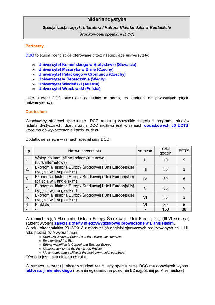 Niderlandystyka Specjalizacja: Język, Literatura i Kultura Niderlandzka w Kontekście Środkowoeuropejskim (DCC) Partnerzy DCC to studia licencjackie oferowane przez następujące uniwersytety: • • • • • • Uniwersytet Komeńskiego w Bratysławie (Słowacja) Uniwersytet Masaryka w Brnie (Czechy) Uniwersytet Palackiego w Ołomuńcu (Czechy) Uniwersytet w Debreczynie (Węgry) Uniwersytet Wiedeński (Austria) Uniwersytet Wrocławski (Polska) Jako student DCC studiujesz dokładnie to samo, co studenci na pozostałych pięciu uniwersytetach. Curriculum Wrocławscy studenci specjalizacji DCC realizują wszystkie zajęcia z programu studiów niderlandystycznych. Specjalizacja DCC moŜliwa jest w ramach dodatkowych 30 ECTS, które ma do wykorzystania kaŜdy student. Dodatkowe zajęcia w ramach specjalizacji DCC: Lp. 1. 2. 3. 4. 5. 6. - Nazwa przedmiotu Wstęp do komunikacji międzykulturowej (kurs internetowy) Ekonomia, historia Europy Środkowej i Unii Europejskiej (zajęcia w j. angielskim) Ekonomia, historia Europy Środkowej i Unii Europejskiej (zajęcia w j. angielskim) Ekonomia, historia Europy Środkowej i Unii Europejskiej (zajęcia w j. angielskim) Ekonomia, historia Europy Środkowej i Unii Europejskiej (zajęcia w j. angielskim) Praktyka - semestr liczba godzin ECTS II 10 5 III 30 5 IV 30 5 V 30 5 VI 30 5 VI - 30 160 5 30 W ramach zajęć Ekonomia, historia Europy Środkowej i Unii Europejskiej (III-VI semestr) student wybiera zajęcia z oferty międzywydziałowej prowadzone w j. angielskim. W roku akademickim 2012/2013 z oferty zajęć angielskojęzycznych realizowanych na II i III roku moŜna było wybrać m.in. • • • • • Democratization of Central and East European countries Economics of the EU Ethnic minorities in Central and Eastern Europe Management of the EU Funds and Project Mass media and politics in the post communist countries Oferta ta jest uaktualniana co roku. W ramach lektoratu j. obcego student realizujący specjalizację DCC ma obowiązek wyboru lektoratu j. niemieckiego (i zdania egzaminu na poziomie B2 najpóźniej po V semestrze) W ramach zajęć specjalizacyjnych (III-VI semestr) student moŜe wybrać takŜe jeden z kursów internetowych oferowanych przez z uniwersytety partnerskie: e-learning. Kursy te dotyczą literatury, języka i kultury niderlandzkiej w kontekście środkowoeuropejskim. Spośród wielu oferowanych zajęć moŜna wybrać np.: • • • • Recepcja literatury niderlandzkiej w Europie Środkowej w XX wieku Niderlandzki język prawa Terminologia Unii Europejskiej Historia sztuki niderlandzkiej Od studentów DCC oczekujemy takŜe fizycznej mobilności. Student ma obowiązek realizacji jednego semestru na uniwersytecie partnerskim DCC (30 ECTS). Podczas pobytu stypendialnego istnieje moŜliwość nauki języka czeskiego, słowackiego lub węgierskiego bądź kontynuowania nauki języka niemieckiego. KaŜdy student specjalizacji Język, Literatura i Kultura Niderlandzka w Kontekście Środkowoeuropejskim (DCC) odbędzie dodatkowo praktykę obejmującą min. 30 godz. Dyplom Po zakończeniu studiów student otrzymuje dyplom Uniwersytetu Wrocławskiego. Będzie na nim zaznaczone, Ŝe ukończył niderlandystykę ze specjalizacją Język, Literatura i Kultura Niderlandzka w Kontekście Środkowoeuropejskim (DCC). Do dyplomu zostanie dołączony suplement, w którym wymienione zostaną wszystkie zajęcia, w których brałeś udział. Warunki przyjęcia • • • • student I roku niderlandystyki (studia stacjonarne) deklaracja chęci realizacji programu specjalizacji Język, Literatura i Kultura Niderlandzka w Kontekście Środkowoeuropejskim (DCC) znajomość języka angielskiego w stopniu umoŜliwiającym uczestnictwo w zajęciach prowadzonych w tym języku (od II roku jedne zajęcia w semestrze prowadzone są w j. angielskim) znajomość języka niemieckiego w stopniu umoŜliwiającym czytanie artykułów w tym języku Rekrutacja na specjalizację DCC odbędzie się w semestrze zimowym 2013/2014. Zajęcia specjalizacyjne rozpoczynają się w semestrze letnim. Limit przyjęć max. 5 osób Więcej informacji znajdziesz na stronie: https://dcc.ned.univie.ac.at/