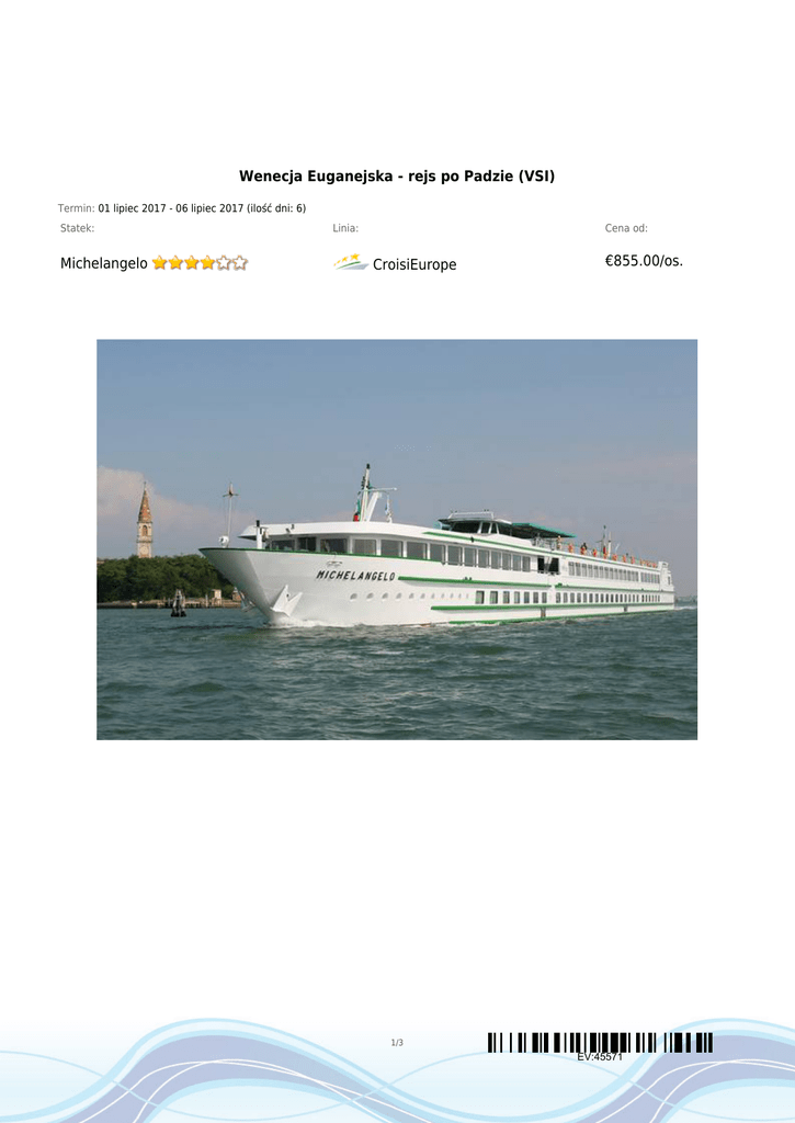 Wenecja Euganejska - rejs po Padzie (VSI) Termin: 01 lipiec 2017 - 06 lipiec 2017 (ilość dni: 6) Statek: Michelangelo Linia: Cena od: CroisiEurope €855.00/os. 1/3 EV:45571 TRASA REJSU dzień 1 Data Port Wpłynięcie Wypłynięcie sobota 01.07.2017 Wenecja --:-- --:-- Legenda Włochy Zaokrętowanie o godzinie 18:00. Koktajl powitalny i kolacja. Wolny wieczór w Wenecji. dzień 2 niedziela 02.07.2017 Chioggia --:-- --:-- Włochy Wczesnym rankiem wyruszymy w kierunku Chioggi. Po lunchu będzie możliwość skorzystania z wycieczki fakultatywnej do Padwy – miasta św. Antoniego, które jest znanym centrum pielgrzymkowym. Odwiedzimy bazylikę „Santo”, wybierzemy się na spacer po zabytkowym centrum miasta i odkryjemy słynną kawiarnię ”Pedrocchi”. dzień 2 niedziela 02.07.2017 Taglio di Po --:-- --:-- Włochy W międzyczasie statek popłynie w kierunku Taglio di Po gdzie dołączymy do niego około godziny 19:00. Dla uczestników którzy nie zdecydują się na skorzystanie z wycieczki przewidziany jest transfer do resortu Sottomarina. Będzie tutaj czas wolny żeby przespacerować się przepiękną nadmorska promenadą. Następnie przejazd do Taglio di Po, gdzie będzie czekać łódka. Po kolacji na statku przewidziany jest wieczór rozrywki. dzień 2 niedziela 02.07.2017 Polesella --:-- --:-- --:-- --:-- Włochy Na noc zacumujemy w Polesella. dzień 3 poniedziałek 03.07.2017 Ferrara Włochy Po śniadaniu wycieczka autokarem do Ferrary, która znajduje się na liście światowego dziedzictwa kultury i sztuki UNESCO. Powrót na statek na lunch. dzień 3 poniedziałek 03.07.2017 Werona --:-- --:-- Włochy Wczesnym popołudniem wycieczka autokarem do Werony – prawdziwie włoskiego miasta słynnego z dramatu „Romeo i Julia” i rzymskiego teatru. Powrót do Polsella. dzień 3 poniedziałek 03.07.2017 Taglio di Po --:-- --:-- --:-- --:-- Włochy Następnie wypłynięcie do Taglio Di Po i uroczysta kolacja na statku. dzień 4 wtorek 04.07.2017 Chioggia Włochy Po śniadaniu przejazd autokarem do Chioggi. Po drodze zatrzymamy się w urzekającej Adri na cześć której zostało nazwane Morze Adriatyckie. Chioggia była kiedyś drugim co do wielkości rzymskim portem. Stanowi ciekawą mieszankę różnych stylów oraz epok. Będzie okazja żeby przespacerować się po mieście i odkryć jego zakątki. dzień 4 wtorek 04.07.2017 Wenecja --:-- --:-- Włochy Po lunchu popłyniemy w kierunku Wenecji gdzie powinniśmy dotrzeć około godziny 14:30. Opcjonalnie do wyboru wycieczka po mieście ze zwiedzaniem Pałacu Dozów – symbolu chwały i potęgi Wenecji oraz słynnego Placu św. Marka. Powrót wieczorem na statek, na noc cumujemy w Wenecji. dzień 5 środa 05.07.2017 Wenecja --:-- --:-- Włochy Po śniadaniu możliwość skorzystania z wycieczki fakultatywnej na weneckie wyspy: Murano i Burano. Murano słynie z wyrobu szkła oraz kościołów: Santa Maria i San Donato. Burano natomiast znane jest z rybołówstwa, koronkarstwa oraz kolorowych domów. Po południu czas wolny lub opcjonalnie możliwość skorzystania z przejażdżki gondolą. Powrót na kolację. Na noc cumujemy w Wenecji. 2/3 EV:45571 dzień 6 Data Port Wpłynięcie Wypłynięcie czwartek 06.07.2017 Wenecja --:-- --:-- Legenda Włochy Wyokrętowanie o godzinie 9:00. CENNIK Cena katalogowa Kabina zewnętrzna z oknem od €855.00 3 osoba dorosła w kabinie zniżka 30% dziecko od 2 do 9 lat zniżka 20% Opłaty portowe Cena promocyjna w cenie Uwaga! Ceny za osobę w kabinie dwuosobowej. Cena zawiera: 6-dniowy (5 noclegów) rejs po Padzie; zakwaterowanie w kabinie dwuosobowej z klimatyzacją, prysznicem oraz WC; pełne wyżywienie od kolacji dnia pierwszego do śniadania dnia ostatniego; napoje w tym wodę, wino, piwo, soki owocowe i kawę serwowane podczas posiłków na pokładzie; opiekę hostessy na pokładzie; koktajl powitalny oraz uroczysty wieczór galowy; wycieczkę do Ferrary i Werony; opłaty portowe. Cena nie zawiera: kosztów dojazdu do portu; ubezpieczenia KL, NNW i bagaż; napojów serwowanych w barze, win z karty, szampana oraz napojów podczas wycieczek fakultatywnych i transferów; wycieczek fakultatywnych (można zarezerwować i zapłacić na pokładzie); wydatków osobistych. Wycieczki fakultatywne: • Wyspy Murano i Burano – €32/os. • wycieczka z przewodnikiem po Wenecji ze zwiedzaniem Pałacu Dożów - €35/os. • wycieczka z przewodnikiem po Padwie – €37/os. 3/3 EV:45571