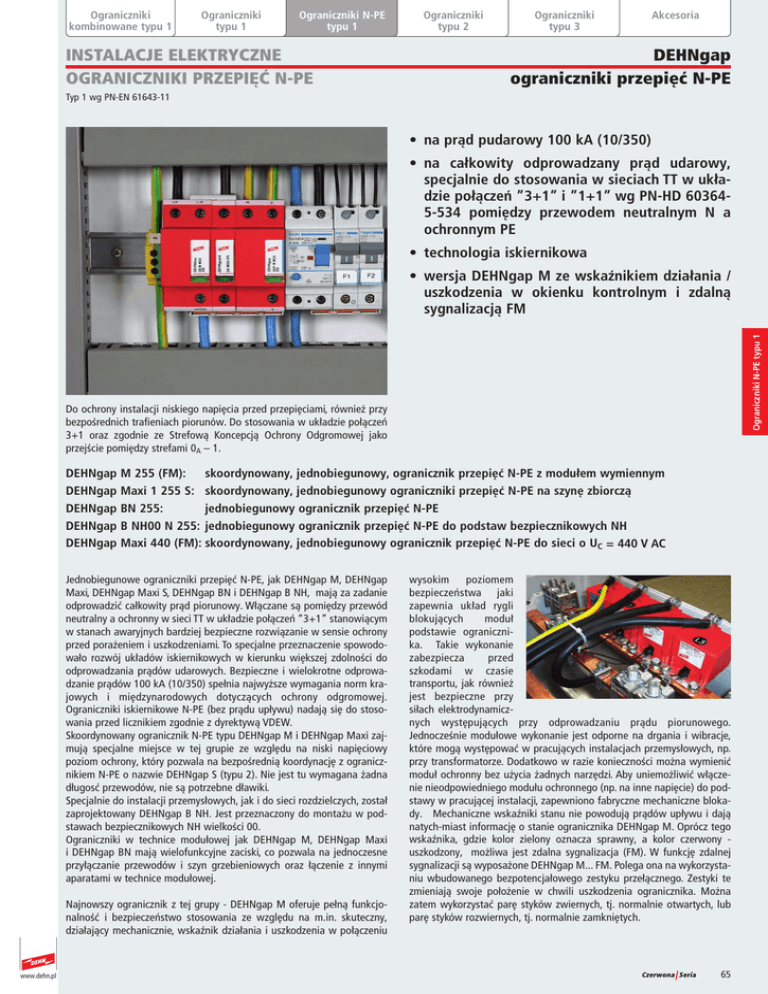 Ograniczniki kombinowane typu 1 Ograniczniki typu 1 Ograniczniki N-PE typu 1 iNstalacjE ElEktryczNE ograNiczNiki PrzEPięć N-PE Ograniczniki typu 2 Ograniczniki typu 3 Akcesoria DEHNgap ograniczniki przepięć N-PE Typ 1 wg PN-EN 61643-11 • na prąd pudarowy 100 kA (10/350) • na całkowity odprowadzany prąd udarowy, specjalnie do stosowania w sieciach TT w układzie połączeń ”3+1” i ”1+1” wg PN-HD 603645-534 pomiędzy przewodem neutralnym N a ochronnym PE • technologia iskiernikowa Ograniczniki N-PE typu 1 • wersja DEHNgap M ze wskaźnikiem działania / uszkodzenia w okienku kontrolnym i zdalną sygnalizacją FM Do ochrony instalacji niskiego napięcia przed przepięciami, również przy bezpośrednich trafieniach piorunów. Do stosowania w układzie połączeń 3+1 oraz zgodnie ze Strefową Koncepcją Ochrony Odgromowej jako przejście pomiędzy strefami 0A – 1. DEHNgap M 255 (FM): skoordynowany, jednobiegunowy, ogranicznik przepięć N-PE z modułem wymiennym DEHNgap Maxi 1 255 S: skoordynowany, jednobiegunowy ograniczniki przepięć N-PE na szynę zbiorczą DEHNgap BN 255: jednobiegunowy ogranicznik przepięć N-PE DEHNgap B NH00 N 255: jednobiegunowy ogranicznik przepięć N-PE do podstaw bezpiecznikowych NH DEHNgap Maxi 440 (FM): skoordynowany, jednobiegunowy ogranicznik przepięć N-PE do sieci o UC = 440 V AC Jednobiegunowe ograniczniki przepięć N-PE, jak DEHNgap M, DEHNgap Maxi, DEHNgap Maxi S, DEHNgap BN i DEHNgap B NH, mają za zadanie odprowadzić całkowity prąd piorunowy. Włączane są pomiędzy przewód neutralny a ochronny w sieci TT w układzie połączeń “3+1” stanowiącym w stanach awaryjnych bardziej bezpieczne rozwiązanie w sensie ochrony przed porażeniem i uszkodzeniami. To specjalne przeznaczenie spowodowało rozwój układów iskiernikowych w kierunku większej zdolności do odprowadzania prądów udarowych. Bezpieczne i wielokrotne odprowadzanie prądów 100 kA (10/350) spełnia najwyższe wymagania norm krajowych i międzynarodowych dotyczących ochrony odgromowej. Ograniczniki iskiernikowe N-PE (bez prądu upływu) nadają się do stosowania przed licznikiem zgodnie z dyrektywą VDEW. Skoordynowany ogranicznik N-PE typu DEHNgap M i DEHNgap Maxi zajmują specjalne miejsce w tej grupie ze względu na niski napięciowy poziom ochrony, który pozwala na bezpośrednią koordynację z ogranicznikiem N-PE o nazwie DEHNgap S (typu 2). Nie jest tu wymagana żadna długosć przewodów, nie są potrzebne dławiki. Specjalnie do instalacji przemysłowych, jak i do sieci rozdzielczych, został zaprojektowany DEHNgap B NH. Jest przeznaczony do montażu w podstawach bezpiecznikowych NH wielkości 00. Ograniczniki w technice modułowej jak DEHNgap M, DEHNgap Maxi i DEHNgap BN mają wielofunkcyjne zaciski, co pozwala na jednoczesne przyłączanie przewodów i szyn grzebieniowych oraz łączenie z innymi aparatami w technice modułowej. Najnowszy ogranicznik z tej grupy - DEHNgap M oferuje pełną funkcjonalność i bezpieczeństwo stosowania ze względu na m.in. skuteczny, działający mechanicznie, wskaźnik działania i uszkodzenia w połączeniu www.dehn.pl wysokim poziomem bezpieczeństwa jaki zapewnia układ rygli blokujących moduł podstawie ogranicznika. Takie wykonanie zabezpiecza przed szkodami w czasie transportu, jak również jest bezpieczne przy siłach elektrodynamicznych występujących przy odprowadzaniu prądu piorunowego. Jednocześnie modułowe wykonanie jest odporne na drgania i wibracje, które mogą występować w pracujących instalacjach przemysłowych, np. przy transformatorze. Dodatkowo w razie konieczności można wymienić moduł ochronny bez użycia żadnych narzędzi. Aby uniemożliwić włączenie nieodpowiedniego modułu ochronnego (np. na inne napięcie) do podstawy w pracującej instalacji, zapewniono fabryczne mechaniczne blokady. Mechaniczne wskaźniki stanu nie powodują prądów upływu i dają natych-miast informację o stanie ogranicznika DEHNgap M. Oprócz tego wskaźnika, gdzie kolor zielony oznacza sprawny, a kolor czerwony uszkodzony, możliwa jest zdalna sygnalizacja (FM). W funkcję zdalnej sygnalizacji są wyposażone DEHNgap M... FM. Polega ona na wykorzystaniu wbudowanego bezpotencjałowego zestyku przełącznego. Zestyki te zmieniają swoje położenie w chwili uszkodzenia ogranicznika. Można zatem wykorzystać parę styków zwiernych, tj. normalnie otwartych, lub parę styków rozwiernych, tj. normalnie zamkniętych. 65 Ograniczniki kombinowane typu 1 Ograniczniki typu 1 Ograniczniki N-PE typu 1 Ograniczniki typu 2 DEHNgap DEHNgap BN 255 Ograniczniki typu 3 Akcesoria iNstalacjE ElEktryczNE ograNiczNiki PrzEPięć N-PE Schemat połączeń DGP BN 255 900 132 255 DGP BN DGP BN 255 B/n DEHNgap 900 132 Rysunek wymiarowy DGP BN 255 Ograniczniki N-PE typu 1 DGP BN 255: jednobiegunowy ogranicznik przepięć N-PE DGP BN 255 Ogranicznik przepięć wg PN-EN 61643-11 Ogranicznik przepięć wg PN-IEC 61643-1 Największe napięcie trwałej pracy AC UC Prąd udarowy (10/350) Iimp Znamionowy prąd wyładowczy (8/20) In Napięciowy poziom ochrony UP Zdolność gaszenia prądu następczego AC Ifi Czas zadziałania tA Przepięcie dorywcze Przepięcia dorywcze - cecha Zakres temperatur pracy TU Wskaźnik działania / uszkodzenia Przekroje przewodów min. Przekroje przewodów maks. Montaż Materiał obudowy Stopień ochrony Szerokość montażowa Dane potrzebne do zamówienia Typ Numer katalogowy Opakowanie jednostkowe 68 Typ 1 Klasa I 255 V 100 kA 100 kA ≤ 4 kV 100 Aeff ≤ 100 ns 1200 V / 200 ms wytrzymały -40°C...+80°C zielony / czerwony 10 mm2 drut / linka 50 mm2 wielodrutowo / 35 mm2 linka na szynie 35 mm wg EN 60715 Thermoplast, kolor czerwony, UL 94 V-0 IP 20 2 moduły TE, DIN 43880 DGP BN 255 900 132 1 szt. www.dehn.pl