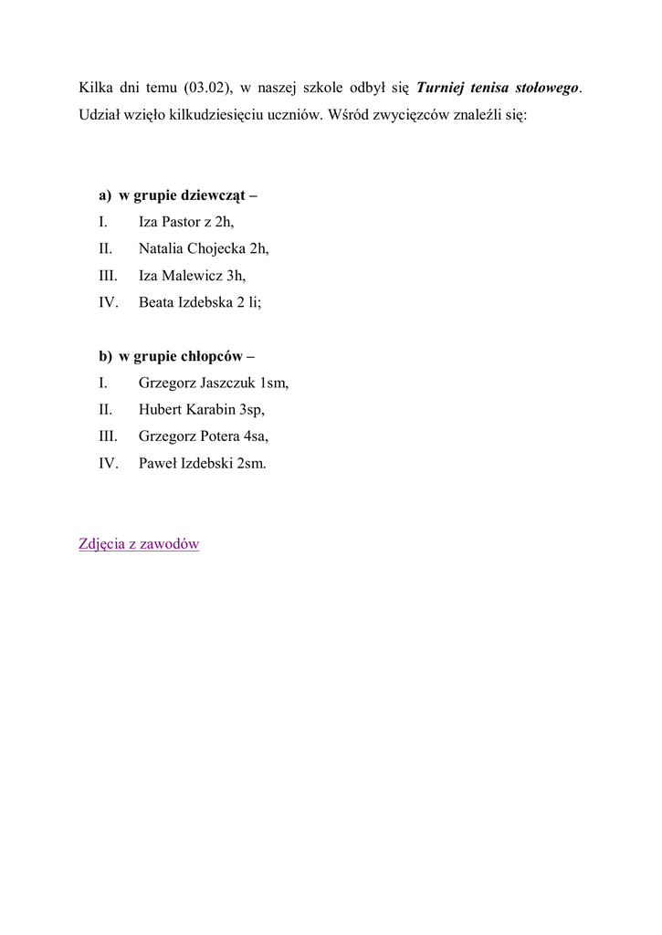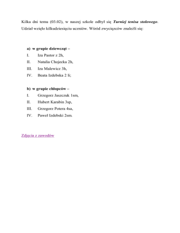 Kilka dni temu (03.02), w naszej szkole odbył się Turniej tenisa stołowego. Udział wzięło kilkudziesięciu uczniów. Wśród zwycięzców znaleźli się: a) w grupie dziewcząt – I. Iza Pastor z 2h, II. Natalia Chojecka 2h, III. Iza Malewicz 3h, IV. Beata Izdebska 2 li; b) w grupie chłopców – I. Grzegorz Jaszczuk 1sm, II. Hubert Karabin 3sp, III. Grzegorz Potera 4sa, IV. Paweł Izdebski 2sm. Zdjęcia z zawodów