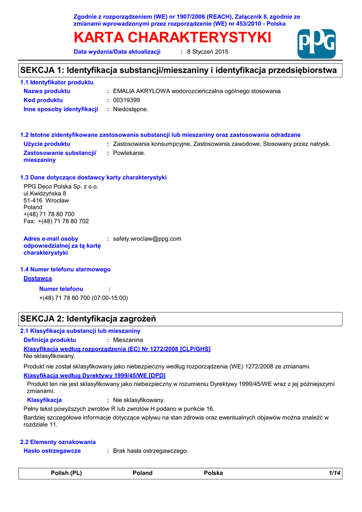 Zgodnie z rozporządzeniem (WE) nr 1907/2006 (REACH), Załącznik II, zgodnie ze zmianami wprowadzonymi przez rozporządzenie (WE) nr 453/2010 - Polska KARTA CHARAKTERYSTYKI Data wydania/Data aktualizacji : 8 Styczeń 2015 SEKCJA 1: Identyfikacja substancji/mieszaniny i identyfikacja przedsiębiorstwa 1.1 Identyfikator produktu Nazwa produktu Kod produktu Inne sposoby identyfikacji : EMALIA AKRYLOWA wodorozcieńczalna ogólnego stosowania : 00319399 : Niedostępne. 1.2 Istotne zidentyfikowane zastosowania substancji lub mieszaniny oraz zastosowania odradzane Użycie produktu : Zastosowania konsumpcyjne, Zastosowania zawodowe, Stosowany przez natrysk. Zastosowanie substancji/ mieszaniny : Powlekanie. 1.3 Dane dotyczące dostawcy karty charakterystyki PPG Deco Polska Sp. z o.o. ul.Kwidzyńska 8 51-416 Wrocław Poland +(48) 71 78 80 700 Fax: +(48) 71 78 80 702 Adres e-mail osoby odpowiedzialnej za tą kartę charakterystyki : [email protected] 1.4 Numer telefonu alarmowego Dostawca Numer telefonu : +(48) 71 78 80 700 (07:00-15:00) SEKCJA 2: Identyfikacja zagrożeń 2.1 Klasyfikacja substancji lub mieszaniny Definicja produktu : Mieszanina Klasyfikacja według rozporządzenia (EC) Nr 1272/2008 [CLP/GHS] Nie sklasyfikowany. Produkt nie został sklasyfikowany jako niebezpieczny według rozporządzenia (WE) 1272/2008 ze zmianami. Klasyfikacja według Dyrektywy 1999/45/WE [DPD] Produkt ten nie jest sklasyfikowany jako niebezpieczny w rozumieniu Dyrektywy 1999/45/WE wraz z jej późniejszymi zmianami. Klasyfikacja : Nie sklasyfikowany. Pełny tekst powyższych zwrotów R lub zwrotów H podano w punkcie 16. Bardziej szczegółowe informacje dotyczące wpływu na stan zdrowia oraz ewentualnych objawów można znaleźć w rozdziale 11. 2.2 Elementy oznakowania Hasło ostrzegawcze Polish (PL) : Brak hasła ostrzegawczego. Poland Polska 1/14 Zgodnie z rozporządzeniem (WE) nr 1907/2006 (REACH), Załącznik II, zgodnie ze zmianami wprowadzonymi przez rozporządzenie (WE) nr 453/2010 - Polska Kod : 00319399 Data wydania/Data aktualizacji EMALIA AKRYLOWA wodorozcieńczalna ogólnego stosowania : 8 Styczeń 2015 SEKCJA 2: Identyfikacja zagrożeń Zwroty wskazujące rodzaj zagrożenia : Brak doniesień o niepożądanych skutkach lub krytycznych zagrożeniach. Zwroty wskazujące środki ostrożności Ogólne : Chronić przed dziećmi. W razie konieczności zasięgnięcia porady lekarza należy pokazać pojemnik lub etykietę. Zapobieganie : Nie dotyczy. Reagowanie : Nie dotyczy. Przechowywanie : Nie dotyczy. Usuwanie : Nie dotyczy. Niebezpieczne składniki : Nie dotyczy. Uzupełniające elementy : Zawiera 1,2-benzoizotiazol-3(2H)-on i mieszanina poreakcyjna 5-chloro-2-metylo-2Hetykiety izotiazol-3-onu [nr WE 247-500-7] i 2-metylo-2H-izotiazol-3-onu [nr WE 220-239-6] (3:1). Może powodować wystąpienie reakcji alergicznej. Ograniczenia dotyczące : Nie dotyczy. produkcji, wprowadzania do obrotu i stosowania niektórych niebezpiecznych substancji, preparatów i wyrobów Specjalne wymagania dotyczące pakowania Pojemniki powinny być : Nie dotyczy. wyposażone w zamknięcia uniemożliwiające otworzenie ich przez dzieci Dotykowe ostrzeżenia : Nie dotyczy. przed niebezpieczeństwem 2.3 Inne zagrożenia Inne zagrożenia nie odzwierciedlone w klasyfikacji : Nie znane. SEKCJA 3: Skład/informacja o składnikach 3.2 Mieszaniny : Mieszanina Nie zawiera innych skladników, które w świetle obecnej wiedzy dostawcy oraz w danym stężeniu są klasyfikowane jako niebezpieczne dla zdrowia lub otoczenia, klasyfikowane są jako PBT lub vPvB, lub którym przypisano ograniczenia co do występowania w środowisku pracy, nie ma więc wymogu wymieniania ich w niniejszym ustępie. Typ [1] Substancja sklasyfikowana jako szkodliwa dla zdrowia lub środowiska [2] Substancja, dla której wyznaczono dopuszczalne stężenie w środowisku pracy [3] Substancja spełnia kryteria dla jej zaklasyfikowania jako PBT zgodnie z Rozporządzeniem (WE) Nr 1907/2006, Aneks XIII [4] Substancja spełnia kryteria dla jej zaklasyfikowania jako vPvB zgodnie z Rozporządzeniem (WE) Nr 1907/2006, Aneks XIII [5] Substancja wywołująca równorzędne obawy Numer SUB przypisano substancjom, które nie posiadają numeru CAS. Polish (PL) Poland Polska 2/14 Zgodnie z rozporządzeniem (WE) nr 1907/2006 (REACH), Załącznik II, zgodnie ze zmianami wprowadzonymi przez rozporządzenie (WE) nr 453/2010 - Polska Kod : 00319399 Data wydania/Data aktualizacji EMALIA AKRYLOWA wodorozcieńczalna ogólnego stosowania : 8 Styczeń 2015 SEKCJA 3: Skład/informacja o składnikach SEKCJA 4: Środki pierwszej pomocy 4.1 Opis środków pierwszej pomocy Kontakt z okiem : Usunąć szkła kontaktowe jeżeli są. Natychmiast przemywać oczy bieżącą wodą, przez co najmniej 15 minut przy otwartych powiekach. Należy natychmiast zwrócić się po pomoc lekarską. Wdychanie : Wynieść na świeże powietrze. Zapewnić osobie ciepło i spokój. Jeżeli osoba nie oddycha, oddycha nieregularnie lub gdy oddychanie ustało, wykwalifikowany personel powinien wykonać sztuczne oddychanie lub podać tlen. Kontakt ze skórą : Zdjąć skażoną odzież i buty. Skórę należy myć dokładnie wodą z mydłem lub stosować sprawdzony środek do mycia skóry. NIE wolno używać rozpuszczalników ani rozcieńczalników. Spożycie Ochrona osób udzielających pierwszej pomocy : Po połknięciu skonsultować się natychmiast z lekarzem i pokazać opakowanie lub etykietę. Zapewnić osobie ciepło i spokój. NIE wywoływać wymiotów. : Nie należy podejmować żadnych działań, które stwarzałyby ryzyko dla kogokolwiek chyba, że jest się odpowiednio przeszkolonym. 4.2 Najważniejsze ostre i opóźnione objawy oraz skutki narażenia Potencjalne ostre działanie na zdrowie Kontakt z okiem : Brak doniesień o niepożądanych skutkach lub krytycznych zagrożeniach. Wdychanie : Brak doniesień o niepożądanych skutkach lub krytycznych zagrożeniach. Kontakt ze skórą : Brak doniesień o niep
