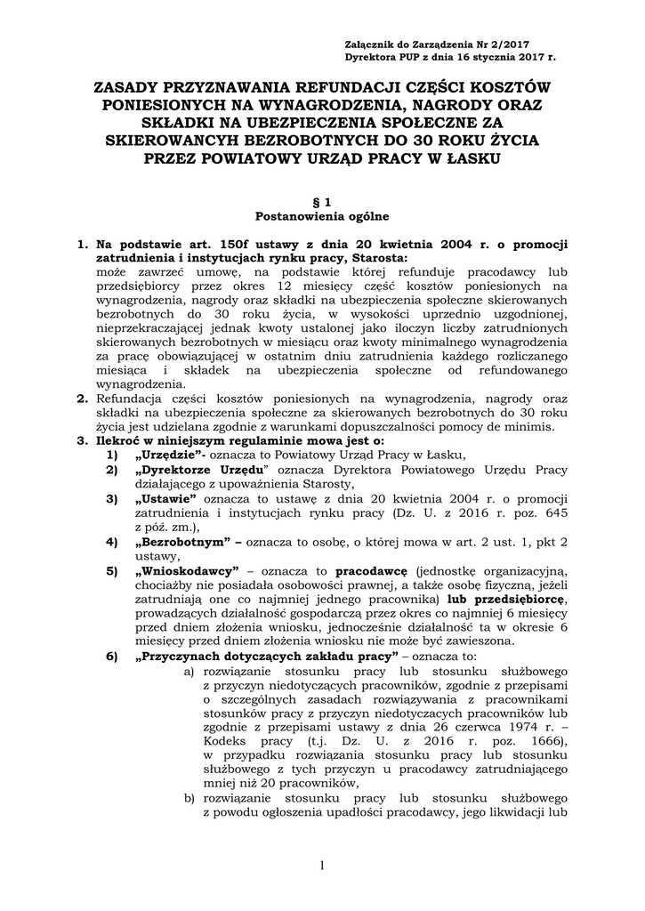 Załącznik do Zarządzenia Nr 2/2017 Dyrektora PUP z dnia 16 stycznia 2017 r. ZASADY PRZYZNAWANIA REFUNDACJI CZĘŚCI KOSZTÓW PONIESIONYCH NA WYNAGRODZENIA, NAGRODY ORAZ SKŁADKI NA UBEZPIECZENIA SPOŁECZNE ZA SKIEROWANCYH BEZROBOTNYCH DO 30 ROKU ŻYCIA PRZEZ POWIATOWY URZĄD PRACY W ŁASKU §1 Postanowienia ogólne 1. Na podstawie art. 150f ustawy z dnia 20 kwietnia 2004 r. o promocji zatrudnienia i instytucjach rynku pracy, Starosta: może zawrzeć umowę, na podstawie której refunduje pracodawcy lub przedsiębiorcy przez okres 12 miesięcy część kosztów poniesionych na wynagrodzenia, nagrody oraz składki na ubezpieczenia społeczne skierowanych bezrobotnych do 30 roku życia, w wysokości uprzednio uzgodnionej, nieprzekraczającej jednak kwoty ustalonej jako iloczyn liczby zatrudnionych skierowanych bezrobotnych w miesiącu oraz kwoty minimalnego wynagrodzenia za pracę obowiązującej w ostatnim dniu zatrudnienia każdego rozliczanego miesiąca i składek na ubezpieczenia społeczne od refundowanego wynagrodzenia. 2. Refundacja części kosztów poniesionych na wynagrodzenia, nagrody oraz składki na ubezpieczenia społeczne za skierowanych bezrobotnych do 30 roku życia jest udzielana zgodnie z warunkami dopuszczalności pomocy de minimis. 3. Ilekroć w niniejszym regulaminie mowa jest o: 1) „Urzędzie”- oznacza to Powiatowy Urząd Pracy w Łasku, 2) „Dyrektorze Urzędu” oznacza Dyrektora Powiatowego Urzędu Pracy działającego z upoważnienia Starosty, 3) „Ustawie” oznacza to ustawę z dnia 20 kwietnia 2004 r. o promocji zatrudnienia i instytucjach rynku pracy (Dz. U. z 2016 r. poz. 645 z póź. zm.), 4) „Bezrobotnym” – oznacza to osobę, o której mowa w art. 2 ust. 1, pkt 2 ustawy, 5) „Wnioskodawcy” – oznacza to pracodawcę (jednostkę organizacyjną, chociażby nie posiadała osobowości prawnej, a także osobę fizyczną, jeżeli zatrudniają one co najmniej jednego pracownika) lub przedsiębiorcę, prowadzących działalność gospodarczą przez okres co najmniej 6 miesięcy przed dniem złożenia wniosku, jednocześnie działalność ta w okresie 6 miesięcy przed dniem złożenia wniosku nie może być zawieszona. 6) „Przyczynach dotyczących zakładu pracy” – oznacza to: a) rozwiązanie stosunku pracy lub stosunku służbowego z przyczyn niedotyczących pracowników, zgodnie z przepisami o szczególnych zasadach rozwiązywania z pracownikami stosunków pracy z przyczyn niedotyczacych pracowników lub zgodnie z przepisami ustawy z dnia 26 czerwca 1974 r. – Kodeks pracy (t.j. Dz. U. z 2016 r. poz. 1666), w przypadku rozwiązania stosunku pracy lub stosunku służbowego z tych przyczyn u pracodawcy zatrudniającego mniej niż 20 pracowników, b) rozwiązanie stosunku pracy lub stosunku służbowego z powodu ogłoszenia upadłości pracodawcy, jego likwidacji lub 1 likwidacji stanowiska pracy z przyczyn ekonomicznych, organizacyjnych, produkcyjnych albo technologicznych, c) wygaśnięcie stosunku pracy lub stosunku służbowego w przypadku śmierci pracodawcy lub gdy odrębne przepisy przewidują wygaśnięcie stosunku pracy lub stosunku służbowego w wyniku przejścia zakładu pracy lub jego części na innego pracodawcę i niezaproponowania przez tego pracodawcę nowych warunków pracy i płacy, d) rozwiązania stosunku pracy przez pracownika na podstawie art. 55 § 11 ustawy z dnia 26 czerwca 1974 r. – Kodeks pracy z uwagi na ciężkie naruszenie podstawowych obowiązków wobec pracownika. §2 Tryb składania i rozpatrywania wniosków 1. Pracodawca lub przedsiębiorca składa wniosek o przyznanie refundacji części kosztów poniesionych na wynagrodzenia oraz składki na ubezpieczenia społeczne za skierowanych bezrobotnych do 30 roku życia do wybranego powiatowego urzędu pracy w terminach ogłoszonych naborów. Wzór „Wniosku o przyznanie refundacji części kosztów poniesionych na wynagrodzenia oraz składki na ubezpieczenia społeczne za skierowanych bezrobotnych do 30 roku życia” stanowi załącznik nr 1 do Zasad. 2. Pracodawca lub przedsiębiorca ubiegający się o przyznanie refundacji, o której mowa w pkt 1 będący beneficjentem pomocy w rozumieniu ustawy z dnia 30 kwietnia 2004 r. o postępowaniu w sprawach dotyczących pomocy publicznej (Dz.U. z 2007 r. nr 59, poz. 404 z póź. zm.) do wniosku o przyznanie refundacji części kosztów poniesionych na wynagrodzenia oraz składki na ubezpieczenia społeczne za skierowanych bezrobotnych do 30 roku życia dołącza informacje, zaświadczenie lub oświadczenie w zakresie, o którym mowa w art. 37 ust.1 i 2 tej ustawy. 3. Refundacja części kosztów poniesionych na wynagrodzenia oraz składki na ubezpieczenia społeczne może być przyznana tylko za skierowanych bezrobotnych do 30 roku życia zatrudnionych w pełnym wymiarze czasu pracy. 4. W odniesieniu do jednostek samorządowych refundacja części kosztów poniesionych na wynagrodzenia oraz składki na ubezpieczenia społeczne za skierowanych bezrobotnych do 30 roku życia może być przyznana gdy są spełnione jednocześnie 3 warunki: a) stanowisko pracy jest nieurzędnicze, b) stanowisko pracy jest nowo tworzone, c) istnieje szansa, iż stanowisko pracy zostanie utrzymane po upływie trwania umowy. 5. Refundacja części kosztów poniesionych na wynagrodzenia oraz składki na ubezpieczenia społeczne za skierowanych bezrobotnych do 30 roku życia nie może być przyznana pracodawcy lub przedsiębiorcy, który: a) w okresie ostatnich 6 miesięcy przed złożeniem wniosku zmniejszył zatrudnienie z przyczyn dotyczących zakładu pracy, lub b) zalega z wypłacaniem w terminie wynagrodzeń pracownikom oraz z opłacaniem w terminie składek na ubezpieczenie społeczne, zdrowotne, Fundusz Pracy oraz Fundusz Gwarantowanych Świadczeń Pracowniczych oraz innych danin publicznych, lub c) posiada w dniu złożenia wniosku nieuregulowane w terminie zobowiązania cywilnoprawne. 2 6. Refundacja części kosztów poniesionyc