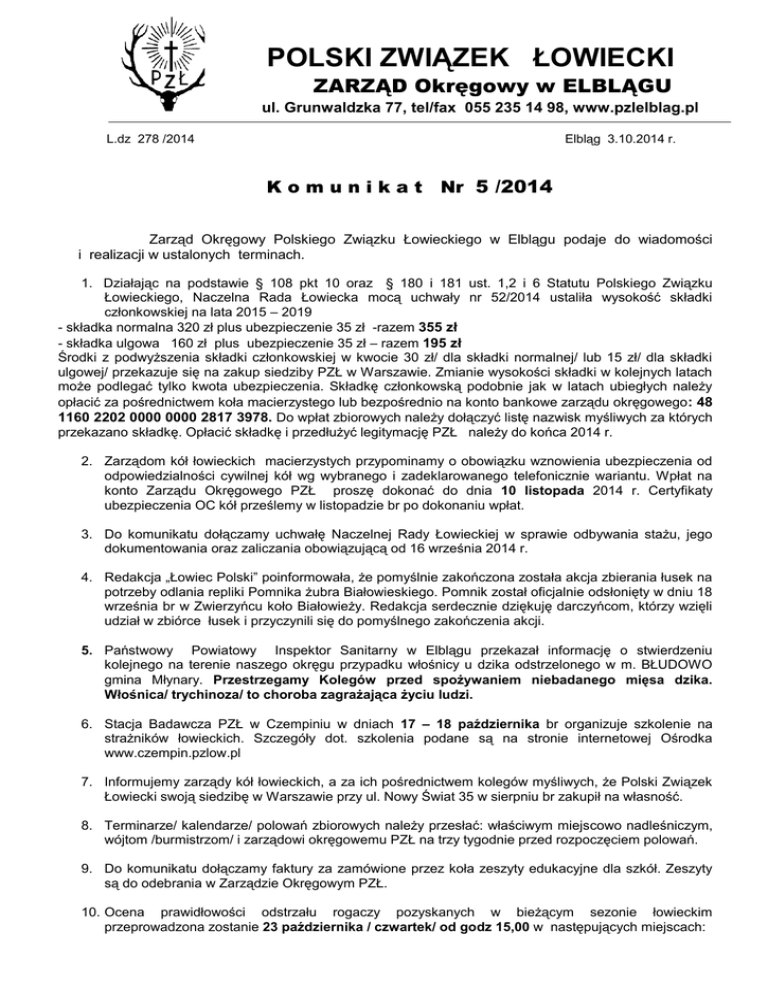 POLSKI ZWIĄZEK ŁOWIECKI ZARZĄD Okręgowy w ELBLĄGU ul. Grunwaldzka 77, tel/fax 055 235 14 98, www.pzlelblag.pl Elbląg 3.10.2014 r. L.dz 278 /2014 K o m u n i k a t Nr 5 /2014 Zarząd Okręgowy Polskiego Związku Łowieckiego w Elblągu podaje do wiadomości i realizacji w ustalonych terminach. 1. Działając na podstawie § 108 pkt 10 oraz § 180 i 181 ust. 1,2 i 6 Statutu Polskiego Związku Łowieckiego, Naczelna Rada Łowiecka mocą uchwały nr 52/2014 ustaliła wysokość składki członkowskiej na lata 2015 – 2019 - składka normalna 320 zł plus ubezpieczenie 35 zł -razem 355 zł - składka ulgowa 160 zł plus ubezpieczenie 35 zł – razem 195 zł Środki z podwyższenia składki członkowskiej w kwocie 30 zł/ dla składki normalnej/ lub 15 zł/ dla składki ulgowej/ przekazuje się na zakup siedziby PZŁ w Warszawie. Zmianie wysokości składki w kolejnych latach może podlegać tylko kwota ubezpieczenia. Składkę członkowską podobnie jak w latach ubiegłych należy opłacić za pośrednictwem koła macierzystego lub bezpośrednio na konto bankowe zarządu okręgowego : 48 1160 2202 0000 0000 2817 3978. Do wpłat zbiorowych należy dołączyć listę nazwisk myśliwych za których przekazano składkę. Opłacić składkę i przedłużyć legitymację PZŁ należy do końca 2014 r. 2. Zarządom kół łowieckich macierzystych przypominamy o obowiązku wznowienia ubezpieczenia od odpowiedzialności cywilnej kół wg wybranego i zadeklarowanego telefonicznie wariantu. Wpłat na konto Zarządu Okręgowego PZŁ proszę dokonać do dnia 10 listopada 2014 r. Certyfikaty ubezpieczenia OC kół prześlemy w listopadzie br po dokonaniu wpłat. 3. Do komunikatu dołączamy uchwałę Naczelnej Rady Łowieckiej w sprawie odbywania stażu, jego dokumentowania oraz zaliczania obowiązującą od 16 września 2014 r. 4. Redakcja „Łowiec Polski” poinformowała, że pomyślnie zakończona została akcja zbierania łusek na potrzeby odlania repliki Pomnika żubra Białowieskiego. Pomnik został oficjalnie odsłonięty w dniu 18 września br w Zwierzyńcu koło Białowieży. Redakcja serdecznie dziękuję darczyńcom, którzy wzięli udział w zbiórce łusek i przyczynili się do pomyślnego zakończenia akcji. 5. Państwowy Powiatowy Inspektor Sanitarny w Elblągu przekazał informację o stwierdzeniu kolejnego na terenie naszego okręgu przypadku włośnicy u dzika odstrzelonego w m. BŁUDOWO gmina Młynary. Przestrzegamy Kolegów przed spożywaniem niebadanego mięsa dzika. Włośnica/ trychinoza/ to choroba zagrażająca życiu ludzi. 6. Stacja Badawcza PZŁ w Czempiniu w dniach 17 – 18 października br organizuje szkolenie na strażników łowieckich. Szczegóły dot. szkolenia podane są na stronie internetowej Ośrodka www.czempin.pzlow.pl 7. Informujemy zarządy kół łowieckich, a za ich pośrednictwem kolegów myśliwych, że Polski Związek Łowiecki swoją siedzibę w Warszawie przy ul. Nowy Świat 35 w sierpniu br zakupił na własność. 8. Terminarze/ kalendarze/ polowań zbiorowych należy przesłać: właściwym miejscowo nadleśniczym, wójtom /burmistrzom/ i zarządowi okręgowemu PZŁ na trzy tygodnie przed rozpoczęciem polowań. 9. Do komunikatu dołączamy faktury za zamówione przez koła zeszyty edukacyjne dla szkół. Zeszyty są do odebrania w Zarządzie Okręgowym PZŁ. 10. Ocena prawidłowości odstrzału rogaczy pozyskanych w bieżącym sezonie łowieckim przeprowadzona zostanie 23 października / czwartek/ od godz 15,00 w następujących miejscach: a/ w BRANIEWIE w sali hotelu Kristal ul. Skośna oceniane będą parostki rogaczy pozyskanych na terenie elbląskiego okręgu PZŁ z rejonów Nadleśnictwa Zaporowo i Nadleśnictwa Orneta przez komisje w składzie: przewodniczący Jan Hryniewicz, członkowie kol.kol. Wiesław Podsiadły,Józef Grabowski, Kazimierz Gawron ,przedstawiciel Nadleśnictwa Zaporowo, asystenci kol. kol. Stanisław Wszołek i Cezary Rant. Organizator KŁ Mewa” b/ w MŁYNARACH w siedzibie Nadleśnictwa Młynary ul. 1 Maja 21 oceniane będą parostki rogaczy pozyskanych na terenie elbląskiego okręgu PZŁ z rejonów Nadleśnictwa Młynary i Nadleśnictwa Dobrocin przez komisję w składzie przewodniczący kol. Zdzisław Rutkowski, członkowie kol.kol. Tadeusz Rudziński,Jerzy .Chodara,Jan Kantypowicz,przedstawiciel Nadleśnictwa Młynary, asystenci kol.kol. Zenon Ficak i Grzegorz Orłowski. Organizator KŁ „BÓBR.” c/ w BROKOWIE w siedzibie KŁ „BIZON” oceniane będą parostki rogaczy pozyskanych na terenie elbląskiego okręgu PZŁ z rejonu Nadleśnictwa Kwidzyn i Nadleśnictwa Susz przez Komisję w składzie: przewodniczący kol. Marian Przybyła, członkowie kol.kol. Stanisław Mikołajków, Roman Markowicz,Tomasz Janiuk,przedstawiciel Nadleśnictwa Kwidzyn, asystenci kol.kol. Jacek Grzebisz i Jerzy Czubiński. Organizator KŁ 'BIZON”. d/ w ELBLAGU w siedzibie WKŁ „ODYNIEC” ul. Strumykowa 16 oceniane będą parostki rogaczy pozyskanych na terenie Nadleśnictwa Elbląg przez Komisję w składzie: przewodniczący kol. Zbigniew Trzaska, członkowie kol.kol. Zbigniew Grudziński, Marek Goerick, Wieńczysław Tylkowski,przedstawiciel Nadleśnictwa Elbląg, asystenci: kol.kol. Piotr Kubera i Stanisław Górka. Organizator WKŁ „ODYNIEC” Do komunikatu dołączamy wzór arkusza oceny, który należy wypełnić czytelnie/ rubryki 1 – 6/, oddzielnie na każdy obwód łowiecki i przekazać komisji przed oceną. Dla ułatwienia pracy komisji do każdego trofeum dołączyć metryczkę z danymi: imię i nazwisko myśliwego, data odstrzału, nr obwodu łowieckiego, waga tuszy rogacza. Ocena prawidłowości odstrzału przeprowadzona zostanie zgodnie z uchwałą nr 54/2014 Naczelnej Rady łowieckiej z dnia 16 września 2014 r 11. Koła łowieckie zainteresowane reintrodukcją kuropatw mogą zakupić do zasiedleń osobniki wyhodowane w Rajkowach k. /Tczewa. Dla kół dzierżawiących obwody na terenie woj.pomorskiego istnie