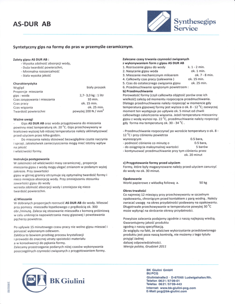 Synthesegiips Serrrice AS-DUR AB Syntetyczny gips na formy do pras w przemyśIe ceramicznym. Zalecane czasy trwania czynności związanych z wykonywaniem form z gipsu AS DUR AB k. 1 - 2 min. ].. Rozrzucenie gipsu do ok. 1 min, 2. Nasycanie gipsu ok. 7 - 8 min. 3. Mieszanie mechanicznym ok. 15 min, 4. Całkowity czas pracy (zalewania ok. 25 min. 5, Czas do ostatecznego związania 6. Przedmuchiwanie sprężonym powietrzem : Zalety gipsu AS DUR AB : - Wysoka zdolnośćabsorpcji wody, - Duża twardośćpowierzchni, - Minimalna rozszerzalność - Stała wysoka jakość wody woda mikserem ) gipsu Charakterystyka biały proszek WygIąd Proporcje mieszania gips : woda Czas zasypywania i mieszania Czas pracy Czas wiązania Twardośćpowierzchni b) 2,7-3,0 kg:1_ litr 10 min. ok. 15 min. ok, 25 min. powyżej2O0N/mm2 Ważne uwagi - Gips As DUR AB oraz woda przygotowana do mieszania oC. powinny mieć temperaturę ok, 20 Gips przechowywany w krańcowo wyższej lub niższej temperaturze należy aklimatyzować przed użyciem przez kilka godzin, - Do mieszania należy stosować bezwzględnie czyste naczynia i sprzęt. Jakiekolwiek zanieczyszczenia mogą mieć istotny wpływ na jakość formy. i właściwości lnstrukcja postępowania masy ceramicznej , proporcje W zależnościod właściwości mieszania gipsu z wodą mogą ulegać zmianom w podanym wyżej zakresie. Przy zawartości gipsu w górnej granicy otrzymuje się optymaIną twardośćformy i nieco mniejsza absorpcję wody. Przy zmniejszaniu stosunku zawartości gipsu do wody wzrasta zdolnośćabsorpcji wody i zmniejsza się nieco twa rdośćpowierzchni, Przedmuchiwanie Porowatość formy (czyli całkowita objętośćporów oraz ich wielkość)zależą od momentu rozpoczęcia przedmuchiwania. Dlatego przedmuchiwanie należy rozpocząć w momencie gdy oC; zazwyczaj temperatura gipsowej formy jest wyższa o ok, 8 - 12 moment ten Występuje po upływie ok, 5 minut od chwili całkowitego zakończenia wiązania. Jeżeli temperatura mieszaniny gipsu z wodą wynosi np. 22oC, przedmuchiwanie należy rozpocząć oC gdy forma ma temperaturę ok, 30 - 34 . - Przedmuchiwanie rozpoczynać po wzroście temperatury o ok. 8 - 72'Ci przy ciśnieniu powietrza 0.5 bara, wynoszącym - podnosić ciśnienie co minutę o 0,5 bara, - do osiągnięcia maksymalnej wartości 5 barów - kontynuować przedmuchiwanie przy tym ciśnieniu przez ok. 20 minut formy przed użyciem Formy, które były magazynowane należy przed użyciem zanurzyć do wody na ok. 30 minut, c) Przygotowanie Opakowanie Worki papierowe z wkładką foliową a. 50 kg okres trwałości a) Mieszanie W dobranych proporcjach rozrzucić AS DUR AB do wody, Mieszać przy pomocy mieszadła łopatkowego z prędkościąok. 300 obr,/minutę, Zaleca się stosowanie mieszadła z komorą próżniową w celu uniknięcia napowietrzania masy gipsowej i powstawania pęcherzy powietrza. Co najmniej 12 miesięcy przy przechowywaniu w szczelnym opakowaniu, chroniącym przed kontaktem z parą wodną,. Należy zwracać uwagę na okres przydatności podawany na opakowaniu. 0C Długotrwałe przechowywanie w temperaturze powyżej 30 może wpłynąć na skrócenie okresy przydatności, Powyższe zalecenia podajemy zgodnie z naszą najlepszą wiedzą. Gwa rantujemy ja kośćprodu ktu Po upływie 15 minutowego czasu pracy nie wolno gipsu mieszać poruszać wykonanym odlewem. Zakłoca to bowiem przebieg procesu krystalizacji i prowadzi do znacznej utraty spoistości materiału a w konsekwencji do pękania formy. Zalecamy przestrzeganie podanych niżej czasów wykonywania poszczególnych czynnościzwiązanych z przygotowaniem formy, i zgodną z naszą specyfikacją. Ze względu na fakt, że właściwewykorzystanie przedstawionego produktu jest poza naszą kontrolą, nie możemy z tego tytułu przyjąć żadnej dalszej odpowiedzialności. Wersja polska, Grudzień 2011 BK Giulini GmbH BUPcG tJJ oO O N o o @BKGiulini GiulinistraRe2 . D-67065 Ludwigshafen/Rh. Telefon 0621 /5709-01 Telefax 062115709-443 lnternet: www.bk-giulini-pcg.com E-Mai!: [email protected]