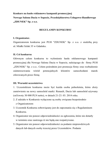 Konkurs na hasło reklamowe kampanii promocyjnej Nowego Salonu Dacia w Sopocie, Przedsiębiorstwa Usługowo-Handlowego „ZDUNEK” Sp. z o.o. REGULAMIN KONKURSU I. Organizator. Organizatorem konkursu jest PUH "ZDUNEK" Sp. z o.o. z siedzibą przy ul. Miałki Szlak 35 w Gdańsku. II. Cel konkursu Głównym celem konkursu to wyłonienie hasła reklamowego kampanii promocyjnej dla Nowego Salonu Dacia w Sopocie, należącego do firmy PUH „ZDUNEK” Sp. z o.o.. Celem pośrednim jest promocja firmy oraz rozbudzenie zainteresowania wśród potencjalnych klientów samochodami marek oferowanych przez firmę. III. Warunki uczestnictwa 1. Uczestnikiem konkursu może być każda osoba pełnoletnia, która złoży zamówienie na nowy samochód marki: Renault, Dacia lub samochód używany (od kwoty 30 000 PLN netto), w dniach 21-23. 03. 2014 roku. 2. Z udziału w Konkursie wyłączone są osoby związane bezpośrednio z Organizatorem 3. Uczestnik Konkursu zobowiązany jest do zapoznania się z Regulaminem Konkursu. 4. Organizator nie ponosi odpowiedzialności za zgłoszenia, które nie dotarły w terminie oraz zastrzega iż nie będą one rozpatrywane. 5. Organizator nie ponosi odpowiedzialności za podanie nieprawdziwych danych lub danych osoby trzeciej przez Uczestników. Podanie nieprawdziwych danych skutkuje odebraniem prawa do nagrody. 6. Udział w Konkursie jest bezpłatny. IV. Zasady konkursu. 1. Hasło konkursowe należy wypełnić na specjalnie przygotowanym do tego celu formularzu, który będzie dostępny w salonie Dacia Zdunek w Sopocie w czasie trwania konkursu oraz na stronie internetowej organizatora pod adresem: www.renault.zdunek.pl oraz www.dacia.zdunek.pl 2. Jeden uczestnik konkursu ma prawo przesłać nieograniczoną liczbę haseł konkursowych. 3. Zgłoszenie hasła do Konkursu jest równoznaczne z oświadczeniem Uczestnika, że przysługują mu nieograniczone autorskie prawa osobiste i majątkowe do przedmiotu konkursu i że ponosi on wszelką odpowiedzialność za złamanie tych praw. 4. Zgłoszenie hasła do Konkursu jest równoznaczne z udzieleniem przez Uczestnika zgody na prezentowanie zgłoszonych haseł w mediach oraz w internecie. 5. Konkurs jest moderowany przez Organizatora. Moderacja w Konkursie polega na prawie Organizatora do niedopuszczeniu do konkursu, bez konieczności poinformowania o tym Uczestnika, haseł, które: a) narusza prawo obowiązujące w Polsce, b) narusza prawa i uczucia osób trzecich, c) zawiera treści powszechnie uznane za społecznie niewłaściwe i naganne moralnie (np. hasła zawierające treści obraźliwe, wulgarne, obsceniczne, nawołujące do nienawiści i przemocy), d) zawiera treści o charakterze komercyjnym (reklamy), e) narusza inne postanowienia zawarte w Regulaminie Konkursu. 6. Uczestnik ma prawo wycofać zgłoszone hasło wyłącznie w czasie trwania Konkursu. V. Rozstrzygnięcie konkursu i nagrody. 1. Pierwszy etap konkursu dokonywany będzie przez komisję powołaną przez Organizatora, z których to komisja wybierze 3 najlepsze hasła. Zwycięskie hasło zostanie wyłonione poprzez największą liczbę oklasków gości przebywających w salonie Dacia w Sopocie pod adresem Aleja Niepodległości 940, w dniu rozstrzygnięcia konkursu. 2. Rozstrzygnięcie konkursu nastąpi w dniu :23.03.2014 roku o godzinie 16:00. 3. W konkursie zostanie przyznana następująca nagroda: Samochód osobowy marki Dacia. 4. Nagrody w Konkursie nie można zamienić na inną nagrodę, ani na ekwiwalent pieniężny. 5. Zwycięzca Konkursu nie może przenieść prawa do otrzymania nagrody na osoby trzecie. 6. Zwycięzca konkursu wyraża zgodę na opłacenie podatku od wygranej, w wysokości 10 % wartości samochodu. 7. Nagroda przepada jeżeli, zwycięzca wycofa się z wcześniej złożonego zamówienia. W takim wypadku nagroda trafi do kolejnej osoby, która zdobyła największą liczbę punktów przyznaną w półfinale przez komisję konkursową. 8.Warunkiem odbiory nagrody jest odbiór zamówionego samochodu. VI. Postanowienia końcowe. 1.Organizator zastrzega sobie prawo do nieodpłatnego wykorzystania nadesłanych haseł reklamowych: w prasie, w telewizji, w internecie, w katalogach, w informatorach, na plakatach, itp. w celach promocji konkursu. 2. Regulamin znajduje się do wglądu w siedzibie Organizatora konkursu firmy PUH "ZDUNEK" Sp. z o.o. w Gdańsku oraz na jej stronie internetowej: www.zdunek.pl. 3. Złamanie ustaleń regulaminu Konkursu przez Uczestnika będzie oznaczało jego wykluczenie z uczestnictwa w Konkursie. 4. W sprawach nie uregulowanych niniejszym Regulaminem zastosowanie znajdą odpowiednie przepisy Kodeksu Cywilnego. 5. Nadesłane na Konkurs dane osobowe uczestników mogą być przetwarzane przez Organizatora wyłącznie w celu wykonania ich obowiązków związanych z Konkursem oraz w celach informacyjno-marketingowych Organizatora. Dane będą chronione zgodnie z Ustawą o Ochronie Danych Osobowych (Dz. U. Nr 133/97, poz. 883 z późn. zm.) Uczestnikom Konkursu przysługuje prawo dostępu do treści swoich danych oraz ich poprawiania. Organizator: PUH "ZDUNEK" Sp. z o.o. ul. Miałki Szlak 35 80-717 Gdańsk www.zdunek.pl