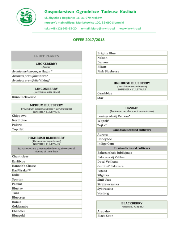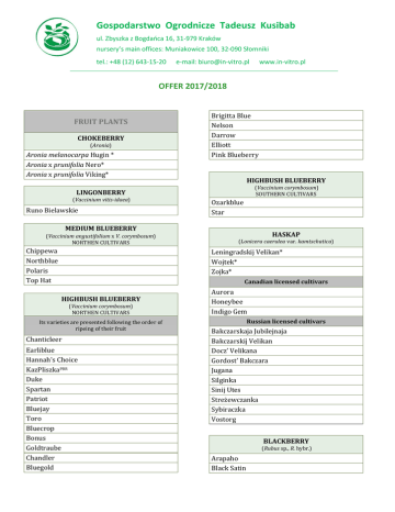 Gospodarstwo Ogrodnicze Tadeusz Kusibab ul. Zbyszka z Bogdańca 16, 31-979 Kraków nursery’s main offices: Muniakowice 100, 32-090 Słomniki tel.: +48 (12) 643-15-20 e-mail: [email protected] www.in-vitro.pl OFFER 2017/2018 FRUIT PLANTS CHOKEBERRY (Aronia) Aronia melanocarpa Hugin * Aronia x prunifolia Nero* Aronia x prunifolia Viking* Brigitta Blue Nelson Darrow Elliott Pink Blueberry HIGHBUSH BLUEBERRY (Vaccinium corymbosum) SOUTHERN CULTIVARS LINGONBERRY (Vaccinium vitis-idaea) Runo Bielawskie Ozarkblue Star MEDIUM BLUEBERRY (Vaccinium angustifolium x V. corymbosum) NORTHEN CULTIVARS Chippewa Northblue Polaris Top Hat HASKAP (Lonicera caerulea var. kamtschatica) Leningradskij Velikan* Wojtek* Zojka* Canadian licensed cultivars HIGHBUSH BLUEBERRY (Vaccinium corymbosum) NORTHEN CULTIVARS Its varieties are presented following the order of ripeing of their fruit Chanticleer Earliblue Hannah's Choice KazPliszkaPBR Duke Spartan Patriot Bluejay Toro Bluecrop Bonus Goldtraube Chandler Bluegold Aurora Honeybee Indigo Gem Russian licensed cultivars Bakczarskaja Jubilejnaja Bakczarskij Velikan Docz’ Velikana Gordost’ Bakczara Jugana Silginka Sinij Utes Streżewczanka Sybiraczka Vostorg BLACKBERRY (Rubus sp., R. hybr.) Arapaho Black Satin Chester Loch Ness Triple Crown Mc Farlin Pilgrim Stevens Protected cultivars BrzezinaPBR PolarPBR PrimeArk®45 ReubenPBR ORNAMENTAL PLANTS AZALEA (Azalea) white RASPBERRY (Rubus idaeus) Bristol Polana Tulameen Protected cultivars ErikaPBR LaszkaPBR PolkaPBR RadziejowaPBR SokolicaPBR TadmorPBR Arima Northern Hi Lights (R. x atlanticum) Oxydol Schneegold Silver Slipper White Lights (R. prinophyllum) yellow TAYBERRY (Rubus hybr.) Buckingham Tayberry STRAWBERRY-RASPBERRY (Rubus) Rubus illecebrosus SASKATOON (Amelanchier alnifolia) Honeywood Krasnojarskaja Mandam Martin Northline Prince William Sleyt Smokey Thiessen Anneke Christopher Wren Csárdás Golden Lights (R. x prinophyllum) Goldtopas Klondyke Limetta Windsor Sunbeam Yellow Pom Pom orange Apricot Arneson's Gem Gibraltar Glowing Embers Mandarin Lights (R. x prinophyllum) pink Cannon's Double Cecile Homebush Juanita Kilian Pink Delight Rosy Lights (R. x prinophyllum) Sarina Western Lights (R. x prinophyllum) red CRANBERRY (Vaccinium macrocarpon) Ben Lear Early Black Howes Crosswater Red Feuerköpfchen Feuerwerk Fireball Nabucco Parkfeuer RHODODENDRON (Rhododendron) LILAC (Syringa vulgaris) Charles Joly* Excellent* Hortensja* Katherine Havemeyer* Krasavitsa Moskvy (Beauty of Moscow) * Lebioduszka* Michel Buchner* Miss Ellen Willmott* Mme Lemoine * Pamięć o Kolesnikowie * Pamięć o Wawiłowie * Primrose* Rochester * Sensation* Znamaya Lenina (Lenin’s Banners) * MOUNTAIN LAUREL (Kalmia latifolia) Bandeau Beacon (Leuchtfeuer) Black Label Bumblebee Elf Ewa Ginkona Hania Ideal Jan’s Delight Kaleidoscope Kardinal Keepsake Latchmin Minuet Mitternacht (Midnight) Nani Peppermint Pinkobello Radiata Tad Tofka Vanilla Cream Zebulon white Calsap Catawbiense Album Cunningham’s White Gartendirektor Rieger (R. williamsianum) Hachmann’s Picobello® EU Polonez ChopinaPBR yellow and orange Flautando FryderykPBR George SandPBR Goldbukett Percy Wiseman (R. yakushimanum) pink Arkadius Catharine van Tol Cherry Cheesecake Claudius (R. williamsianum) Danuta Hachmann’s Charmant Hania P.J.M. Elite (R. carolinianum) Pearce’s American Beauty Roseum Elegans red Andantino Cherry Kiss® EU Dotella Kranenball Nova Zembla Red Jack Scarlet Wonder (R. repens) violet Alfred Blurettia (R. yakushimanum) Catawbiense Grandiflorum Kali Polarnacht Rasputin * - while stock lasts updated on: 2017.01.09 Our seedlings are offered only in bulk buying, in the following sizes and quantities: • in Styrofoam M-90 plugtray – size: 31 cm x 53 cm x 4.5 cm – 90 plants from cultivar in each – plant height 4–8 cm – many cultivars already nicely branched (blueberry branched at its base); • in Styrofoam M-84 plugtray – size: 31 cm x 53 cm x 8 cm – 84 plants from cultivar in each; • in Styrofoam M-60 plugtray – size: 31 cm x 52 cm x 7 cm – 60 plants from cultivar in each; • in Styrofoam M-40 plugtray – size: 30 cm x 50 cm x11,5 cm – 40 plants from cultivar in each; • in p9 pots. DISCOUNTS (price reductions) are granted in the following cases: • 2% off the net price to customers who buy plants in our company for the consecutive season; • 3% off the net price on one-time orders above 3 000 plants; • 5% off the net price on one-time orders above 5 000 plants; • 7% off the net price on one-time orders above 10 000 plants; Prices of protected and patented varieties are not subject to discounts. The date of the collection must be confirmed to fulfill the order! The plants ordered can be collected solely at the following address: Muniakowice 100 32-090 Słomniki