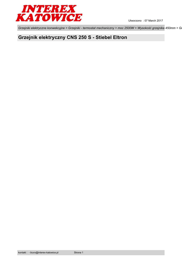 Utworzono : 07 March 2017 Grzejniki elektryczne konwekcyjne > Grzejniki - termostat mechaniczny > moc 2500W > Wysokość grzejnika 450mm > Gr Grzejnik elektryczny CNS 250 S - Stiebel Eltron kontakt : - [email protected] Strona 1 Utworzono : 07 March 2017 Grzejniki elektryczne konwekcyjne > Grzejniki - termostat mechaniczny > moc 2500W > Wysokość grzejnika 450mm > Gr Grzejnik elektryczny CNS 250 S - Stiebel Eltron Model : 220723 Grzejnik elektryczny CNS 250 S - Stiebel Eltron Producent : Stiebel Eltron Standardowe grzejniki CNS ogrzewają pomieszczenia poprzez naturalną konwekcję. Charakteryzują się cichą i równomierną pracą. dodatkowo polecamy sterowanie ogrzewaniem elektrycznym przez internet z montażem lub� przy zakupie - wsparciem technicznym -�polecam z doświadczenia Mariusz Czapnik Schemat instalacji elektrycznej sterowania grzejnikami elektrycznym poprzez radiowy programowalny termostat � Wybrane elementy techniczne serii CNS ... S - Rurkowe elementy grzewcze z wysokiej jakości stali stopowej z płytkami aluminiowymi gwarantują długą żywotność - Zabezpieczenie przed przegrzaniem dzięki wbudowanemu bezpiecznikowi temperaturowemu - Płynna regulacja temperatury i optymalna łatwość obsługi - Posiadają zabezpieczenie przeciwmrozowe. - Kabel zasilający z wtyczką Poniżej przedstawiamy pełny zakres serii:� Dane techniczne: Moc (kW): 2,5 Napięcie zasilania(V): 230 Wysokość (cm): 45,0 Szerokość (cm): 89,0 Głębokość (cm): 10,0 Instrukcja montażu i obsługi grzejnika elektrycznego CNS 250 S Cena : 578,10 zł Brutto ( 470,00 zł kontakt : - [email protected] Strona 2 Utworzono : 07 March 2017 Grzejniki elektryczne konwekcyjne > Grzejniki - termostat mechaniczny > moc 2500W > Wysokość grzejnika 450mm > Gr Grzejnik elektryczny CNS 250 S - Stiebel Eltron Netto) Cena promocyjna : 398,89 zł Brutto ( 324,30 zł Netto) Dostępność: Produkt dostępny w naszym sklepie od 21 December 2008 kontakt : - [email protected] Strona 3
