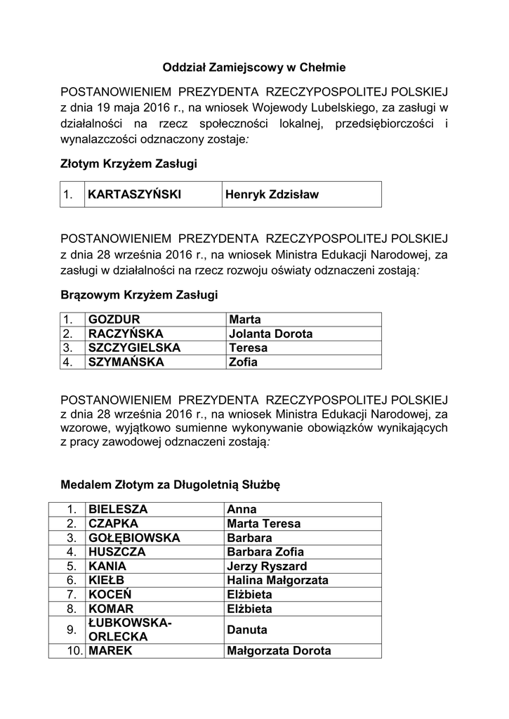 Oddział Zamiejscowy w Chełmie POSTANOWIENIEM PREZYDENTA RZECZYPOSPOLITEJ POLSKIEJ z dnia 19 maja 2016 r., na wniosek Wojewody Lubelskiego, za zasługi w działalności na rzecz społeczności lokalnej, przedsiębiorczości i wynalazczości odznaczony zostaje: Złotym Krzyżem Zasługi 1. KARTASZYŃSKI Henryk Zdzisław POSTANOWIENIEM PREZYDENTA RZECZYPOSPOLITEJ POLSKIEJ z dnia 28 września 2016 r., na wniosek Ministra Edukacji Narodowej, za zasługi w działalności na rzecz rozwoju oświaty odznaczeni zostają: Brązowym Krzyżem Zasługi 1. 2. 3. 4. GOZDUR RACZYŃSKA SZCZYGIELSKA SZYMAŃSKA Marta Jolanta Dorota Teresa Zofia POSTANOWIENIEM PREZYDENTA RZECZYPOSPOLITEJ POLSKIEJ z dnia 28 września 2016 r., na wniosek Ministra Edukacji Narodowej, za wzorowe, wyjątkowo sumienne wykonywanie obowiązków wynikających z pracy zawodowej odznaczeni zostają: Medalem Złotym za Długoletnią Służbę 1. 2. 3. 4. 5. 6. 7. 8. BIELESZA CZAPKA GOŁĘBIOWSKA HUSZCZA KANIA KIEŁB KOCEŃ KOMAR ŁUBKOWSKA9. ORLECKA 10. MAREK Anna Marta Teresa Barbara Barbara Zofia Jerzy Ryszard Halina Małgorzata Elżbieta Elżbieta Danuta Małgorzata Dorota 11. 12. 13. 14. 15. 16. 17. 18. MOZEL OLEJNICZAK RACZYŃSKA RUDNICKA SAJ-GILEWSKA SKIBA SOBAŃSKA ZAWISTOWSKA Małgorzata Krzysztof Grzegorz Elżbieta Barbara Ewa Elżbieta Henryka Alicja Halina Lucyna Mirosława Medalem Srebrnym za Długoletnią Służbę 1. ADAMCZYK BRZEZOWSKA2. LUBAWSKA 3. BUCZEK 4. CICHOSZ 5. ĆWIKŁA 6. JABŁOŃSKI 7. JONAK 8. JONIK 9. KIEJDA 10. KOŁOSIŃSKI 11. KURZĘPA 12. LIPCZYŃSKA 13. ŁANIEWSKA 14. MARCZEWSKI 15. MARTYNIUK 16. NOWOSADZKI PRZYBYSIAK17. PRZYBYSZEWSKA 18. SAWCZUK 19. WIERAK Agnieszka Beata Barbara Katarzyna Teresa Anna Małgorzata Joanna Barbara Piotr Jacek Anna Barbara Agata Wojciech Edward Leszek Filip Teresa Maria Iwona Małgorzata Bożena Zofia Tomasz Sławomir Anna Maria Marek Stanisław Ewa Barbara Beata Marzanna Magdalena Medalem Brązowym za Długoletnią Służbę 1. 2. 3. 4. 5. 6. BARSZCZEWSKA CZYŻYK DZIK GOZDEK JARECKA KARPIUK Małgorzata Marta Małgorzata Beata Ewa Agnieszka Iwona Alicja 7. 8. 9. 10. 11. 12. 13. 14. 15. KORSZUN ŁUKIEWICZ MATUŁA OLENIAK ORZESZKO SADOWSKA SADOWSKA ŚLEPACZUK ZIARKO Mariusz Norbert Łukasz Katarzyna Małgorzata Katarzyna Eliza Anna Magdalena Marta Maria Andrzej Marta Na podstawie rozporządzenia Ministra Edukacji Narodowej z dnia 20 września 2000 r. w sprawie szczegółowych zasad nadawania „Medalu Komisji Edukacji Narodowej" ..., (Dz. U. Nr 99, poz. 1073) za szczególne zasługi dla oświaty i wychowania na wniosek Lubelskiego Kuratora Oświaty, Medalem Komisji Edukacji Narodowej odznaczeni zostają: 1. 2. 3. 4. 5. 6. 7. 8. 9. 10. Kisiel Klimczuk Mikulska Mitura Olszewska Rzemieniuk Sadlak Szmidt Sztandera Uryniuk Edyta Monika Amelia Janina Bożena Renata Zbigniew Anna Ewa Beata Danuta Joanna Decyzją Ministra Edukacji Narodowej na podstawie art. 49 ust. 1 pkt 3 ustawy z dnia 26 stycznia 1982 r. – Karta Nauczyciela (Dz. U. Z 2006 r. Nr 97, poz. 674 z późn. zm.) – w uznaniu szczególnych zasług w pracy dydaktyczno-wychowawczej nagrody otrzymują: 1. 2. 3. Kojro Kurek Młynek Joanna Katarzyna Joanna Małgorzata Janina Tekla Decyzją Kuratora Oświaty w Lublinie na podstawie art. 49 ust. 1 pkt 3 ustawy z dnia 26 stycznia 1982 r. – Karta Nauczyciela (Dz. U. Z 2006 r. Nr 97, poz. 674 z późn. zm.) – w uznaniu szczególnych zasług w pracy dydaktyczno-wychowawczej nagrody otrzymują: 1. 2. 3. 4. 5. 6. 7. 8. 9. 10. 11. Wojciechowski Kosmowska Adamiec Chlebio Stefaniak Stojecki Kozak Janicka Cieślik Wituch Berbeć Robert Wioletta Zofia Mariusz Piotr Teresa Marianna Ewa Grażyna Marek Joanna Katarzyna Dorota Barbara Renata Sylwia Teresa Odznaczeni na wniosek Związku Nauczycielstwa Polskiego: Brązowy Krzyż Zasługi 1. Lipert Katarzyna 2. Półtorak Mariusz Jacek Medal Komisji Edukacji Narodowej 1. 2. 3. 4. 5. 6. 7. 8. 9. 10. 11. 12. 13. AntoszewskaŁatka Chomiarczuk Chwedoruk DemczukPopielnicka Dras Drozda Figlewska Jasionowski Jonak Karamać Kochanowska Król Kwiecień Izabella Krystyna Danuta Dorota Barbara Elżbieta Marzena Beata Magdalena Dorota Andrzej Anna Katarzyna Ewa Joanna Zenon Ewa 14. Niewiadomska 15. Stachowicz Mariola Agnieszka Odznaczeni, którzy nie odebrali medali, z lat ubiegłych: Medal Komisji Edukacji Narodowej 1. Skowronek Wojciech gen. bryg. Straży Granicznej Medal Złoty za Długoletnią Służbę JazurekNakonieczna 2. Szewczuk 1. Lucyna Maria Danuta Medal Srebrny za Długoletnią Służbę 1. Postój Marzena Helena Medal Komisji Edukacji Narodowej 1. Szozdowska Irena