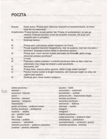 POCZTA Nowak: Dzlen dobry. Prosze pani, listonosz zostawll mi zawiadomienie, ze mam tutaj list do odebrania. Urzednlczka: Prosze bardzo, tu jest pariski list. Prosze mi poswiadczyc, ze pan go odebraf. Podczas podrozy urwat sle kawafek znaczka, ale poza tym wszystko jest w porzadku, N: Dzlekuje bardzo. N: U: N: U: N: U: N: U: N: Prosze pani, potrzebuje wystac telegram do Czech. Prosze wypelnlc blankiet telegraficzny, leZy na pulpicie. Jest tam tez ploro i atrament. Depesze mozna nadac w dowolnym [ezyku, Prosze pani, mam zamiar wyslac pienladze do Krakoifa, gdzle rnoge otrzymac przekaz pocztowy? U mnie. Poprosze 0 jeden przekaz i 0 znaczki pocztowe: dwa na listy i pi~c na wldokowki, Czy rnoge tez dostac u pani pocztowkl. Naturalnie, ile? Prosze dwie. Jeszczejedno pytanie. Gdzie moge nadac paczke? Paczke mozna nadac w drugim budynku, ale musi pan wyjsc na ullce, Za roglem jest wejscie. Dzi~kuj~ pani, teraz nadam telegram. adres pocztowy adresat atrament - inkoust awizo blankiet - blanket depesza - telegram filatelistyka golab pocztowy - postovni holub kartka pocztowa - pohlednice koperta - obalka lak - pecetni vosk list - dopis listonosz - postak nadawca - odesilatel okienko pocztowe - postovni prepazka przekaz - poukaz, slozenka paczka - balik poczmistrz - postrnistr pocztowka - pohled polecony list - doporuceny dopis skrytka pocztowa skrzynka pocztowa sortownia - trfdirna stempel - razitko telegraf telegram trabka pocztowa urzad pocztowy - postovni urad wldokowka - pohlednice zawiadomienie - oznamenf, zprava znaczek pocztowy - znarnka