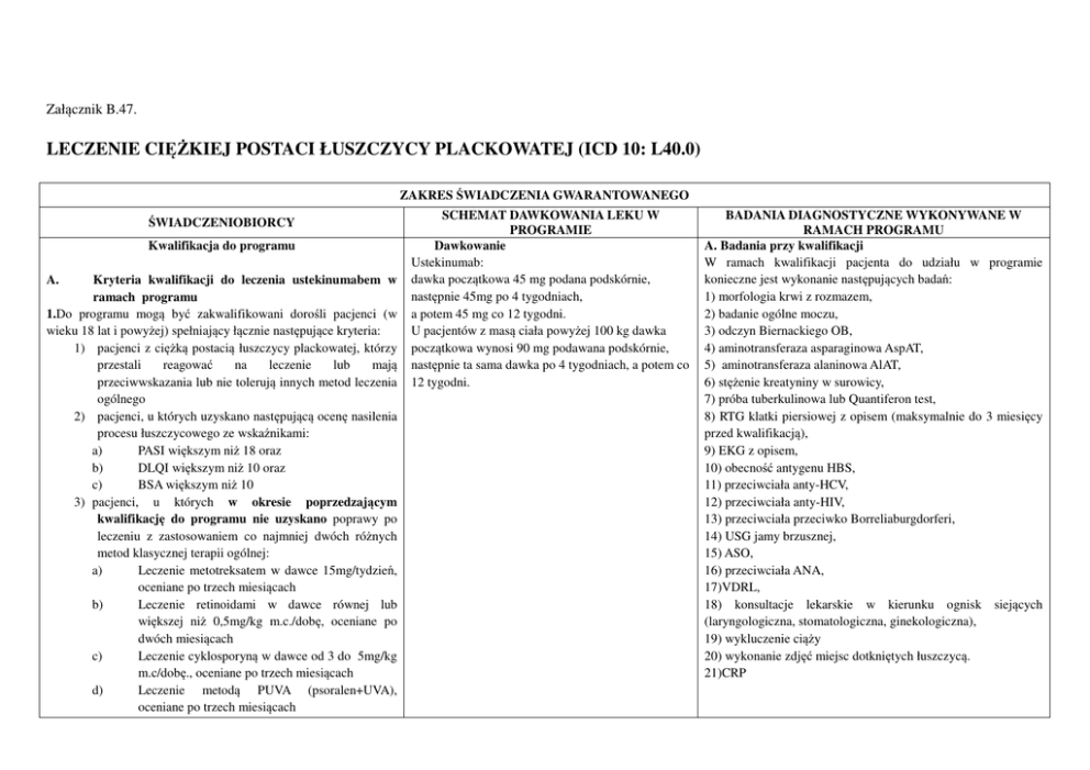 Załącznik B.47. LECZENIE CIĘŻKIEJ POSTACI ŁUSZCZYCY PLACKOWATEJ (ICD 10: L40.0) ZAKRES ŚWIADCZENIA GWARANTOWANEGO ŚWIADCZENIOBIORCY Kwalifikacja do programu A. Kryteria kwalifikacji do leczenia ustekinumabem w ramach programu 1.Do programu mogą być zakwalifikowani dorośli pacjenci (w wieku 18 lat i powyżej) spełniający łącznie następujące kryteria: 1) pacjenci z ciężką postacią łuszczycy plackowatej, którzy przestali reagować na leczenie lub mają przeciwwskazania lub nie tolerują innych metod leczenia ogólnego 2) pacjenci, u których uzyskano następującą ocenę nasilenia procesu łuszczycowego ze wskaźnikami: a) PASI większym niż 18 oraz b) DLQI większym niż 10 oraz c) BSA większym niż 10 3) pacjenci, u których w okresie poprzedzającym kwalifikację do programu nie uzyskano poprawy po leczeniu z zastosowaniem co najmniej dwóch różnych metod klasycznej terapii ogólnej: a) Leczenie metotreksatem w dawce 15mg/tydzień, oceniane po trzech miesiącach b) Leczenie retinoidami w dawce równej lub większej niż 0,5mg/kg m.c./dobę, oceniane po dwóch miesiącach c) Leczenie cyklosporyną w dawce od 3 do 5mg/kg m.c/dobę., oceniane po trzech miesiącach d) Leczenie metodą PUVA (psoralen+UVA), oceniane po trzech miesiącach SCHEMAT DAWKOWANIA LEKU W PROGRAMIE Dawkowanie Ustekinumab: dawka początkowa 45 mg podana podskórnie, następnie 45mg po 4 tygodniach, a potem 45 mg co 12 tygodni. U pacjentów z masą ciała powyżej 100 kg dawka początkowa wynosi 90 mg podawana podskórnie, następnie ta sama dawka po 4 tygodniach, a potem co 12 tygodni. BADANIA DIAGNOSTYCZNE WYKONYWANE W RAMACH PROGRAMU A. Badania przy kwalifikacji W ramach kwalifikacji pacjenta do udziału w programie konieczne jest wykonanie następujących badań: 1) morfologia krwi z rozmazem, 2) badanie ogólne moczu, 3) odczyn Biernackiego OB, 4) aminotransferaza asparaginowa AspAT, 5) aminotransferaza alaninowa AlAT, 6) stężenie kreatyniny w surowicy, 7) próba tuberkulinowa lub Quantiferon test, 8) RTG klatki piersiowej z opisem (maksymalnie do 3 miesięcy przed kwalifikacją), 9) EKG z opisem, 10) obecność antygenu HBS, 11) przeciwciała anty-HCV, 12) przeciwciała anty-HIV, 13) przeciwciała przeciwko Borreliaburgdorferi, 14) USG jamy brzusznej, 15) ASO, 16) przeciwciała ANA, 17)VDRL, 18) konsultacje lekarskie w kierunku ognisk siejących (laryngologiczna, stomatologiczna, ginekologiczna), 19) wykluczenie ciąży 20) wykonanie zdjęć miejsc dotkniętych łuszczycą. 21)CRP lub pacjenci, u których występują przeciwwskazania do stosowania wyżej wymienionych metod terapii ogólnej, przy czym przeciwwskazania do stosowania terapii ogólnej muszą być oparte na Charakterystyce Produktu Leczniczego lub aktualnej wiedzy medycznej lub pacjenci, u których wystąpiły działania niepożądane po stosowaniu wyżej wymienionych metod terapii ogólnej uniemożliwiające ich kontynuowanie. 2. Do programu mogą być kwalifikowani również pacjenci uprzednio leczeni terapią biologiczną w ramach świadczenia za zgodą płatnika lub w ramach hospitalizacji według jednorodnych grup pacjentów (JGP) lub w ramach farmakoterapii niestandardowej, pod warunkiem, że przed rozpoczęciem leczenia biologicznego spełniali kryteria kwalifikacji do programu oraz nie spełnili kryteriów zakończenia udziału w programie. W szczególnych przypadkach braku spełnienia kryteriów kwalifikacji do programu przed rozpoczęciem leczenia biologicznego w ramach świadczenia za zgodą płatnika lub w ramach hospitalizacji według jednorodnych grup pacjentów (JGP) lub w ramach farmakoterapii niestandardowej decyzję o kwalifikacji do programu podejmuje Zespół Koordynacyjny do Spraw Leczenia Biologicznego w Łuszczycy Plackowatej, pod warunkiem, że nie zostały spełnione kryteria zakończenia udziału w programie 3.W przypadku kobiet w wieku rozrodczym wymagana jest zgoda na stosowanie skutecznej antykoncepcji w czasie leczenia oraz przez 15 tygodni od podania ostatniej dawki ustekinumabu. 4. Zgłoszenia pacjenta do programu dokonuje lekarz dermatolog prowadzący pacjenta, który posiada odpowiednią dokumentację dotychczasowego leczenia. Do dokumentacji dołącza się zdjęciapliki*jgp zmian miejsc dotkniętych łuszczycą, które następnie wczytuje się w aplikację komputerową wskazaną przez Prezesa B .Monitorowanie leczenia: 1. W celu oceny skuteczności leczenia wykonuje się: 1) Ocenę wskaźnika nasilenia zmian łuszczycowych – PASI. Ocenę PASI należy wykonać po 4 tygodniach(+/-7dni) od pierwszego podania a następnie co 12 tygodni (+/7dni). Ocenę skuteczności leczenia w oparciu o wskaźnik PASI dokonuje się w 28 tygodniu od podania pierwszej dawki ustekinumabu a następnie w 40 tygodniu (do dokumentacji dołącza się zdjęciapliki*jgp. tak jak przy kwalifikacji do programu). 2) Leczenie może być kontynuowane u pacjentów, u których w 28 i 40 tygodniu stwierdzono zmniejszenie wartości PASI o 75%. 3) Pacjent może być kwalifikowany do dalszego leczenia również jeżeli w 28 i 40 tygodniu poprawa wskaźnika PASI mieści się w przedziale 50-75% i jednocześnie stwierdzono poprawę jakości życia ocenioną za pomocą skali DLQI (spadek wartości o minimum 5 punktów). 4) Ostateczną decyzję o kontynuacji leczenia podejmuje lekarz prowadzący po uzyskaniu akceptacji Zespołu Koordynacyjnego do Spraw Leczenia Biologicznego w Łuszczycy Plackowatej. 2. Kontrola pacjentów w trakcie leczenia ustekinumabem: Nie rzadziej, niż w wyznaczonych terminach należy wykonać: 1) w 4 tygodniu od pierwszego podania wywiad lekarski dotyczący efektów leczenia i możliwych działań niepożądanych. 2) w 4 tygodniu od podania pierwszej dawki należy wykonać ocenę nasilenia procesu łuszczycowego w skali PASI, DLQI i BSA. 3) w 4 tygodniu od podania pierwszej dawki należy ocenić: a) morfologię krwi z rozmazem, b) odczyn Biernackiego OB., NFZ, o której mowa poniżej Pacjent jest następnie kw
