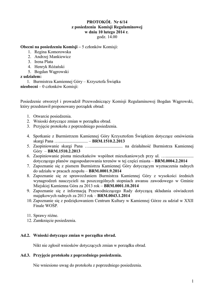 PROTOKÓŁ Nr 6/14 z posiedzenia Komisji Regulaminowej w dniu 10 lutego 2014 r. godz. 14.00 Obecni na posiedzeniu Komisji – 5 członków Komisji: 1. Regina Komorowska 2. Andrzej Mankiewicz 3. Irena Plata 4. Henryk Różański 5. Bogdan Wągrowski z udziałem: 1. Burmistrza Kamiennej Góry – Krzysztofa Świątka nieobecni – 0 członków Komisji: Posiedzenie otworzył i prowadził Przewodniczący Komisji Regulaminowej Bogdan Wągrowski, który przedstawił proponowany porządek obrad: 1. Otwarcie posiedzenia. 2. Wnioski dotyczące zmian w porządku obrad. 3. Przyjęcie protokołu z poprzedniego posiedzenia. 4. Spotkanie z Burmistrzem Kamiennej Góry Krzysztofem Świątkiem dotyczące omówienia skargi Pana …........................... – BRM.1510.2.2013 5. Zaopiniowanie skargi Pana …............................... na działalność Burmistrza Kamiennej Góry – BRM.1510.2.2013 6. Zaopiniowanie pisma mieszkańców wspólnot mieszkaniowych przy ul. ….......................... dotyczącego planów zagospodarowania terenów w tej części miasta – BRM.0004.2.2014 7. Zapoznanie się z pismem Burmistrza Kamiennej Góry dotyczącym wyznaczenia radnych do udziału w pracach zespołu – BRM.0001.9.2014 8. Zapoznanie się ze sprawozdaniem Burmistrza Kamiennej Góry z wysokości średnich wynagrodzeń nauczycieli na poszczególnych stopniach awansu zawodowego w Gminie Miejskiej Kamienna Góra za 2013 rok – BRM.0001.10.2014 9. Zapoznanie się z informacją Przewodniczącego Rady dotyczącą składania oświadczeń majątkowych radnych za 2013 rok – BRM.0043.1.2014 10. Zapoznanie się z podziękowaniem Centrum Kultury w Kamiennej Górze za udział w XXII Finale WOŚP. 11. Sprawy różne. 12. Zamknięcie posiedzenia. Ad.2. Wnioski dotyczące zmian w porządku obrad. Nikt nie zgłosił wniosków dotyczących zmian w porządku obrad. Ad.3. Przyjęcie protokołu z poprzedniego posiedzenia. Nie wniesiono uwag do protokołu z poprzedniego posiedzenia. 1 Ad.4. Spotkanie z Burmistrzem Kamiennej Góry Krzysztofem Świątkiem dotyczące omówienia skargi Pana …............................. – BRM.1510.2.2013 Na posiedzenie Komisji przybył Burmistrz Kamiennej Góry Krzysztof Świątek, który przedstawił szczegółowo swoje stanowisko, będące odpowiedzią na zarzuty ujęte w skardze Pana …............................... Ad.5. Zaopiniowanie skargi Pana ….......................... na działalność Burmistrza Kamiennej Góry – BRM.1510.2.2013 Komisja Regulaminowa Rady Miejskiej w Kamiennej Górze zaprosiła na przyszłe 7. posiedzenie, które odbędzie się dnia 17 stycznia br. (poniedziałek) od godz. 14 00, skarżącego Pana …........................ w celu szczegółowego omówienia zarzutów ujętych w treści skargi na działalność Burmistrza Kamiennej Góry. Powyższe zaproszenie Komisji stanowi zał. Nr 1 do protokołu. Ad.6. Zaopiniowanie pisma mieszkańców wspólnot mieszkaniowych przy ul. …...................... dotyczącego planów zagospodarowania terenów w tej części miasta – BRM.0004.2.2014 Komisja zapoznała się z pismem /zał. Nr 2 do protokołu/. Komisja Regulaminowa Rady Miejskiej w Kamiennej Górze zwróciła się się z prośbą do Burmistrza Kamiennej Góry o szczegółowe zapoznanie się z treścią korespondencji Pana …............................ i Wspólnot mieszkaniowych przy ul. …...................., w celu udzielenia odpowiedzi zainteresowanym, zgodnie z kompetencją. Powyższy wniosek Komisji został ujęty w piśmie Przewodniczącego Rady /zał. Nr 3 do protokołu/, przekazującym Burmistrzowi Kamiennej Góry zbiorczo stanowiska poszczególnych Stałych Komisji Rady Miejskiej w w/w sprawie. Ad.7. Zapoznanie się z pismem Burmistrza Kamiennej Góry dotyczącym wyznaczenia radnych do udziału w pracach zespołu – BRM.0001.9.2014 Komisja zapoznała się z pismem /zał. Nr 4 do protokołu/, lecz nie wyznaczyła żadnego Członka Komisji do udziału w pracach zespołu. Ad.8. Zapoznanie się ze sprawozdaniem Burmistrza Kamiennej Góry z wysokości średnich wynagrodzeń nauczycieli na poszczególnych stopniach awansu zawodowego w Gminie Miejskiej Kamienna Góra za 2013 rok – BRM.0001.10.2014 Komisja zapoznała się ze sprawozdaniem /zał. Nr 5 do protokołu/. Ad.9. Zapoznanie się z informacją Przewodniczącego Rady dotyczącą składania oświadczeń majątkowych radnych za 2013 rok – BRM.0043.1.2014 Komisja zapoznała się z informacją /zał. Nr 6 do protokołu/. 2 Ad.10. Zapoznanie się z podziękowaniem Centrum Kultury w Kamiennej Górze za udział w XXII Finale WOŚP. Komisja zapoznała się z podziękowaniem /zał. Nr 7 do protokołu/. Ad.11. Sprawy różne Spraw różnych nie wniesiono. Ad.12. Po wyczerpaniu porządku obrad posiedzenie Komisji zakończono. Protokołował: Bogdan Wągrowski Przewodniczący Komisji Regulaminowej /-/ Bogdan Wągrowski 3 Porządek obrad Komisji Regulaminowej w dniu 10 lutego 2014 r. godz. 14.00 1. Otwarcie posiedzenia. 2. Wnioski dotyczące zmian w porządku obrad. 3. Przyjęcie protokołu z poprzedniego posiedzenia. 4. Spotkanie z Burmistrzem Kamiennej Góry Krzysztofem Świątkiem dotyczące omówienia skargi Pana …............................ – BRM.1510.2.2013 5. Zaopiniowanie skargi Pana ….............................. na działalność Burmistrza Kamiennej Góry – BRM.1510.2.2013 6. Zaopiniowanie pisma mieszkańców wspólnot mieszkaniowych przy ul. …....................... dotyczącego planów zagospodarowania terenów w tej części miasta – BRM.0004.2.2014 7. Zapoznanie się z pismem Burmistrza Kamiennej Góry dotyczącym wyznaczenia radnych do udziału w pracach zespołu – BRM.0001.9.2014 8. Zapoznanie się ze sprawozdaniem Burmistrza Kamiennej Góry z wysokości średnich wynagrodzeń nauczycieli na poszczególnych stopniach awansu zawodowego w Gminie Miejskiej Kamienna Góra za 2013 rok – BRM.0001.10.2014 9. Zapoznanie się z informacją Przewodniczącego Rady dotycząc