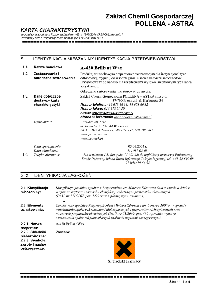 Zakład Chemii Gospodarczej POLLENA - ASTRA KARTA CHARAKTERYSTYKI sporządzona zgodnie z Rozporządzeniem WE nr 1907/2006 (REACH)załącznik II zmieniony przez Rozporządzenie Komisji (UE) nr 453/2010 zał. I. ============================================================ S.1. IDENTYFIKACJA MIESZANINY i IDENTYFIKACJA PRZEDSIĘBIORSTWA 1.1. Nazwa handlowa A-430 Brillant Wax 1.2. Zastosowanie i odradzane zastosowania 1.3. Dane dotyczące dostawcy karty charakterystyki Produkt jest woskowym preparatem przeznaczonym dla instytucjonalnych odbiorców [ myjnie ] do wspomagania suszenia karoserii samochodów. Przystosowany do nanoszenia urządzeniami wysokociśnieniowymi typu lanca, spryskiwacz. Odradzane zastosowania: nie stosować do mycia. Zakład Chemii Gospodarczej POLLENA – ASTRA sp.z o.o. 37-700 Przemyśl, ul. Herburtów 34 Numer telefonu: 16 678 66 31; 16 678 66 32 Numer faksu: 016 678 99 39 e-mail: [email protected] strona w internecie www.pollena-astra.com.pl Provaco Sp. z o.o. ul. Bema 57 A; 01-244 Warszawa tel. fax. 022 836-18-75; 504 071 797; 501 700 383 www.provaco.com www.kenotek.pl Dystrybutor: 1.4. Data sporządzenia Data aktualizacji Telefon alarmowy 05.01.2004 r. I: 2011-02-03 Jak w wierszu 1.3. (do godz. 15.00) lub do najbliższej terenowej Państwowej Straży Pożarnej, lub do Biura Informacji Toksykologicznej, tel. +48 22 619 08 97 lub 619 66 54 S. 2. IDENTYFIKACJA ZAGROŻEŃ 2.1. Klasyfikacja mieszaniny: Klasyfikacja produktu zgodnie z Rozporządzeniem Ministra Zdrowia z dnia 4 września 2007 r. w sprawie kryteriów i sposobu klasyfikacji substancji i preparatów chemicznych (Dz.U. nr 174/2007, poz. 1222 wraz z późniejszymi zmianami): 2.2. Elementy oznakowania: Oznakowano zgodnie z Rozporządzeniem Ministra Zdrowia z dn. 5 marca 2009 r. w sprawie oznakowania opakowań substancji niebezpiecznych i preparatów niebezpiecznych oraz niektórych preparatów chemicznych (Dz.U. nr 53/2009, poz. 439); produkt wymaga oznakowania opakowań jednostkowych znakami i napisami ostrzegawczymi: 2.2.1. Nazwa preparatu: 2.2.2. Składniki niebezpieczne: 2.2.3. Symbole, zwroty i napisy ostrzegawcze: A-430 Brillant Wax Zawiera: Xi produkt drażniący ============================================================ Strona 1 z 9 Zakład Chemii Gospodarczej POLLENA - ASTRA KARTA CHARAKTERYSTYKI sporządzona zgodnie z Rozporządzeniem WE nr 1907/2006 (REACH)załącznik II zmieniony przez Rozporządzenie Komisji (UE) nr 453/2010 zał. I. ============================================================ Zwroty R: Zwroty S: 2.3. Inne zagrożenia: R38 – działa drażniąco na skórę R41 – ryzyko poważnego uszkodzenia wzroku S2 – Chronić przed dziećmi S26 – Zanieczyszczone oczy przemyć natychmiast dużą ilością wody i zasięgnąć porady lekarza S35 - Usuwać produkt i jego opakowanie w sposób bezpieczny S36/37/39 – Nosić odpowiednią odzież ochronną, odpowiednie rękawice ochronne i okulary lub ochronę twarzy S46 – W razie połknięcia niezwłocznie zasięgnąć porady lekarza, jeżeli to możliwe, pokaż etykietę. S64 – W przypadku połknięcia wypłukać usta wodą – nigdy nie stosować u osób nieprzytomnych Napisy dodatkowe Nieznane S. 3. SKŁAD/INFORMACJA O SKŁADNIKACH Składniki niebezpieczne zawarte w produkcie: Nazwa substancji/INCI name Dietanoloalkiloamina INCI name; PEG-2 Oleyl Amine Chlorek dialkilodimetyloamoniowy INCI name; Qaternium 18 2-metyl pentan- 2,4-diol INCI name; HG S. 4. nr indeksowy nr WE nr CAS Nr rej. % wagowy Symbol zagrożenia 246807-3 2530717-9 brak 1,0-:4,0% C Xn N N Zwroty R (pełne brzmienie zwrotów R podano w punkcie 16) R34 R22 R50 R50/53 Xi R36/38 262090-2 6178980-8 brak 3,0—4% 203489-0 107-41-5 brak 1,0-:4,0% ŚRODKI PIERWSZEJ POMOCY 4.1. Opis środków pierwszej pomocy Uwagi ogólne : Natychmiast wyprowadzić poszkodowanego na świeże powietrze. W przypadku wystąpienia jakichkolwiek niepokojących objawów wezwać natychmiast lekarza lub odwieźć poszkodowanego do szpitala, pokazać opakowanie preparatu lub etykietę. Wdychanie: W przypadku zatrzymania oddechu zastosować sztuczne oddychanie. Zapewnić poszkodowanemu ciepło i warunki do odpoczynku. Wezwać natychmiast pomoc medyczną. Skóra: Zdjąć skażoną odzież. Natychmiast umyć skórę dużą ilością letniej wody, najlepiej bieżącej. W przypadku podrażnienia skóry (zaczerwienienie) skonsultować się natychmiast z lekarzem. Oczy: Zdjąć szkła kontaktowe. Natychmiast przemywać oczy dużą ilością letniej wody co najmniej 15 min. (przy odwiniętych powiekach), unikać silnego strumienia wody ze względu na ryzyko uszkodzenia rogówki, w przypadku zanieczyszczenia jednego oka, chronić w trakcie przemywania drugie oko przed ============================================================ Strona 2 z 9 Zakład Chemii Gospodarczej POLLENA - ASTRA KARTA CHARAKTERYSTYKI sporządzona zgodnie z Rozporządzeniem WE nr 1907/2006 (REACH)załącznik II zmieniony przez Rozporządzenie Komisji (UE) nr 453/2010 zał. I. ============================================================ zanieczyszczeniem. Skonsultować się natychmiast z lekarzem okulistą!. Uwaga: osoby narażone na skażenie oczu powinny być pouczone o konieczności i sposobie ich natychmiastowego płukania. Połknięcie : Wypłukać usta wodą. Nie powodować wymiotów. Podać do wypicia białka jaj kurzych, mleko lub wodę. Wezwać natychmiast pomoc medyczną. UWAGA! Pacjenta nieprzytomnego ułożyć w pozycji bocznej ustalonej, zapewnić zatrutemu spokój, chronić przed utratą ciepła, kontrolować oddech i puls. Nigdy nie wywoływać wymiotów ani nie podawać niczego doustnie osobie nieprzytomnej lub zamroczonej. 4.2. Najważniejsze ostre i opóźnione objawy oraz skutki narażenia Patrz punkt 11 4.3. Wskazania dotyczące wszelkiej natychmiastowej pomocy lekarskiej i szczególnego postępowania z poszkodowanym Brak szczególnych zaleceń S. 5. POSTĘPOWANIE W PRZYPADKU POŻARU 5.1. Zalecane środki gaśnicze: Nie st