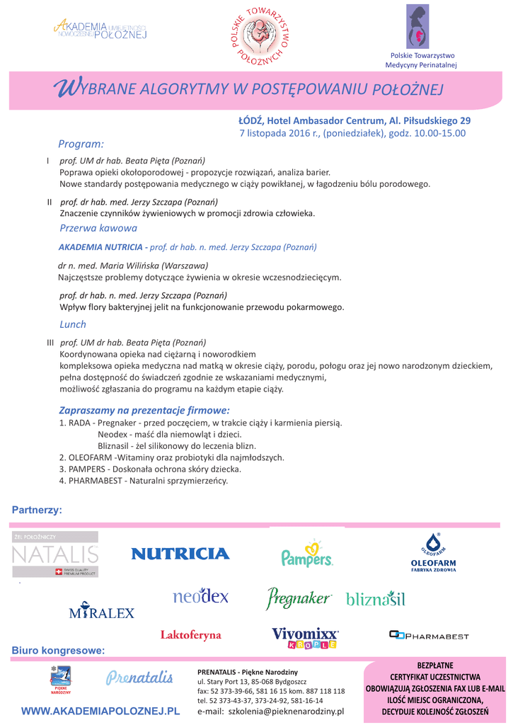 Polskie Towarzystwo Medycyny Perinatalnej WYBRANE ALGORYTMY W POSTĘPOWANIU POŁOŻNEJ ŁÓDŹ, Hotel Ambasador Centrum, Al. Piłsudskiego 29 7 listopada 2016 r., (poniedziałek), godz. 10.00-15.00 Program: I prof. UM dr hab. Beata Pięta (Poznań) Poprawa opieki okołoporodowej - propozycje rozwiązań, analiza barier. Nowe standardy postępowania medycznego w ciąży powikłanej, w łagodzeniu bólu porodowego. II prof. dr hab. med. Jerzy Szczapa (Poznań) Znaczenie czynników żywieniowych w promocji zdrowia człowieka. Przerwa kawowa AKADEMIA NUTRICIA - prof. dr hab. n. med. Jerzy Szczapa (Poznań) dr n. med. Maria Wilińska (Warszawa) Najczęstsze problemy dotyczące żywienia w okresie wczesnodziecięcym. prof. dr hab. n. med. Jerzy Szczapa (Poznań) Wpływ flory bakteryjnej jelit na funkcjonowanie przewodu pokarmowego. Lunch III prof. UM dr hab. Beata Pięta (Poznań) Koordynowana opieka nad ciężarną i noworodkiem kompleksowa opieka medyczna nad matką w okresie ciąży, porodu, połogu oraz jej nowo narodzonym dzieckiem, pełna dostępność do świadczeń zgodnie ze wskazaniami medycznymi, możliwość zgłaszania do programu na każdym etapie ciąży. Zapraszamy na prezentacje firmowe: 1. RADA - Pregnaker - przed poczęciem, w trakcie ciąży i karmienia piersią. Neodex - maść dla niemowląt i dzieci. Bliznasil - żel silikonowy do leczenia blizn. 2. OLEOFARM -Witaminy oraz probiotyki dla najmłodszych. 3. PAMPERS - Doskonała ochrona skóry dziecka. 4. PHARMABEST - Naturalni sprzymierzeńcy. Partnerzy: . Biuro kongresowe: PRENATALIS - Piękne Narodziny ul. Stary Port 13, 85-068 Bydgoszcz fax: 52 373-39-66, 581 16 15 kom. 887 118 118 tel. 52 373-43-37, 373-24-92, 581-16-14 WWW.AKADEMIAPOLOZNEJ.PL e-mail: [email protected] BEZPŁATNE CERTYFIKAT UCZESTNICTWA OBOWIĄZUJĄ ZGŁOSZENIA FAX LUB E-MAIL ILOŚĆ MIEJSC OGRANICZONA, DECYDUJE KOLEJNOŚĆ ZGŁOSZEŃ
