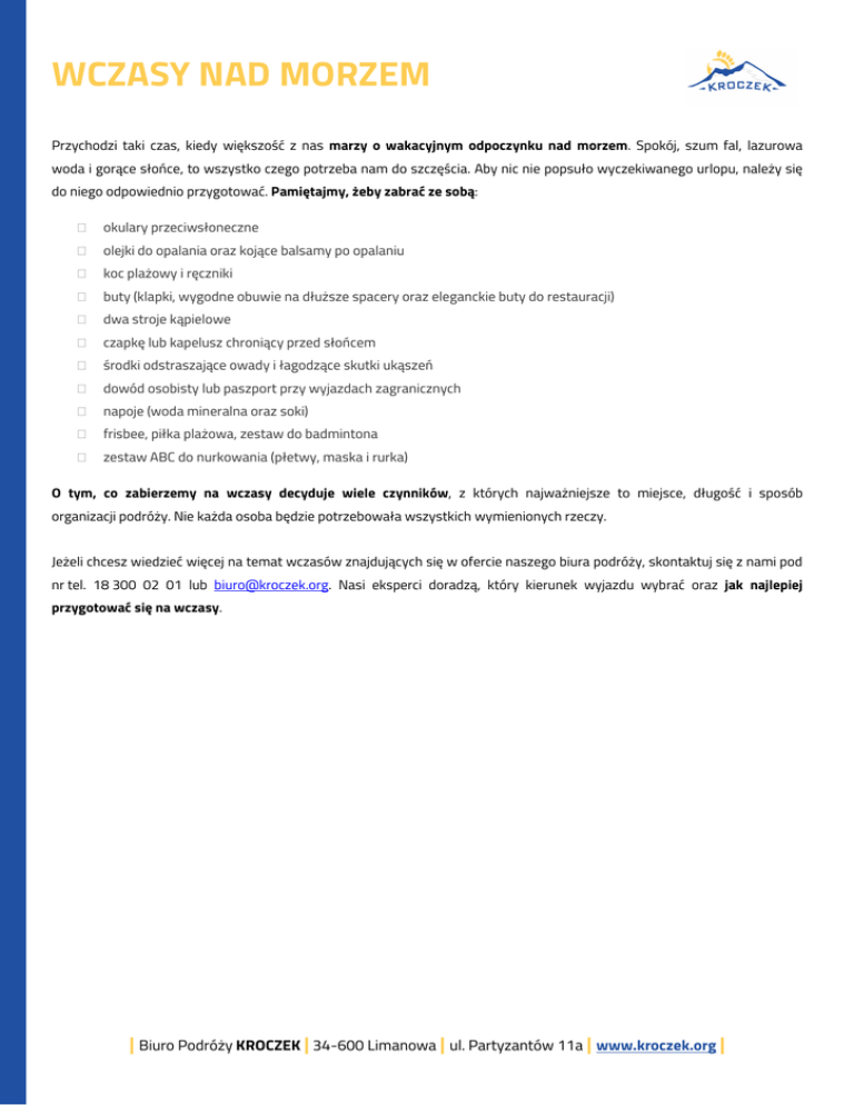 WCZASY NAD MORZEM Przychodzi taki czas, kiedy większość z nas marzy o wakacyjnym odpoczynku nad morzem. Spokój, szum fal, lazurowa woda i gorące słońce, to wszystko czego potrzeba nam do szczęścia. Aby nic nie popsuło wyczekiwanego urlopu, należy się do niego odpowiednio przygotować. Pamiętajmy, żeby zabrać ze sobą: okulary przeciwsłoneczne olejki do opalania oraz kojące balsamy po opalaniu koc plażowy i ręczniki buty (klapki, wygodne obuwie na dłuższe spacery oraz eleganckie buty do restauracji) dwa stroje kąpielowe czapkę lub kapelusz chroniący przed słońcem środki odstraszające owady i łagodzące skutki ukąszeń dowód osobisty lub paszport przy wyjazdach zagranicznych napoje (woda mineralna oraz soki) frisbee, piłka plażowa, zestaw do badmintona zestaw ABC do nurkowania (płetwy, maska i rurka) O tym, co zabierzemy na wczasy decyduje wiele czynników, z których najważniejsze to miejsce, długość i sposób organizacji podróży. Nie każda osoba będzie potrzebowała wszystkich wymienionych rzeczy. Jeżeli chcesz wiedzieć więcej na temat wczasów znajdujących się w ofercie naszego biura podróży, skontaktuj się z nami pod nr tel. 18 300 02 01 lub [email protected]. Nasi eksperci doradzą, który kierunek wyjazdu wybrać oraz jak najlepiej przygotować się na wczasy. | Biuro Podróży KROCZEK | 34-600 Limanowa | ul. Partyzantów 11a | www.kroczek.org |