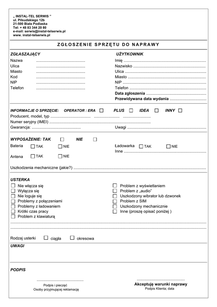 „ INSTAL-TEL SERWIS ” ul. Piłsudskiego 12b 21-500 Biała Podlaska Tel: + 48 83 344 20 80 e-mail: [email protected] www. instal-telserwis.pl ZGŁOSZENIE SPRZĘTU DO NAPRAWY ZGŁASZAJĄCY UŻYTKOWNIK Nazwa Ulica Miasto Kod NIP Telefon Imię .......................................................................... Nazwisko ................................................................. Ulica ......................................................................... Miasto ...................................................................... NIP ........................................................................... Telefon ..................................................................... Data zgłoszenia ...................................................... Przewidywana data wydania ................................. ............................................ ............................................ ............................................ ............................................ ............................................ ............................................ PLUS IDEA INNY Producent, model, typ .................................... ....................... ......................... Numer seryjny (IMEI) ........................................................................................... Gwarancja: ............................................ Uwagi ....................................................................... INFORMACJE O SPRZĘCIE: OPERATOR : ERA WYPOSAŻENIE: TAK NIE Bateria TAK NIE Antena TAK NIE Ładowarka TAK NIE Inne .......................................................................... Uszkodzenia mechaniczne (jakie?) ....................................................................................................................... USTERKA Nie włącza się Problem z wyświetlaniem Wyłącza się Problem z „audio” Nie loguje się Uszkodzony wibrator lub dzwonek Problemy z połączeniami Problem z SIM Problemy z ładowaniem Uszkodzony mechanicznie Krótki czas pracy Inne (proszę opisać poniżej ) Problem z klawiaturą ................................................................................................................................................................................ ................................................................................................................................................................................ Rodzaj usterki ciągła okresowa UWAGI PODPIS .......................................... Podpis i pieczęć Osoby przyjmującej reklamację ........................................... Akceptuję warunki naprawy Podpis Klienta; data