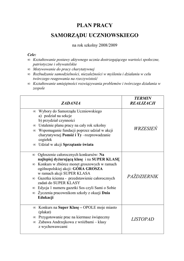 PLAN PRACY SAMORZĄDU UCZNIOWSKIEGO