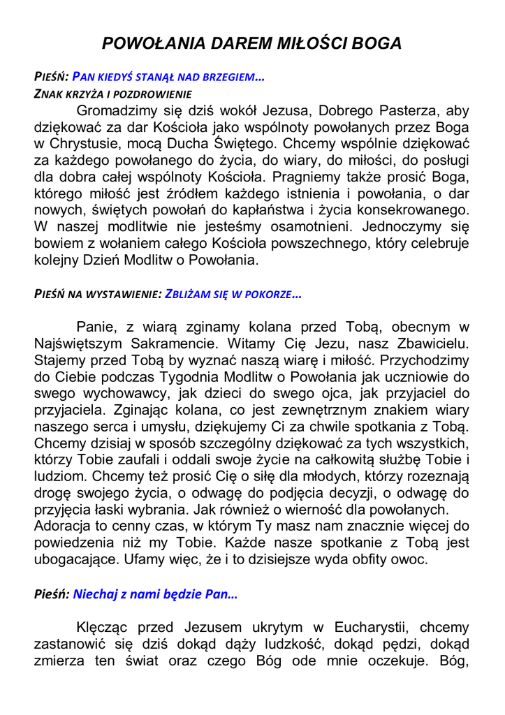 POWOŁANIA DAREM MIŁOŚCI BOGA PIEŚŃ: PAN KIEDYŚ STANĄŁ NAD BRZEGIEM… ZNAK KRZYŻA I POZDROWIENIE Gromadzimy się dziś wokół Jezusa, Dobrego Pasterza, aby dziękować za dar Kościoła jako wspólnoty powołanych przez Boga w Chrystusie, mocą Ducha Świętego. Chcemy wspólnie dziękować za każdego powołanego do życia, do wiary, do miłości, do posługi dla dobra całej wspólnoty Kościoła. Pragniemy także prosić Boga, którego miłość jest źródłem każdego istnienia i powołania, o dar nowych, świętych powołań do kapłaństwa i życia konsekrowanego. W naszej modlitwie nie jesteśmy osamotnieni. Jednoczymy się bowiem z wołaniem całego Kościoła powszechnego, który celebruje kolejny Dzień Modlitw o Powołania. PIEŚŃ NA WYSTAWIENIE: ZBLIŻAM SIĘ W POKORZE … Panie, z wiarą zginamy kolana przed Tobą, obecnym w Najświętszym Sakramencie. Witamy Cię Jezu, nasz Zbawicielu. Stajemy przed Tobą by wyznać naszą wiarę i miłość. Przychodzimy do Ciebie podczas Tygodnia Modlitw o Powołania jak uczniowie do swego wychowawcy, jak dzieci do swego ojca, jak przyjaciel do przyjaciela. Zginając kolana, co jest zewnętrznym znakiem wiary naszego serca i umysłu, dziękujemy Ci za chwile spotkania z Tobą. Chcemy dzisiaj w sposób szczególny dziękować za tych wszystkich, którzy Tobie zaufali i oddali swoje życie na całkowitą służbę Tobie i ludziom. Chcemy też prosić Cię o siłę dla młodych, którzy rozeznają drogę swojego życia, o odwagę do podjęcia decyzji, o odwagę do przyjęcia łaski wybrania. Jak również o wierność dla powołanych. Adoracja to cenny czas, w którym Ty masz nam znacznie więcej do powiedzenia niż my Tobie. Każde nasze spotkanie z Tobą jest ubogacające. Ufamy więc, że i to dzisiejsze wyda obfity owoc. Pieśń: Niechaj z nami będzie Pan… Klęcząc przed Jezusem ukrytym w Eucharystii, chcemy zastanowić się dziś dokąd dąży ludzkość, dokąd pędzi, dokąd zmierza ten świat oraz czego Bóg ode mnie oczekuje. Bóg, wchodząc w dzieje świata, od najdawniejszych czasów posługuje się ludźmi. Chociaż jest Bogiem Wszechmogącym, to jednak potrzebuje człowieka, aby ten spełniał powierzone mu zadania. Bóg, wybierając kogoś, daje mu potrzebne talenty oraz siły. W Piśmie Świętym widzimy przykłady wielu ludzi powołanych przez Boga. Każdy z nich został powołany w inny sposób, każdy z nich otrzymał także inne zadanie do spełnienia. Każdy z nich był inny i czasy, w których żyli, były inne, jednak było coś wspólnego - Bóg wzywa ich osobiście i po imieniu. „Każde stworzenie, a w szczególności każda osoba ludzka, jest owocem myśli i aktu miłości Boga, miłości nieskończonej, wiernej, wiecznej (por. Jr 31,3). Odkrycie tej rzeczywistości jest tym, co dogłębnie przemienia nasze życie". Bóg zna dobrze każdego z nas, zna nasze talenty, możliwości, zna również nasze obawy i lęki. Wie, jakie zadania powinniśmy podjąć, aby rozwinąć nasze człowieczeństwo. Jeśli będziemy wsłuchiwać się w Boży głos, jeśli będziemy modlić się do Ducha Świętego, wtedy Bóg przemówi również do nas. Zastanawiając się, dokąd dąży ludzkość, dokąd pędzi, dokąd zmierza ten świat, dochodzimy do wniosku, że dzisiejszy świat tak bardzo potrzebuje ludzi: - ogromnej mądrości, żeby potrafili pokazać Chrystusa, żeby umieli Nim zachwycić dzisiejszego człowieka, szczególnie człowieka młodego, który jest manipulowany przez to, co świat ukazuje, czym ten świat nęci i kusi. - wielkiego serca, żeby potrafili pokazać, że warto kochać, że można całe życie przeżyć z tą jedną jedyną i tym jedynym, którym się ślubowało przy ołtarzu, budując cudowną rodzinę na solidnym fundamencie. - miłosierdzia, żeby potrafili się dzielić kromką chleba z głodnym, żeby umieli dostrzec starszych, samotnych i poranionych przez życie i umieli znaleźć chwilę czasu dla nich, niosąc światło nadziei i promyk radości. Pieśń: Bóg jest miłością… Dzisiejszy świat potrzebuje osób gotowych, by naśladować Chrystusa na wymagającej drodze życia konsekrowanego według rad ewangelicznych. Potrzebuje kapłanów, którzy byliby „trwałą gwarancją sakramentalnej obecności Chrystusa Zbawiciela" w różnych czasach i miejscach i którzy poprzez przepowiadanie Słowa oraz sprawowanie Eucharystii i innych sakramentów mogliby kierować wspólnotami chrześcijańskimi na drogach życia wiecznego. Dzisiejszy świat potrzebuje kobiet, które poprzez świadectwo życia utrzymują w ochrzczonych żywą świadomość podstawowych wartości Ewangelii i które pomogą uświadomić Ludowi Bożemu konieczność odpowiedzi świętością życia na Bożą miłość, którą rozlewa w naszych sercach Duch Święty. Oby Duch Święty wzbudził obfite powołania do życia konsekrowanego, które pomagają ludowi chrześcijańskiemu coraz mocniej przylgnąć do Ewangelii oraz ułatwiają wszystkim zrozumienie sensu życia jako odblasku piękna i świętości Boga. Prośmy teraz Boga o to, abyśmy umieli odpowiedzieć swoim życiem na Boże wezwanie… Pieśń: Ubi caritas… 1. Panie Jezu, ukryty w Eucharystii, która jest życiowym centrum każdej drogi powołaniowej, prosimy Cię, powołuj wciąż nowych pracowników do Twojej winnicy, a powołanych umacniaj swoją miłością. Ubi caritas… 2. Panie Jezu, który żyłeś w nazaretańskiej Rodzinie, prosimy Cię o świętość dla rodzin - wspólnot życia i miłości, by były miejscem sprzyjającym budzeniu się i rozwojowi powołań. Ubi caritas… 3. Panie Jezu, najlepszy Nauczycielu, prosimy Cię za osoby, którym została zlecona posługa towarzyszenia młodym, rozeznającym swoje powołanie, aby sami czerpiąc ze słowa Bożego, modlitwy, a przede wszystkim Eucharystii byli autentycznymi świadkami Twojej miłości i oferowali młodym ludziom mądrą i owocną opiekę duchową. Ubi caritas… 4. Jezu cichy 