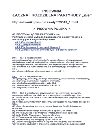 PISOWNIA ŁĄCZNA I ROZDZIELNA PARTYKUŁY „nie” http://slowniki.pwn.pl/zasady/629513_1.html > PISOWNIA POLSKA < 45. PISOWNIA ŁĄCZNA PARTYKUŁY nie Partykułę nie jako wykładnik zaprzeczenia piszemy łącznie z następującymi kategoriami wyrazów: 45.1. Z rzeczownikami 45.2. Z przymiotnikami 45.3. Z imiesłowami przymiotnikowymi 45.4. Z przysłówkami utworzonymi od przymiotników [166] 45.1. Z rzeczownikami: niebezpieczeństwo, niechrześcijanin, niecierpliwość, niedopuszczenie, niedyskrecja, niefizyk, niekapitalista, nienaturalność, niepokój, nieszczęście, niezdyscyplinowanie, nieziemskość, niezorganizowanie, nieżyciowość, ale: nie-Polak, nie-Aleksandrostwo, nie-Europejczycy, nie-Nigeryjka — zob. 53.4, ale: nie chrześcijanin, ale muzułmanin — zob. 46.11. [167] 45.2. Z przymiotnikami: nieagresywny, niebiedny, niedrogi, niehałaśliwy, niekrakowski, niemiłosierny, nieodmienny, nieprzytulny, niesłony, nietykalny, ale: nie-Szekspirowski (dramat) — zob. 53.4, ale: nie krakowski, ale warszawski — zob. 46.13, ale: nie gorszy — zob. 46.9. [168] 45.3. Z imiesłowami przymiotnikowymi (czynnymi i biernymi), niezależnie od tego, czy użyte są w znaczeniu przymiotnikowym (zob. przykłady oznaczone literą a), czy czasownikowym (zob. przykłady oznaczone literą b), np. (a) nieoceniony pracownik (= bezcenny, zasługujący na najwyższą ocenę), ale także (b) obraz nieoceniony jeszcze przez jury konkursu (= taki, którego nie oceniono); (a) nieopisane trudności (= nie dające się opisać), ale także (b) kraje nieopisane w podręczniku (= takie, których nie opisano); (a) Matka Boska Nieustającej Pomocy, ale także (b) W Tatrach padał śnieg nieustający od tygodnia; (a) Przyśnił mi się mój nieżyjący ojciec, ale także (b) Człowiek nieżyjący obecnie w Japonii nie zna grozy trzęsień ziemi. Gdy imiesłów użyty jest w znaczeniu czasownikowym, dopuszczalne jest jednak stosowanie pisowni rozdzielnej. WYJĄTKI: Zawsze stosuje się pisownię rozdzielną w wyraźnych przeciwstawieniach, np. nie leżący, ale siedzący, oraz w konstrukcjach, których ośrodkiem jest spójnik ani lub ni (np. nie piszący ani nie czytający), czasem powtórzony (np. ani nie piszący, ani nie czytający). UWAGA: Podane zasady dotyczące pisowni zaprzeczonych imiesłowów przymiotnikowych są nowością w polskiej ortografii. Oparte są na uchwale Rady Języka Polskiego przy Prezydium PAN z dnia 9 grudnia 1997 r. Dotychczasowe przepisy kazały pisać rozdzielnie imiesłowy użyte czasownikowo, a łącznie imiesłowy użyte przymiotnikowo. Choć nowa zasada dopuszcza jako oboczną rozdzielną pisownię imiesłowów w użyciu czasownikowym, w niniejszym słowniku zapisaliśmy wszystkie zaprzeczone imiesłowy przymiotnikowe w pisowni łącznej. [169] 45.4. Z przysłówkami utworzonymi od przymiotników: niedrogo, niejasno, niemile, nietrudno; są to przysłówki utworzone od przymiotników niedrogi, niejasny, niemiły, nietrudny. Bez względu na to, jaką rolę pełnią te przysłówki w zdaniu, piszemy je łącznie: Niemile mnie zaskoczył (niemile — okolicznik). Tu jest niedrogo (niedrogo — orzecznik), ale: nie drożej — zob. 46.9. 46. PISOWNIA ROZDZIELNA PARTYKUŁY NIE Partykułę nie jako wykładnik zaprzeczenia piszemy rozdzielnie z następującymi kategoriami wyrazów: 46.1. Przed czasownikami 46.2. Przed wyrazami brak, można, potrzeba itp., które mają znaczenie czasownikowe 46.3. Przed imiesłowami przysłówkowymi (...) oraz formami nieosobowymi (...) 46.4. Przed liczebnikami 46.5. Przed zaimkami 46.6. Przed wyrażeniami przyimkowymi 46.7. Przed partykułami: nie byle, nie lada 46.8. Przed przysłówkami nie pochodzącymi od przymiotników 46.9. Przed przymiotnikami i przysłówkami w stopniu wyższym i najwyższym 46.10. Przed przysłówkami, gdy partykuła nie jest także przeciwstawieniem 46.11. Przed rzeczownikami, gdy partykuła nie jest nie także przeciwstawieniem 46.12. Przed rzeczownikami użytymi w funkcji orzecznika 46.13. Przed przymiotnikami i imiesłowami przymiotnikowymi, gdy partykuła nie jest także przeciwstawieniem 2 [170] 46.1. Przed czasownikami: nie chcieć, nie odbyć, nie zrywać, nie jestem, nie jedzie, nie telefonowałem, nie zawiadomiła, nie świeciło, nie świeciłabym, nie zaskoczyłby, nie przeszkadzaj, nie roznoś, niech nie krzyczy, Janka nie ma w domu, Janek nie ma tej książki, nie wypadało się śmiać. Ta reguła odnosi się również do czasowników, które bez przeczenia nie mają inne znaczenie: nie dojadać (= głodować, oszczędzać na jedzeniu); dojadać (= kończyć jedzenie) nie dopisywać (np. o apetycie); dopisywać (od: pisać) nie dostawać (= nie otrzymywać, brakować); dostawać (= otrzymywać) nie dosypiać (= spać krócej, niż się powinno); dosypiać (= śpiąc dotrwać do pewnego czasu). Reguła odnosi się również do czasownika nie omieszkać: Nie omieszkaj (= nie zaniedbaj) iść do lekarza, a także do używanego w środowisku prawniczym nie omieszkać stawiennictwa (= nie stawić się gdzieś). WYJĄTKI: Czasowniki utworzone od rzeczowników z przedrostkowym nie, np. niepokoić (od: niepokój), niewolić (od: niewola), a także czasowniki niedomagać, niedowidzieć, nienawidzić. Pisownia niedosłyszeć lub nie dosłyszeć zależy od znaczenia: Mój ojciec od kilku lat niedosłyszy (= słabo słyszy), Stenotypistka nie dosłyszała (= nie usłyszała) ostatniego słowa. UWAGA: Rozdzielna pisownia wyrazu nie dostawać (= brakować) została wprowadzona przez Komisję Kultury Języka PAN (por. Aneks — 13.3). O rozdzielnej pisowni nie z imiesłowami przymiotnikowymi — zob. 45.3. [171] 46.2. Przed wyrazami brak, można, potrzeba, trzeba, wiadomo, warto, wolno, które mają znaczenie czasownikowe, np. nie brak, nie można, nie potrzeba, nie trzeba, nie wiadomo, nie warto, nie wolno, ale: Niepodobna tego odczytać. Wyraz niepodobna (= jest trudno, nie można) wyjątkowo pisze się łącznie. Prze
