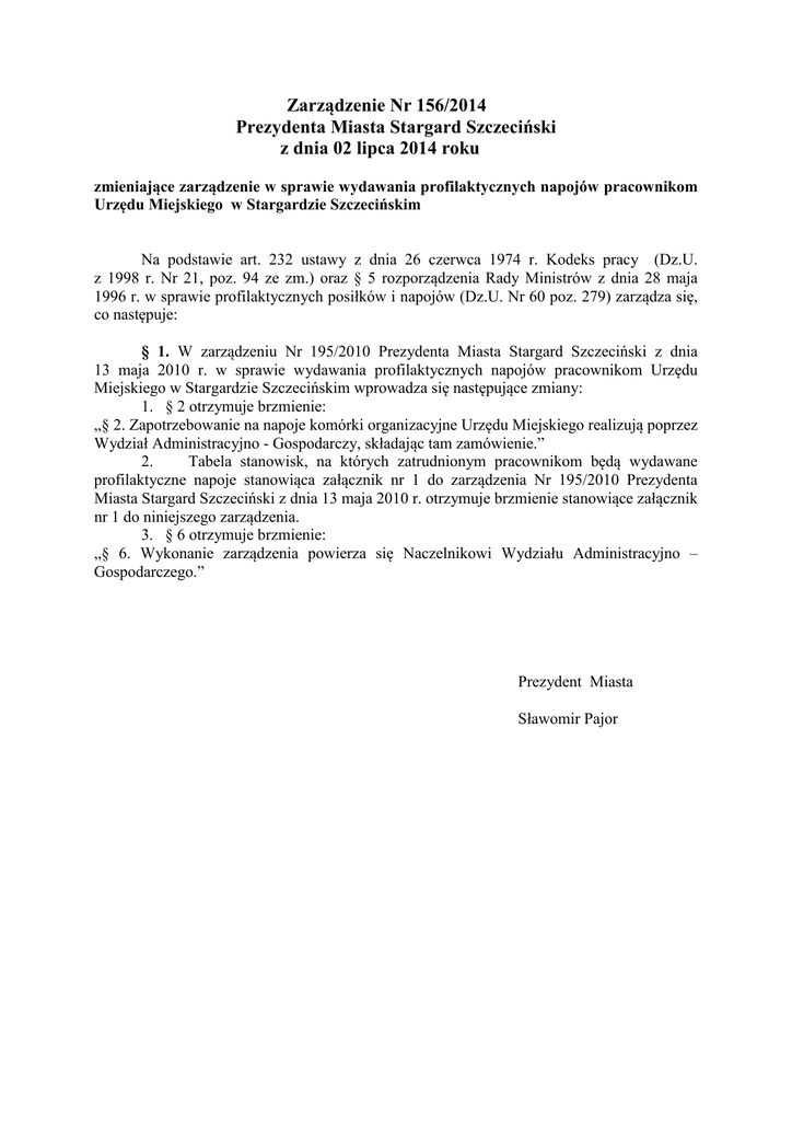 Zarządzenie Nr 156/2014 - PROJEKT Prezydenta Miasta Stargard Szczeciński z dnia 02 lipca 2014 roku zmieniające zarządzenie w sprawie wydawania profilaktycznych napojów pracownikom Urzędu Miejskiego w Stargardzie Szczecińskim Na podstawie art. 232 ustawy z dnia 26 czerwca 1974 r. Kodeks pracy (Dz.U. z 1998 r. Nr 21, poz. 94 ze zm.) oraz § 5 rozporządzenia Rady Ministrów z dnia 28 maja 1996 r. w sprawie profilaktycznych posiłków i napojów (Dz.U. Nr 60 poz. 279) zarządza się, co następuje: § 1. W zarządzeniu Nr 195/2010 Prezydenta Miasta Stargard Szczeciński z dnia 13 maja 2010 r. w sprawie wydawania profilaktycznych napojów pracownikom Urzędu Miejskiego w Stargardzie Szczecińskim wprowadza się następujące zmiany: 1. § 2 otrzymuje brzmienie: „§ 2. Zapotrzebowanie na napoje komórki organizacyjne Urzędu Miejskiego realizują poprzez Wydział Administracyjno - Gospodarczy, składając tam zamówienie.” 2. Tabela stanowisk, na których zatrudnionym pracownikom będą wydawane profilaktyczne napoje stanowiąca załącznik nr 1 do zarządzenia Nr 195/2010 Prezydenta Miasta Stargard Szczeciński z dnia 13 maja 2010 r. otrzymuje brzmienie stanowiące załącznik nr 1 do niniejszego zarządzenia. 3. § 6 otrzymuje brzmienie: „§ 6. Wykonanie zarządzenia powierza się Naczelnikowi Wydziału Administracyjno – Gospodarczego.” Ustalono w porozumieniu Prezydent Miasta Sławomir Pajor z zakładową organizacją związkową UZASADNIENIE Na podstawie art. 232 ustawy z dnia 26 czerwca 1974 r. Kodeks pracy (Dz.U. z 1998 r. Nr 21, poz. 94 ze zm.) pracodawca jest obowiązany zapewnić pracownikom zatrudnionym w warunkach szczególnie uciążliwych, nieodpłatnie, odpowiednie napoje, jeżeli jest to niezbędne ze względów profilaktycznych. Na podstawie § 5 rozporządzenia Rady Ministrów z dnia 28 maja 1996 r. w sprawie profilaktycznych posiłków i napojów (Dz.U. Nr 60 poz. 279) stanowiska pracy, na których zatrudnieni pracownicy powinni otrzymywać napoje, oraz szczegółowe zasady ich wydawania, a także warunki uzasadniające zapewnienie posiłków ustala pracodawca w porozumieniu z zakładową organizacją związkową. Wprowadzenie nowego Regulaminu organizacyjnego Urzędu Miejskiego spowodowało konieczność zmiany niniejszego zarządzenia. Załącznik nr 1 do Zarządzenia Nr ………….. Prezydenta Miasta Stargard Szczeciński z dnia ……………………. TABELA STANOWISK, NA KTÓRYCH ZATRUDNIONYM PRACOWNIKOM BĘDĄ WYDAWANE PROFILAKTYCZNE NAPOJE Lp. Komórka organizacyjna Stanowisko Rodzaj napoju Warunki uzasadniające ich wydawanie Herbata przy temperaturze otoczenia poniżej 100 C Woda źródlana/mineralna przy temperaturze otoczenia powyżej 250 C Herbata przy temperaturze otoczenia poniżej 100 C Woda źródlana/mineralna przy temperaturze otoczenia powyżej 250 C Herbata przy temperaturze otoczenia poniżej 100 C Woda źródlana/mineralna przy temperaturze otoczenia powyżej 250 C Woda źródlana/mineralna na stanowiskach pracy, na których temperatura spowodowana warunkami atmosferycznymi przekracza 280 C Goniec 1. 2. 3. Wydział Administracyjno Gospodarczy Wydział Inżynierii i Ochrony Środowiska Wszystkie komórki Pracownik gospodarczy – konserwator Pracownicy pełniący obowiązki inspektora nadzoru na budowie lub nadzorujący roboty wykonywane przez zleceniobiorców oraz pełniący nadzór nad przestrzeganiem przepisów o ochronie środowiska Wszystkie stanowiska Ustalono w porozumieniu z zakładową organizacją związkową