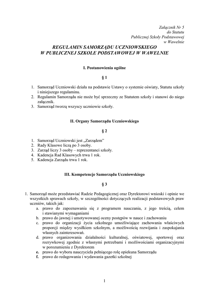 Załącznik Nr 5 do Statutu Publicznej Szkoły Podstawowej w Wawelnie REGULAMIN SAMORZĄDU UCZNIOWSKIEGO W PUBLICZNEJ SZKOLE PODSTAWOWEJ W WAWELNIE I. Postanowienia ogólne §1 1. Samorząd Uczniowski działa na podstawie Ustawy o systemie oświaty, Statutu szkoły i niniejszego regulaminu. 2. Regulamin Samorządu nie może być sprzeczny ze Statutem szkoły i stanowi do niego załącznik. 3. Samorząd tworzą wszyscy uczniowie szkoły. II. Organy Samorządu Uczniowskiego §2 1. 2. 3. 4. 5. Samorząd Uczniowski jest „Zarządem” Rady Klasowe liczą po 3 osoby. Zarząd liczy 3 osoby – reprezentanci szkoły. Kadencja Rad Klasowych trwa 1 rok. Kadencja Zarządu trwa 1 rok. III. Kompetencje Samorządu Uczniowskiego §3 1. Samorząd może przedstawiać Radzie Pedagogicznej oraz Dyrektorowi wnioski i opinie we wszystkich sprawach szkoły, w szczególności dotyczących realizacji podstawowych praw uczniów, takich jak: a. prawo do zapoznawania się z programem nauczania, z jego treścią, celem i stawianymi wymaganiami b. prawo do jawnej i umotywowanej oceny postępów w nauce i zachowaniu c. prawo do organizacji życia szkolnego umożliwiające zachowania właściwych proporcji między wysiłkiem szkolnym, a możliwością rozwijania i zaspokajania własnych zainteresowań. d. prawo organizowania działalności kulturalnej, oświatowej, sportowej oraz rozrywkowej zgodnie z własnymi potrzebami i możliwościami organizacyjnymi w porozumieniu z Dyrektorem e. prawo do wyboru nauczyciela pełniącego rolę opiekuna Samorządu f. prawo do redagowania i wydawania gazetki szkolnej 1 IV. Wybory do organów Samorządu Uczniowskiego §4 1. Wybory do organów Samorządu Uczniowskiego przeprowadzane są we wrześniu. 2. Wybory Rad Klasowych odbywają się w trybie i na warunkach ustalonych przez ogół uczniów danej klasy. 3. Wybory Zarządu są powszechne, równe i tajne. 4. W wyborach, z czynnym i biernym prawem wyborczym biorą udział wszyscy uczniowie szkoły. 5. Wybory przeprowadzają komisje wyborcze powołane przez Rady Klasowe na wspólnym zebraniu wyborczym. Rady Klasowe ustalają również termin, tryb i zasady przeprowadzenia wyborów Zarządu i zostaje on podany do ogólnej wiadomości. 6. W skład komisji wyborczej nie może wchodzić osoba kandydująca do Zarządu. 7. Zarząd wybiera ze swojego grona przewodniczącego, wiceprzewodniczącego, sekretarza wraz z funkcją skarbnika. V. Kompetencje władz Zarządu §5 1. Przewodniczący Zarządu organizuje prace zarządu, prowadzi posiedzenia i jest reprezentantem zarządu na zewnątrz. 2. Wiceprzewodniczący przejmuje obowiązki przewodniczącego w czasie jego nieobecności. 3. Sekretarz odpowiada za dokumentację Zarządu. 4. Skarbnik odpowiada za prawidłową gospodarkę funduszem Zarządu. VI. Posiedzenia Zarządu §6 1. Posiedzenia Zarządu odbywają się nie rzadziej niż raz na miesiąc, zgodnie z harmonogramem pracy Zarządu. 2. Przewodniczący może zwoływać posiedzenia Zarządu poza ustalonym harmonogramem, powiadamiając członków Zarządu co najmniej 7 dni przed terminem spotkania. 3. W uzasadnionych przypadkach przewodniczący może zwołać posiedzenie Zarządu w trybie pilnym bez przestrzegania 7-dniowego terminu. 4. Posiedzenia Zarządu mogą być również zwoływane w każdym czasie z inicjatywy 1/3 członków Zarządu oraz na wniosek Dyrektora szkoły, Rady pedagogicznej lub Rady Rodziców. 5. W posiedzeniach Zarządu może brać udział z głosem doradczym Dyrektor szkoły lub inne osoby zaproszone przez przewodniczącego za zgodą lub na wniosek Zarządu. 2 VII. Tryb podejmowania uchwał §7 1. Uchwały Zarządu podejmowane są zwykłą większością głosów w głosowaniu jawnym. 2. W sprawach personalnych lub na formalny wniosek przegłosowany przez członków Zarządu, głosowanie może odbyć się w trybie tajnym. 3. Zarząd dokonuje wyboru opiekuna Samorządu Uczniowskiego spośród członków Rady Pedagogicznej szkoły. 4. Kadencja opiekuna Samorządu Uczniowskiego trwa 1 rok. VIII. Prawa i obowiązki członków Zarządu §8 1. Członkowie Zarządu mają prawo do: a. wypowiadania własnej opinii na każdy omawiany temat b. głosowania na równych prawach we wszystkich decyzjach podejmowanych przez Zarząd 2. Członkowie Zarządu mają obowiązek aktywnego uczestniczenia w pracach Zarządu. Opiekun Samorządu uczniowskiego: Przewodniczący: Wiceprzewodniczący: Skarbnik z funkcjami sekretarza: mgr Wojciech Kowalik Julia Labisch Sara Major Dominika Cybulska 3