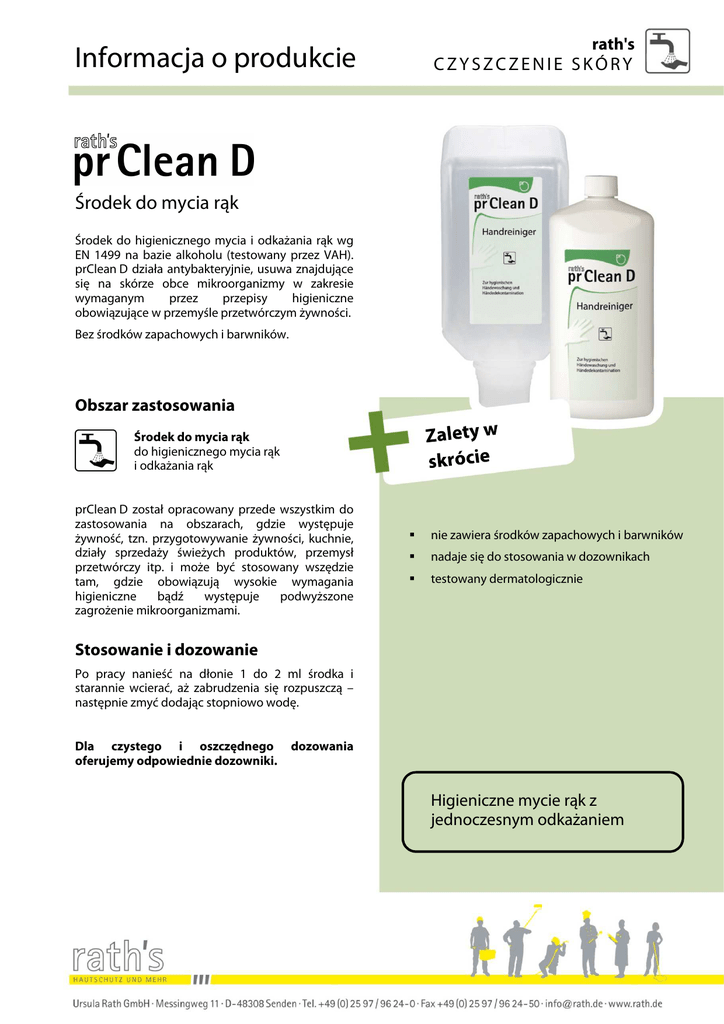 Informacja o produkcie rath's CZYSZCZENIE SKÓRY Środek do mycia rąk Środek do higienicznego mycia i odkażania rąk wg EN 1499 na bazie alkoholu (testowany przez VAH). prClean D działa antybakteryjnie, usuwa znajdujące się na skórze obce mikroorganizmy w zakresie wymaganym przez przepisy higieniczne obowiązujące w przemyśle przetwórczym żywności. Bez środków zapachowych i barwników. Obszar zastosowania Środek do mycia rąk do higienicznego mycia rąk i odkażania rąk prClean D został opracowany przede wszystkim do zastosowania na obszarach, gdzie występuje żywność, tzn. przygotowywanie żywności, kuchnie, działy sprzedaży świeżych produktów, przemysł przetwórczy itp. i może być stosowany wszędzie tam, gdzie obowiązują wysokie wymagania higieniczne bądź występuje podwyższone zagrożenie mikroorganizmami. nie zawiera środków zapachowych i barwników nadaje się do stosowania w dozownikach testowany dermatologicznie Stosowanie i dozowanie Po pracy nanieść na dłonie 1 do 2 ml środka i starannie wcierać, aż zabrudzenia się rozpuszczą – następnie zmyć dodając stopniowo wodę. Dla czystego i oszczędnego oferujemy odpowiednie dozowniki. dozowania Higieniczne mycie rąk z jednoczesnym odkażaniem Wskazówka dotycząca produktu Zawarta w prClean D substancja czynna propanol jest skutecznym mikrobicydem o szerokim spektrum działania zwalczającym bakterie gramdodatnie i gram-ujemne a także grzyby i pleśnie. Po wielokrotnym zastosowaniu prClean D wykazuje działanie remanentne, tzn. ma miedzy poszczególnymi zastosowaniami długotrwałe hamujące działanie na namnażanie się mikroorganizmów i dzięki temu ich poziom może zostać zredukowany w sposób trwały. Środki powierzchniowo czynne tworzą emulsję z przylegającymi do skóry zanieczyszczeniami i umożliwiają ich efektywne zmycie. prClean D jest przyjaznym dla skóry złożonym preparatem do higienicznego mycia i odkażania rąk. prClean D spełnia wymogi testu DGHM/VAH dla środków do odkażania rąk w ilości 3 ml i czasem kontaktu 30 sek. Działanie na skórę W teście Epikutan (mieszana grupa 50 uczestników o zdrowej i wrażliwej skórze, w tym alergicy, czas nakładania 48 godz.) po 48 i po 72 godzinach nie stwierdzono ani reakcji wątpliwych ani pozytywnych. Dane techniczne zapach: alkoholowy gęstość: 0,93 ± 0,02 g/cm³ lepkość: 2000 - 5000 mPa.s pH: 6,3 ± 0,2 mikrobiologia: < 100 CFU/g (20 °C) Składniki/Ingredients (INCI) Aqua, Propyl Alcohol, Disodium Cocoamphodipropionate, Didecyldimonium Chloride, Cocamine Oxide, Cellulose Gum, Citric Acid Środowisko Klasa zagrożenia wód 2 (wg przepisów dotyczących substancji szkodliwych dla wód VwVwS). Bezpieczeństwo i przepisy Zwroty R: R10 produkt łatwopalny Zwroty S: S7 przechowywać pojemnik szczelnie zamknięty S16 nie przechowywać w pobliżu źródeł zapłonu – nie palić tytoniu S62 W razie połknięcia nie wywoływać wymiotów, niezwłocznie zasięgnąć porady lekarza i pokazać opakowanie lub etykietę Przechowywanie/przydatność prClean D można przechowywać w temperaturze między 0 a 25° C. Minimalna trwałość zamkniętych opakowań wynosi 30 miesięcy. Opakowania Butelki 1 l Butelko soft 2 l Systemy dozowania Pomocy w doborze odpowiedniego systemu dozowania należy szukać w internecie na stronie www.rath.de – lub zatelefonować do nas – chętnie udzielimy odpowiednich porad.