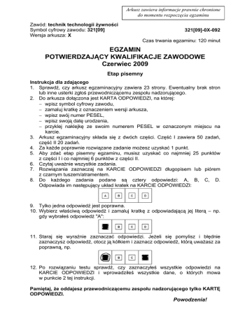 Arkusz zawiera informacje prawnie chronione do momentu rozpoczęcia egzaminu Zawód: technik technologii żywności Symbol cyfrowy zawodu: 321[09] Wersja arkusza: X 321[09]-0X-092 Czas trwania egzaminu: 120 minut EGZAMIN POTWIERDZAJĄCY KWALIFIKACJE ZAWODOWE Czerwiec 2009 Etap pisemny Instrukcja dla zdającego 1. Sprawdź, czy arkusz egzaminacyjny zawiera 23 strony. Ewentualny brak stron lub inne usterki zgłoś przewodniczącemu zespołu nadzorującego. 2. Do arkusza dołączona jest KARTA ODPOWIEDZI, na której: − wpisz symbol cyfrowy zawodu, − zamaluj kratkę z oznaczeniem wersji arkusza, − wpisz swój numer PESEL, − wpisz swoją datę urodzenia, − przyklej naklejkę ze swoim numerem PESEL w oznaczonym miejscu na karcie. 3. Arkusz egzaminacyjny składa się z dwóch części. Część I zawiera 50 zadań, część II 20 zadań. 4. Za każde poprawnie rozwiązane zadanie możesz uzyskać 1 punkt. 5. Aby zdać etap pisemny egzaminu, musisz uzyskać co najmniej 25 punktów z części I i co najmniej 6 punktów z części II. 6. Czytaj uważnie wszystkie zadania. 7. Rozwiązania zaznaczaj na KARCIE ODPOWIEDZI długopisem lub piórem z czarnym tuszem/atramentem. 8. Do każdego zadania podane są cztery odpowiedzi: A, B, C, D. Odpowiada im następujący układ kratek na KARCIE ODPOWIEDZI: 9. Tylko jedna odpowiedź jest poprawna. 10. Wybierz właściwą odpowiedź i zamaluj kratkę z odpowiadającą jej literą – np. gdy wybrałeś odpowiedź "A": 11. Staraj się wyraźnie zaznaczać odpowiedzi. Jeżeli się pomylisz i błędnie zaznaczysz odpowiedź, otocz ją kółkiem i zaznacz odpowiedź, którą uważasz za poprawną, np. 12. Po rozwiązaniu testu sprawdź, czy zaznaczyłeś wszystkie odpowiedzi na KARCIE ODPOWIEDZI i wprowadziłeś wszystkie dane, o których mowa w punkcie 2 tej instrukcji. Pamiętaj, że oddajesz przewodniczącemu zespołu nadzorującego tylko KARTĘ ODPOWIEDZI. Powodzenia! CZĘŚĆ I Zadanie 1. Substancję lub materiał otrzymane w wyniku przeprowadzonego procesu technologicznego, których produkcja nie jest zasadniczym celem tego procesu, zalicza się do A. półproduktów. B. produktów głównych. C. produktów ubocznych. D. materiałów pomocniczych. Zadanie 2. Który z elementów zapisu w numerze normy PN-86/A-74032 informuje, że jej przedmiotem jest produkt żywnościowy? A. PN B. 86 C. A D. 74032 Zadanie 3. Rysunek przedstawia kształt ziarna wykorzystywanego do produkcji A. kaszy manny. B. mąki pszennej. C. kaszy gryczanej. D. słodu browarniczego. Źródło: Bijok B., Bijok Fr. Surowce i technologia żywności. Cz. I, Warszawa 2000 Zadanie 4. Do jakiej produkcji należy zastosować surowiec, którego skład podano w tabeli? A. Mąki żytniej. B. Margaryny. C. Krochmalu. D. Piwa. Składnik woda skrobia błonnik białko tłuszcze związki mineralne Strona 2 z 23 Średnia zawartość w% 70-80 14-20 1-2 1-3 ok. 0,2 0.5-1,0 Zadanie 5. Polędwica, antrykot, szponder, rozbratel, rostbef to części zasadnicze półtuszy A. wieprzowej. B. wołowej. C. baraniej. D. cielęcej. Zadanie 6. W jakim celu w produkcji żywności stosowane są emulgatory? A. Utworzenia stabilnego żelu. B. Uzyskania ekstraktu spożywczego. C. Zwiększenia w produkcie ilości składników odżywczych. D. Wytworzenia stabilnego układu dwóch nierozpuszczalnych w sobie cieczy. Zadanie 7. Jak są oznakowane opakowania z tworzywa sztucznego dopuszczone do kontaktu z żywnością? A. B. C. D. Źródło: Dłużewski M., Dłużewska A. Technologia żywności Cz. I , Warszawa 2001 Zadanie 8. Jakie związki powierzchniowo czynne są podstawowym składnikiem środków myjących wykorzystywanych w przemyśle spożywczym? A. Mydła i detergenty. B. Związki zmiękczające wodę. C. Kwasy mineralne i organiczne. D. Zasady i sole metali alkalicznych. Strona 3 z 23 Zadanie 9. Produkt otrzymany z całych lub częściowo rozdrobnionych owoców, nasyconych cukrem i zawieszonych w galarecie owocowej, to A. dżem. B. powidła. C. galaretka. D. marmolada. Zadanie 10. Operacja drylowania polega na A. usuwaniu części niejadalnych z powierzchni ziemniaka. B. obrywaniu szypułek wiśni, czereśni, porzeczek. C. usuwaniu pestek z wiśni, czereśni i śliwek. D. obcinaniu końców strąków fasoli. Zadanie 11. Wydobywanie z mieszaniny stałej, płynnej lub gazowej określonego składnika za pomocą rozpuszczalnika nazywa się A. ekstruzją. B. ekstrakcją. C. destylacją. D. sedymentacją. Zadanie 12. Który proces, zastosowany w produkcji żywności, zapewni otrzymanie produktu instant, charakteryzującego się szybką, prawie natychmiastową rozpuszczalnością? A. Emulgowanie. B. Aglomerowanie. C. Homogenizacja. D. Ekspandowanie. Zadanie 13. W celu utwardzenia tłuszczów w produkcji margaryny, poddaje się je procesowi A. uwodornienia. B. neutralizacji. C. estryfikacji. D. hydrolizy. Strona 4 z 23 Zadanie 14. Która metoda utrwalania polega na w naczyniach hermetycznie zamkniętych? termicznym wyjaławianiu produktów A. Parzenie. B. Apertyzacja. C. Blanszowanie. D. Kriokoncentracja. Zadanie 15. Liofilizacja jest metodą utrwalania żywności polegającą na poddaniu produktu A. zamrożeniu i wysuszeniu przy obniżonym ciśnieniu. B. zakwaszeniu i pasteryzacji w opakowaniach. C. chłodzeniu i dodaniu konserwantów. D. zagęszczeniu i pasteryzacji. Zadanie 16. Biologiczne metody utrwalania, polegające na wytwarzaniu w procesie fermentacji związków działających konserwująco na żywność, znalazły zastosowanie w produkcji A. marynat grzybowych. B. kiszonek warzywnych. C. wyrobów ekstrudowanych. D. wyrobów ekspandowanych. Zadanie 17. Do rozdrabniania ziemniaków w krochmalni stosuje się A. tarki. B. kutry. C. mlewniki. D. krajalnice. Zadanie 18. Wirówki sedymentacyjne, zwane separatorami, wykorzystywane są w przemyśle spożywczym do A. mieszania ciał sypkich. B. segregowania i sortowania. C. rozdzielania mas półstałych – soczystych. D. rozdzielania zawiesin, emulsji lub fazy ciekłe