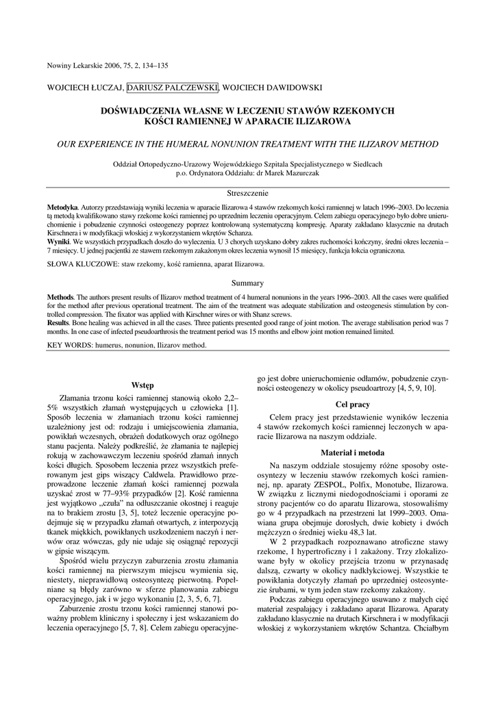 Nowiny Lekarskie 2006, 75, 2, 134–135 WOJCIECH ŁUCZAJ, DARIUSZ PALCZEWSKI, WOJCIECH DAWIDOWSKI DOŚWIADCZENIA WŁASNE W LECZENIU STAWÓW RZEKOMYCH KOŚCI RAMIENNEJ W APARACIE ILIZAROWA OUR EXPERIENCE IN THE HUMERAL NONUNION TREATMENT WITH THE ILIZAROV METHOD Oddział Ortopedyczno-Urazowy Wojewódzkiego Szpitala Specjalistycznego w Siedlcach p.o. Ordynatora Oddziału: dr Marek Mazurczak Streszczenie Metodyka. Autorzy przedstawiają wyniki leczenia w aparacie Ilizarowa 4 stawów rzekomych kości ramiennej w latach 1996–2003. Do leczenia tą metodą kwalifikowano stawy rzekome kości ramiennej po uprzednim leczeniu operacyjnym. Celem zabiegu operacyjnego było dobre unieruchomienie i pobudzenie czynności osteogenezy poprzez kontrolowaną systematyczną kompresję. Aparaty zakładano klasycznie na drutach Kirschnera i w modyfikacji włoskiej z wykorzystaniem wkrętów Schanza. Wyniki. We wszystkich przypadkach doszło do wyleczenia. U 3 chorych uzyskano dobry zakres ruchomości kończyny, średni okres leczenia – 7 miesięcy. U jednej pacjentki ze stawem rzekomym zakażonym okres leczenia wynosił 15 miesięcy, funkcja łokcia ograniczona. SŁOWA KLUCZOWE: staw rzekomy, kość ramienna, aparat Ilizarowa. Summary Methods. The authors present results of Ilizarov method treatment of 4 humeral nonunions in the years 1996–2003. All the cases were qualified for the method after previous operational treatment. The aim of the treatment was adequate stabilization and osteogenesis stimulation by controlled compression. The fixator was applied with Kirschner wires or with Shanz screws. Results. Bone healing was achieved in all the cases. Three patients presented good range of joint motion. The average stabilisation period was 7 months. In one case of infected pseudoarthrosis the treatment period was 15 months and elbow joint motion remained limited. KEY WORDS: humerus, nonunion, Ilizarov method. Wstęp Złamania trzonu kości ramiennej stanowią około 2,2– 5% wszystkich złamań występujących u człowieka [1]. Sposób leczenia w złamaniach trzonu kości ramiennej uzależniony jest od: rodzaju i umiejscowienia złamania, powikłań wczesnych, obrażeń dodatkowych oraz ogólnego stanu pacjenta. Należy podkreślić, że złamania te najlepiej rokują w zachowawczym leczeniu spośród złamań innych kości długich. Sposobem leczenia przez wszystkich preferowanym jest gips wiszący Caldwela. Prawidłowo przeprowadzone leczenie złamań kości ramiennej pozwala uzyskać zrost w 77–93% przypadków [2]. Kość ramienna jest wyjątkowo ,,czuła” na odłuszczanie okostnej i reaguje na to brakiem zrostu [3, 5], toteż leczenie operacyjne podejmuje się w przypadku złamań otwartych, z interpozycją tkanek miękkich, powikłanych uszkodzeniem naczyń i nerwów oraz wówczas, gdy nie udaje się osiągnąć repozycji w gipsie wiszącym. Spośród wielu przyczyn zaburzenia zrostu złamania kości ramiennej na pierwszym miejscu wymienia się, niestety, nieprawidłową osteosyntezę pierwotną. Popełniane są błędy zarówno w sferze planowania zabiegu operacyjnego, jak i w jego wykonaniu [2, 3, 5, 6, 7]. Zaburzenie zrostu trzonu kości ramiennej stanowi poważny problem kliniczny i społeczny i jest wskazaniem do leczenia operacyjnego [5, 7, 8]. Celem zabiegu operacyjne- go jest dobre unieruchomienie odłamów, pobudzenie czynności osteogenezy w okolicy pseudoartrozy [4, 5, 9, 10]. Cel pracy Celem pracy jest przedstawienie wyników leczenia 4 stawów rzekomych kości ramiennej leczonych w aparacie Ilizarowa na naszym oddziale. Materiał i metoda Na naszym oddziale stosujemy różne sposoby osteosyntezy w leczeniu stawów rzekomych kości ramiennej, np. aparaty ZESPOL, Polfix, Monotube, Ilizarowa. W związku z licznymi niedogodnościami i oporami ze strony pacjentów co do aparatu Ilizarowa, stosowaliśmy go w 4 przypadkach na przestrzeni lat 1999–2003. Omawiana grupa obejmuje dorosłych, dwie kobiety i dwóch mężczyzn o średniej wieku 48,3 lat. W 2 przypadkach rozpoznawano atroficzne stawy rzekome, 1 hypertroficzny i 1 zakażony. Trzy zlokalizowane były w okolicy przejścia trzonu w przynasadę dalszą, czwarty w okolicy nadkłykciowej. Wszystkie te powikłania dotyczyły złamań po uprzedniej osteosyntezie śrubami, w tym jeden staw rzekomy zakażony. Podczas zabiegu operacyjnego usuwano z małych cięć materiał zespalający i zakładano aparat Ilizarowa. Aparaty zakładano klasycznie na drutach Kirschnera i w modyfikacji włoskiej z wykorzystaniem wkrętów Schantza. Chciałbym Doświadczenia własne w leczeniu stawów rzekomych kości ramiennej w aparacie Ilizarowa zwrócić uwagę, że zastosowanie grotów Schantza bardzo ułatwia założenie aparatu i jest lepiej tolerowane przez chorego. Dodatkowo ujmowano jednym, bądź dwoma drutami na półokręgu kość łokciową, dla lepszej stabilizacji krótkiego odłamu obwodowego. W przypadku zakażonego stawu rzekomego w okolicy nadkłykciowej wykonano resekcję ogniska ropnego i drenaż przepływowy. Jako leczenie wspomagające stosowano autoszczepionkę. Podczas operacji dążono do jak najbardziej korzystnego ustawienia odłamów, dalszą korekcję wykonywano w sposób typowy dla metody Ilizarowa w okresie pooperacyjnym w tempie 1 mm na dobę. Po osiągnięciu korekcji osi pacjentów wypisywano do domu. Kompresja podtrzymująca 1 mm na 2 tyg. Sposób kompresji nie był opracowany w specjalny sposób. Postępowanie takie wynikało z przyczyn niemedycznych – kłopot z częstymi wizytami pacjentów zamieszkujących z dala od naszego szpitala. Pacjenci kontrolowani byli przez jednego lekarza, który wykonywał kompresję. Unieruchomienie stawu łokciowego likwidowano w przypadku stwierdzenia radiologicznych cech zrostu kostnego. Średni czas leczenia wynosił 7 miesięcy, z wyjątkiem zakażonego stawu rzekomego (15 miesięcy). Wyniki We wszystkich przypadkach doszło do zrostu kostnego i wyleczenia zapalenia kości u czwartej pac