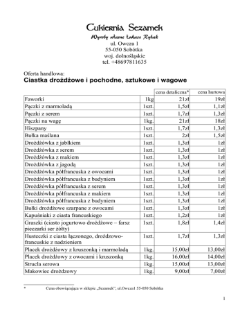 Cukiernia Sezamek Wyroby własne Łukasz Rybak ul. Owcza 1 55-050 Sobótka woj. dolnośląskie tel. +48697811635 Oferta handlowa: Ciastka drożdżowe i pochodne, sztukowe i wagowe Faworki Pączki z marmoladą Pączki z serem Pączki na wagę Hiszpany Bułka maślana Drożdżówka z jabłkiem Drożdżówka z serem Drożdżówka z makiem Drożdżówka z jagodą Drożdżówka półfrancuska z owocami Drożdżówka półfrancuska z budyniem Drożdżówka półfrancuska z serem Drożdżówka półfrancuska z makiem Drożdżówka półfrancuska z budyniem Bułki drożdżowe szarpane z owocami Kapuśniaki z ciasta francuskiego Graszki (ciasto jogurtowo drożdżowe – farsz pieczarki ser żółty) Husteczki z ciasta łączonego, drożdzowofrancuskie z nadzieniem Placek drożdżowy z kruszonką i marmoladą Placek drożdżowy z owocami i kruszonką Strucla serowa Makowiec drożdzowy * cena detaliczna* cena hurtowa 1kg 1szt. 1szt. 1kg. 1szt. 1szt. 1szt. 1szt. 1szt. 1szt. 1szt. 1szt. 1szt. 1szt. 1szt. 1szt. 1szt. 1szt. 21zł 1,5zł 1,7zł 21zł 1,7zł 2zł 1,3zł 1,3zł 1,3zł 1,3zł 1,3zł 1,3zł 1,3zł 1,3zł 1,3zł 1,3zł 1,2zł 1,8zł 19zł 1,1zł 1,3zł 18zł 1,3zł 1,5zł 1zł 1zł 1zł 1zł 1zł 1zł 1zł 1zł 1zł 1zł 1zł 1,4zł 1szt. 1,7zł 1,3zł 1kg. 1kg. 1kg. 1kg. 15,00zł 16,00zł 15,00zł 9,00zł 13,00zł 14,00zł 13,00zł 7,00zł Cena obowiązująca w sklepie „Sezamek”, ul.Owcza1 55-050 Sobótka 1 Cukiernia Sezamek Wyroby własne Łukasz Rybak ul. Owcza 1 55-050 Sobótka woj. dolnośląskie tel. +48697811635 Oferta handlowa: Herbatniki Herbatniki gwiazdki Herbatniki maczki Herbatniki anatolki Herbatniki baletki Herbatniki duńskie Helenki Francuskie Cześka Zazolki Babeczki serowo - owocowe Rogaliki makowe Rogaliki półfrancuskie z marmoladą Rogaliki francuskie brzoskwinia budyń Rogaliki kruche z cukrem Sezamki w miodzie Kokosanki z bejcy Mini eklerki * cena detaliczna* cena hurtowa 18zł 18zł 18zł 18zł 19zł 18zł 20zł 20zł 21zł 21zł 19zł 15zł 19zł 20zł 21zł 16zł 16zł 16zł 16zł 17zł 16zł 18zł 18zł 19zł 19zł 17zł 13zł 17zł 18zł 19zł 1kg 1kg 1kg 1kg 1kg 1kg 1kg 1kg 1kg 1kg 1kg 1kg 1kg 1kg 1kg Cena obowiązująca w sklepie „Sezamek”, ul.Owcza1 55-050 Sobótka 2 Cukiernia Sezamek Wyroby własne Łukasz Rybak ul. Owcza 1 55-050 Sobótka woj. dolnośląskie tel. +48697811635 Oferta handlowa: Ciasta pieczone z blachy Makowiec na kruchym spodzie Jabłecznik tradycyjny Jabłecznik z pianką Sernik krakowski Sernik brzoskwiniowy Sernik z wiśnią Sernik warszawski Sernik domowy na kruchym spodzie Sernik babuni Ciasta biszkoptowo-tłuszczowe owocowe (rabarbar, truskawka, śliwka, jagoda, gruszka) Placek kruchy ze śliwką Murzynek z serem Babka marmurkowa Babka piaskowa * cena detaliczna* cena hurtowa 1kg 1kg 1kg 1kg 1kg 1kg 1kg 1kg 1kg 1kg 19zł 19zł 21zł 20zł 21zł 21zl 20zł 21zł 22zł 22zł 17zł 17zł 19zł 18zł 19zł 19zł 18zł 19zł 20zł 20zł 1kg 1kg 1kg 1kg 19zł 19zł 20zł 19zł 17zł 17zł 18zł 17zł Cena obowiązująca w sklepie „Sezamek”, ul.Owcza1 55-050 Sobótka 3 Cukiernia Sezamek Wyroby własne Łukasz Rybak ul. Owcza 1 55-050 Sobótka woj. dolnośląskie tel. +48697811635 Oferta handlowa: Ciasta deserowe wagowe Węgierskie Orzechowe Szwarcwald Krakers Krówka Toffi Pijak Szachownica Kukułka Maskarpone Rolada owocowa mieszana Rolada z galaretką Rolada śmietanowa Rolada kremowa * cena detaliczna* cena hurtowa 23zł 24zł 23zł 22zł 22zł 23zł 24zł 23zł 23zł 24zł 23zł 22zł 24zł 23zł 20zł 21zł 20zł 19zł 19zł 20zł 21zł 20zł 20zł 21zł 20zł 19zł 21zł 20zł 1kg 1kg 1kg 1kg 1kg 1kg 1kg 1kg 1kg 1kg 1kg 1kg 1kg 1kg Cena obowiązująca w sklepie „Sezamek”, ul.Owcza1 55-050 Sobótka 4 Cukiernia Sezamek Wyroby własne Łukasz Rybak ul. Owcza 1 55-050 Sobótka woj. dolnośląskie tel. +48697811635 Oferta handlowa: Ciasta deserowe sztukowe Bristolka w biszkopcie Camargo Edenka Węgierskie Orzechowe Tortoletka Tiramisu Miodunki Krówka Toffi Tunelka Kremówka Napoleonka Eklerka Ptyś Kokosanki na kruchym spodzie Beza z owocami Omlety * cena detaliczna* cena hurtowa 2,5zł 2,5zł 2,6zł 2,6zł 2,5zł 2,7zł 2,5zł 2,5zł 2,6zł 2,5zł 2,6zł 2,4zł 2,4zł 2,4zł 2,6zł 2,6zł 2,4zł 2,1zł 2,1zł 2,2zł 2,2zł 2,1zł 2,3zł 2,1zł 2,1zł 2,2zł 2,1zł 2,2zł 2 zł 2 zł 2 zł 2,2zł 2,2zł 2 zł 1 szt. 1 szt. 1 szt. 1 szt. 1 szt. 1 szt. 1 szt. 1 szt. 1 szt. 1 szt. 1 szt. 1 szt. 1 szt. 1 szt. 1 szt. 1 szt. 1 szt. Cena obowiązująca w sklepie „Sezamek”, ul.Owcza1 55-050 Sobótka 5 Cukiernia Sezamek Wyroby własne Łukasz Rybak ul. Owcza 1 55-050 Sobótka woj. dolnośląskie tel. +48697811635 Oferta handlowa: Torty Tort śmietanowy Tort śmietanowo-owocowy Tort czekoladowy Tort czekoladowo-waniliowy Tort Capuccino Tort toffi Tort orzechowy Tort migdałowy Tort Sachera Tort bezowy Tort cytrynowy Tort węgierski Tort adwokat Tort angielski * cena detaliczna* cena hurtowa 32zł 32zł 32zł 32zł 32zł 45zł 45zł 45zł 45zł 45zł 45zł 45zł 45zł 50zł 29zł 29zł 29zł 29zł 29zł 41zł 41zł 41zł 41zł 41zł 41zł 41zł 41zł 46zł 1kg 1kg 1kg 1kg 1kg 1kg 1kg 1kg 1kg 1kg 1kg 1kg 1kg 1kg Cena obowiązująca w sklepie „Sezamek”, ul.Owcza1 55-050 Sobótka 6