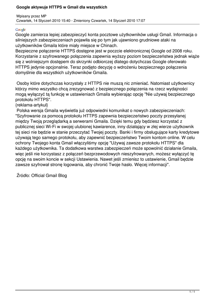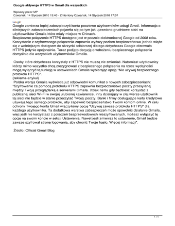 Bezpieczne połączenie HTTPS dostępne jest w poczcie elektronicznej Google od 2008 roku.