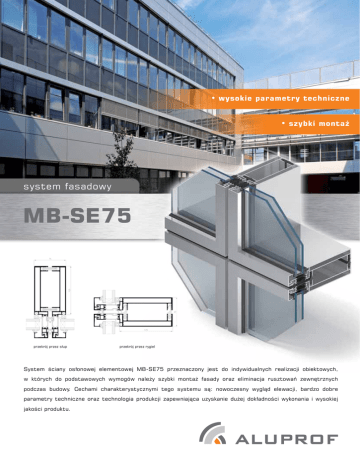 • wysokie parametry techniczne • szybki montaż system fasadowy MB-SE75 przekrój przez słup przekrój przez rygiel System ściany osłonowej elementowej MB-SE75 przeznaczony jest do indywidualnych realizacji obiektowych, w których do podstawowych wymogów należy szybki montaż fasady oraz eliminacja rusztowań zewnętrznych podczas budowy. Cechami charakterystycznymi tego systemu są: nowoczesny wygląd elewacji, bardzo dobre parametry techniczne oraz technologia produkcji zapewniająca uzyskanie dużej dokładności wykonania i wysokiej jakości produktu. MB-SE75 / MB-SE75 HI System MB-SE75 składa się z elementów umożliwiających uzyskanie konstrukcji ściany modułowej słupowo-ryglowej, całkowicie prefabrykowanej w warunkach warsztatowych. Segmenty dostarczane są na plac budowy w postaci gotowych zaszklonych modułów a następnie mocowane do konstrukcji nośnej budynku i łączone pomiędzy sobą. System posiada wersję o podwyższonej izolacyjności termicznej MB-SE75 HI. FUNKCJONALNOŚĆ I ESTETYKA • wysoka estetyka fasady - widok pojedynczych modułów oddzielonych wąskimi, 9 mm szczelinami DANE TECHNICZNE MB-SE75 / MB-SE75 HI Głębokość słupów 85 - 145 mm Głębokość rygli 84,5 - 144,5 mm Sztywność słupów (współczynnik Ix) 101,2 - 366,1 cm4 Sztywność rygli (współczynnik Ix) 143,1 - 523,7 cm4 Grubość szklenia (mm) 24 - 42 mm PARAMETRY TECHNICZNE MB-SE75 / MB-SE75 HI Przepuszczalność powietrza klasa AE1200 EN 12153:2003; EN 12152:2004 Odporność na obciążenie wiatrem 2400 Pa EN 12179:2002U; EN 13116:2002U Odporność na uderzenie klasa I5/E5 EN 14019:2004 Wodoszczelność klasa RE1200 EN 12155:2003; EN 12154:2004 Izolacyjność termiczna (Uf) od 1,5 W/(m2K) Izolacyjność akustyczna (Rw) do 40 dB ALUPROF S.A. ul. Warszawska 153, 43-300 Bielsko-Biała, Polska tel. +48 33 81 95 300, fax +48 33 82 20 512 e-mail: [email protected] www.aluprof.eu PL-03.2011 • szeroka gama elementów otwieranych w fasadzie: okna i drzwi w systemach o wysokiej izolacyjności termicznej, okna z ukrytym skrzydłem MB-70US, MB-70US HI lub w wersji MB-70SG, a także “bezramowe” konstrukcje odchylane na zewnątrz, oparte na systemie strukturalnym MB-SG50
