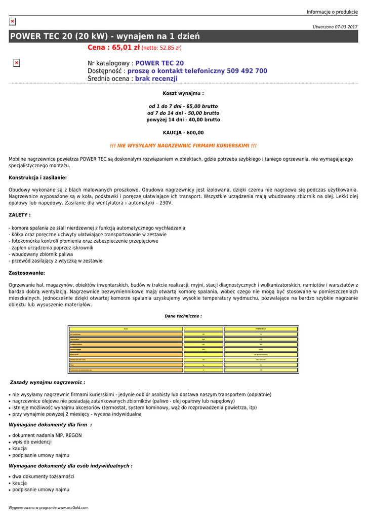 Informacje o produkcie Utworzono 07-03-2017 POWER TEC 20 (20 kW) - wynajem na 1 dzień Cena : 65,01 zł (netto: 52,85 zł) Nr katalogowy : POWER TEC 20 Dostępność : proszę o kontakt telefoniczny 509 492 700 Średnia ocena : brak recenzji Koszt wynajmu : od 1 do 7 dni - 65,00 brutto od 7 do 14 dni - 50,00 brutto powyżej 14 dni - 40,00 brutto KAUCJA - 600,00 !!! NIE WYSYŁAMY NAGRZEWNIC FIRMAMI KURIERSKIMI !!! Mobilne nagrzewnice powietrza POWER TEC są doskonałym rozwiązaniem w obiektach, gdzie potrzeba szybkiego i taniego ogrzewania, nie wymagającego specjalistycznego montażu. Konstrukcja i zasilanie: Obudowy wykonane są z blach malowanych proszkowo. Obudowa nagrzewnicy jest izolowana, dzięki czemu nie nagrzewa się podczas użytkowania. Nagrzewnice wyposażone są w koła, podstawki i poręcze ułatwiające ich transport. Wszystkie urządzenia mają wbudowany zbiornik na olej. Lekki olej opałowy lub napędowy. Zasilanie dla wentylatora i automatyki - 230V. ZALETY : - komora spalania ze stali nierdzewnej z funkcją automatycznego wychładzania - kółka oraz poręczne uchwyty ułatwiające transportowanie w zestawie - fotokomórka kontroli płomienia oraz zabezpieczenie przepięciowe - zapłon urządzenia poprzez iskrownik - wbudowany zbiornik paliwa - przewód zasilający z wtyczką w zestawie Zastosowanie: Ogrzewanie hal, magazynów, obiektów inwentarskich, budów w trakcie realizacji, myjni, stacji diagnostycznych i wulkanizatorskich, namiotów i warsztatów z bardzo dobrą wentylacją. Nagrzewnice bezwymiennikowe mają otwartą komorę spalania, wobec czego nie mogą być stosowane w pomieszczeniach mieszkalnych. Jednocześnie dzięki otwartej komorze spalania uzyskujemy wysokie temperatury wydmuchu, pozwalające na bardzo szybkie nagrzanie obiektu lub wysuszenie materiałów. Dane techniczne : POWER TEC 20 MODEL Moc znamionowa Zużycie paliwa kW 20 kg/h 1,85 Przepływ powietrza m/h 560 Napięcie zasilania V/Hz 230/50 Rodzaj paliwa Wymiary (dł x szer x wys) olej opałowy/napędowy mm 832 x 470 x 517 Waga kg 24 Przeznaczona do pomieszczenia max m 150 Zasady wynajmu nagrzewnic : ● ● ● ● nie wysyłamy nagrzewnic firmami kurierskimi - jedynie odbiór osobisty lub dostawa naszym transportem (odpłatnie) nagrzewnice olejowe nie posiadają zatankowanych zbiorników (paliwo - olej opałowy lub napędowy) istnieje możliwość wynajmu akcesoriów (termostat, system kominowy, wąż do rozprowadzenia powietrza, itp) przy wynajmie powyżej 2 miesięcy - wycena indywidualna Wymagane dokumenty dla firm : ● ● ● ● dokument nadania NIP, REGON wpis do ewidencji kaucja podpisanie umowy najmu Wymagane dokumenty dla osób indywidualnych : ● ● ● dwa dokumenty tożsamości kaucja podpisanie umowy najmu Wygenerowano w programie www.oscGold.com Dla stałych i sprawdzonych klientów procedury uproszczone oraz brak kaucji. Koszt dostawy i odbioru : ● ● na terenie miasta Poznania 60,00 netto poza miastem 1,50 netto/km Godziny oraz termin dostawy do uzgodnienia. !!! NOWOŚĆ !!!! Świadczymy również usługi ogrzewania hal namiotowych. Wyceny indywidualne