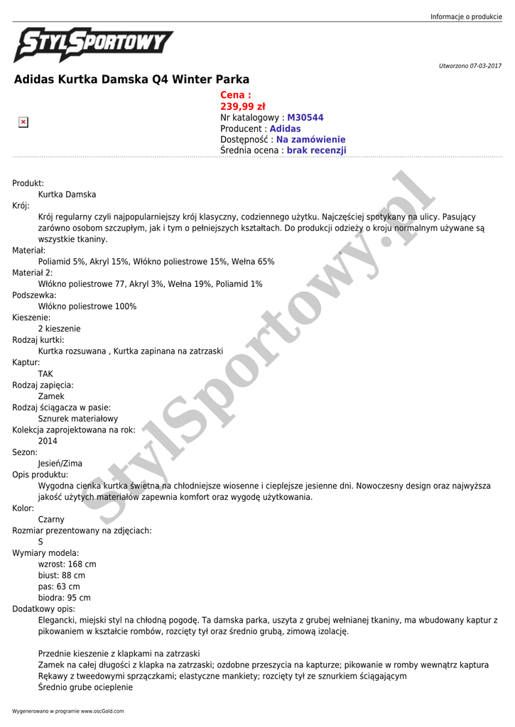 Informacje o produkcie Utworzono 07-03-2017 Adidas Kurtka Damska Q4 Winter Parka Cena : 239,99 zł Nr katalogowy : M30544 Producent : Adidas Dostępność : Na zamówienie Średnia ocena : brak recenzji St y lS p or to w y. pl Produkt: Kurtka Damska Krój: Krój regularny czyli najpopularniejszy krój klasyczny, codziennego użytku. Najczęściej spotykany na ulicy. Pasujący zarówno osobom szczupłym, jak i tym o pełniejszych kształtach. Do produkcji odzieży o kroju normalnym używane są wszystkie tkaniny. Materiał: Poliamid 5%, Akryl 15%, Włókno poliestrowe 15%, Wełna 65% Materiał 2: Włókno poliestrowe 77, Akryl 3%, Wełna 19%, Poliamid 1% Podszewka: Włókno poliestrowe 100% Kieszenie: 2 kieszenie Rodzaj kurtki: Kurtka rozsuwana , Kurtka zapinana na zatrzaski Kaptur: TAK Rodzaj zapięcia: Zamek Rodzaj ściągacza w pasie: Sznurek materiałowy Kolekcja zaprojektowana na rok: 2014 Sezon: Jesień/Zima Opis produktu: Wygodna cienka kurtka świetna na chłodniejsze wiosenne i cieplejsze jesienne dni. Nowoczesny design oraz najwyższa jakość użytych materiałów zapewnia komfort oraz wygodę użytkowania. Kolor: Czarny Rozmiar prezentowany na zdjęciach: S Wymiary modela: wzrost: 168 cm biust: 88 cm pas: 63 cm biodra: 95 cm Dodatkowy opis: Elegancki, miejski styl na chłodną pogodę. Ta damska parka, uszyta z grubej wełnianej tkaniny, ma wbudowany kaptur z pikowaniem w kształcie rombów, rozcięty tył oraz średnio grubą, zimową izolację. Przednie kieszenie z klapkami na zatrzaski Zamek na całej długości z klapka na zatrzaski; ozdobne przeszycia na kapturze; pikowanie w romby wewnątrz kaptura Rękawy z tweedowymi sprzączkami; elastyczne mankiety; rozcięty tył ze sznurkiem ściągającym Średnio grube ocieplenie Wygenerowano w programie www.oscGold.com Wyszywane detale; standardowy krój M30544 Dostępne opcje Adidas Kurtka Damska Q4 Winter Parka St y lS p or to w y. pl Rozmiar: 36, 38, 40.