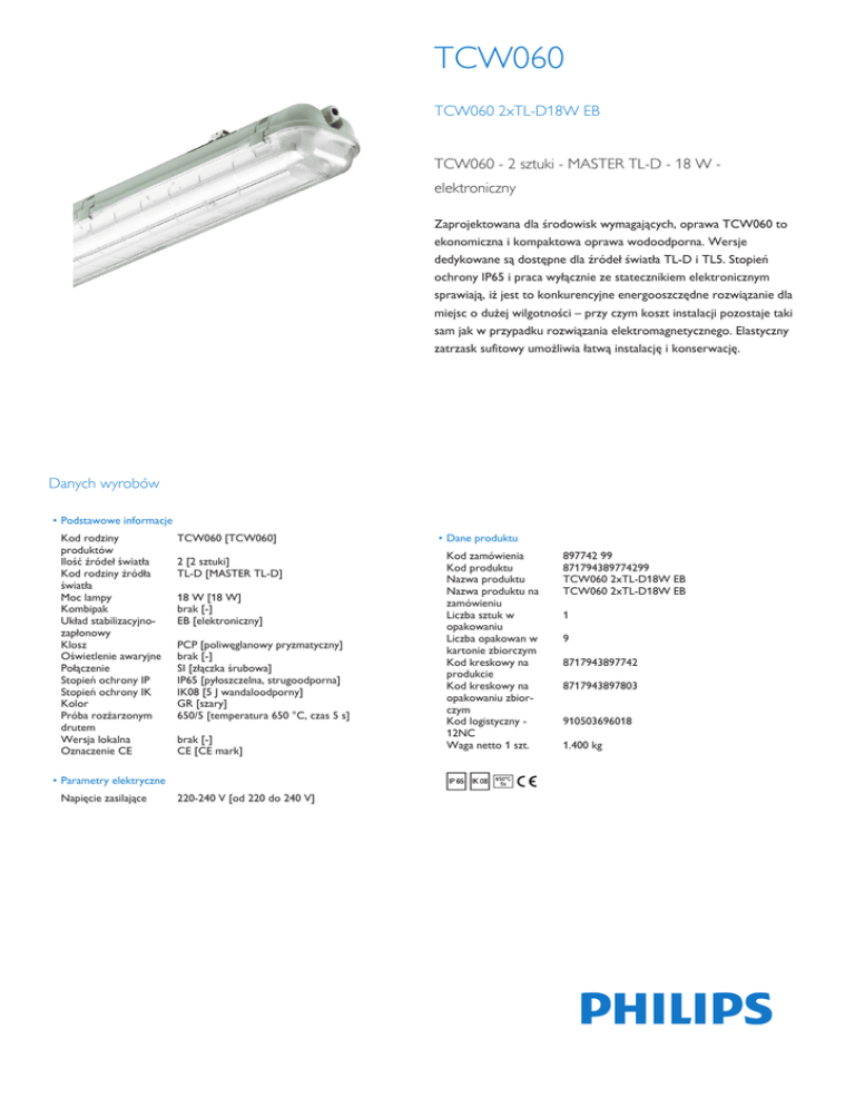TCW060 TCW060 2xTL-D18W EB TCW060 - 2 sztuki - MASTER TL-D - 18 W elektroniczny Zaprojektowana dla środowisk wymagających, oprawa TCW060 to ekonomiczna i kompaktowa oprawa wodoodporna. Wersje dedykowane są dostępne dla źródeł światła TL-D i TL5. Stopień ochrony IP65 i praca wyłącznie ze statecznikiem elektronicznym sprawiają, iż jest to konkurencyjne energooszczędne rozwiązanie dla miejsc o dużej wilgotności – przy czym koszt instalacji pozostaje taki sam jak w przypadku rozwiązania elektromagnetycznego. Elastyczny zatrzask sufitowy umożliwia łatwą instalację i konserwację. Danych wyrobów • Podstawowe informacje Kod rodziny produktów Ilość źródeł światła Kod rodziny źródła światła Moc lampy Kombipak Układ stabilizacyjnozapłonowy Klosz Oświetlenie awaryjne Połączenie Stopień ochrony IP Stopień ochrony IK Kolor Próba rozżarzonym drutem Wersja lokalna Oznaczenie CE TCW060 [TCW060] 2 [2 sztuki] TL-D [MASTER TL-D] 18 W [18 W] brak [-] EB [elektroniczny] PCP [poliwęglanowy pryzmatyczny] brak [-] SI [złączka śrubowa] IP65 [pyłoszczelna, strugoodporna] IK08 [5 J wandaloodporny] GR [szary] 650/5 [temperatura 650 °C, czas 5 s] brak [-] CE [CE mark] • Parametry elektryczne Napięcie zasilające 220-240 V [od 220 do 240 V] • Dane produktu Kod zamówienia Kod produktu Nazwa produktu Nazwa produktu na zamówieniu Liczba sztuk w opakowaniu Liczba opakowan w kartonie zbiorczym Kod kreskowy na produkcie Kod kreskowy na opakowaniu zbiorczym Kod logistyczny 12NC Waga netto 1 szt. 897742 99 871794389774299 TCW060 2xTL-D18W EB TCW060 2xTL-D18W EB 1 9 8717943897742 8717943897803 910503696018 1.400 kg TCW060 Rysunki techniczne TCW060 2xTL-D18W EB © 2014 Koninklijke Philips N.V. (Royal Philips) Wszelkie prawa zastrzeżone Dane mogą ulec zmianie bez uprzedniego powiadomienia. Znak towarowy jest własnością Koninklijke Philips N.V. (Royal Philips) lub odpowiednich podmiotów . www.philips.pl/lighting 2014, Listopad 19 Dane wkrótce ulegną zmianie