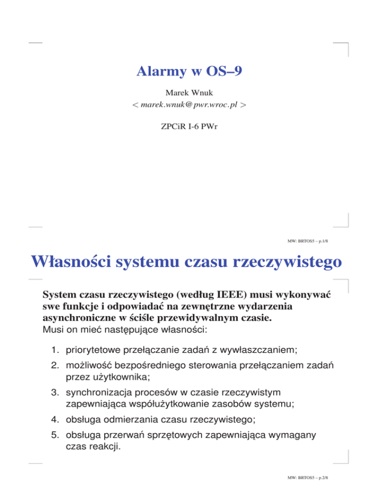 Alarmy w OS–9 Marek Wnuk < [email protected] > ZPCiR I-6 PWr MW: BRTOS5 – p.1/8 Własności systemu czasu rzeczywistego System czasu rzeczywistego (według IEEE) musi wykonywać swe funkcje i odpowiadać na zewn˛etrzne wydarzenia asynchroniczne w ściśle przewidywalnym czasie. Musi on mieć nastepuj ˛ ace ˛ własności: 1. priorytetowe przełaczanie ˛ zadań z wywłaszczaniem; 2. możliwość bezpośredniego sterowania przełaczaniem ˛ zadań przez użytkownika; 3. synchronizacja procesów w czasie rzeczywistym zapewniajaca ˛ współużytkowanie zasobów systemu; 4. obsługa odmierzania czasu rzeczywistego; 5. obsługa przerwań sprz˛etowych zapewniajaca ˛ wymagany czas reakcji. MW: BRTOS5 – p.2/8 Odmierzanie czasu w systemie OS–9 Funkcje modułu clock (jednorazowo, przy starcie systemu): inicjalizacja sprz˛etu generujacego ˛ przerwanie cykliczne (tick); inicjalizacja zmiennych systemowych: D_TckSec - ilość taktów na sekunde, ˛ D_Tick - numer bieżacego ˛ taktu; instalacja procedury obsługi przerwania cyklicznego (zegarowego). Funkcje procedury obsługi przerwania zegarowego: obsługa sprz˛etu generujacego ˛ przerwanie cykliczne (tick); wywołanie systemowej procedury obsługi zegara w module kernel (adres w D_Clock). MW: BRTOS5 – p.3/8 Usługi zwiazane ˛ z odmierzaniem czasu F$Sleep – deaktywacja (uśpienie) procesu na zadana˛ ilość taktów zegara (ticks); Parametry: d0.l = zadana ilość taktów Wynik: d0.l = ilość pozostałych taktów przy za wczesnym obudzeniu F$Alarm – utworzenie timer-a w celu wysłania sygnału do procesu po uplywie zadanego czasu. Parametry: d0.l = identyfikator alarmu (id) d1.w = kod funkcji alarmu d2.l = kod sygnału d3.l = interwał lub czas alarmu d0.l = data alarmu Wynik: d0.l = identyfikator alarmu (id) MW: BRTOS5 – p.4/8 Funkcje obsługi alarmów w OS–9 Nazwa funkcja w C Opis A$Set alm_set(sc, tim) ustawienie alarmu wzgled˛ nego z sygnałem sc po czasie tim A$Cycle alm_cycle(sc, tim) ustawienie alarmu cyklicznego sc z interwałem tim A$AtDate alm_atdate(sc, tim, dat) ustawienie alarmu bezwzled˛ nego sc w/g czasu gregoriańskiego (00HHMMSS, YYYYMMDD) A$AtJul alm_atjul(sc, tim, dat) ustawienie alarmu bezwzled˛ nego sc w/g czasu juliańskiego (sekundy od północy, dzień od roku -4712) A$Delete alm_delete( id ) usuniecie ˛ alarmu o numerze id MW: BRTOS5 – p.5/8 Watek ˛ alarmu (Thread Execution Block) adr. asm znaczenie 00 T_ID zarezerwowane 02 T_Proc Identyfikator procesu–właściciela 04 T_MSiz Wielkość pamieci ˛ watku ˛ 08 T_User Numer użytkownika 0C T_Next Wskaźnik na nastepny ˛ blok opisu watku ˛ (lista uporzadkowana ˛ według czasu budzenia) 10 T_Prev Wskaźnik na poprzedni blok opisu watku ˛ 14 T_Link Wskaźniki listy watków ˛ pokrewnych 1C T_Cycle Okres dla alarmu cyklicznego 20 T_WkTime Czas obudzenia 24 T_WkDate Data obudzenia 28 2C zarezerwowane T_Regs Obraz rejestrów procesora MW: BRTOS5 – p.6/8 Obsługa funkcji czasowych Przerwanie zegarowe budzi Proces Systemowy (ID = 1) o najwyższym z możliwych priorytecie (P$Prio = 65535). Proces Systemowy: 1. Sprawdza kolejk˛e procesów śpiacych ˛ (zagnieżdżona˛ w D_SleepQ), i budzi (F$AProc) odpowiednie procesy. 2. Obsługuje alarmy wzgledne ˛ i cykliczne (lista zagnieżdżona w D_AlarTh): Jeśli T_WkTime ≤ D_Tick to: - watek ˛ alarmu jednokrotnego jest uruchamiany i kasowany; - watek ˛ alarmu cyklicznego jest uruchamiany i regenerowany: T_WkTime += T_Cycle. 3. Obsługuje alarmy bezwzgledne ˛ (lista zagnieżdżona w D_Thread): Jeśli T_WkDate:T_WkTime ≤ D_Julian:D_Second to watek ˛ jest uruchamiany i kasowany. MW: BRTOS5 – p.7/8 Przykład użycia alarmu cyklicznego #include <stdio.h> #include <errno.h> #include <signal.h> main(int argc, char *argv[]){ int a_ID, i=1; if(argc<2) return(-1); sscanf(argv[1],"%d",&i); if((a_ID = alm_cycle (SIGWAKE,(1<<31)|256*i))==-1) exit(_errmsg(errno," can’t install alarm\n")); printf("almcycle, alarm_ID=0x%06x\n", a_ID); while(1) { sleep(0); system("date"); } } MW: BRTOS5 – p.8/8