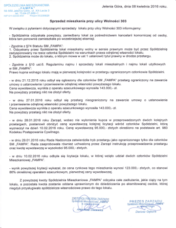 SPÓŁDZ| E LN lA M l ESZKAN loWA Jelenia Góra, dnia 08 kwietnia 2016 roku. ,,FAMPA'' 58-560 Jelenia Góra, ul' XX-Lecia 3 tei. 7 5-64-27 -860"1 Flerqon00329902B Ntp611-02-03-492 Sprzedaż mieszkania przy ulicy Wolności 303 W związku z pytaniami dotyczącymi sprzedazy lokalu pzy ulicy Wolności 303 informujemy: _ Społdzielnia odzyskała powyŻszy, zaniedbany lokal za pośrednictwem kancelarii komorniczej od osoby, ktora tam ponownie zamieszkała po wcześniejszej eksmisji. SM ,,FAMPA": 1. odzyskany przez Spółdzielnię lokal mieszkalny wolny w sensie prawnym może byc przez Spółdzielnię zadysponowany na rzecz członka Społdzielni na warunkach prawa odrębnejwłasnościlokalu. 2. Spółdzielnia moze do lokalu, o którym mowa w ust 1 ustanowić tytuł prawny w drodze przetargu. - Zgodnie z $74 Statutu - Zgodnie z $10 ust.6. Regulaminu najmu isprzedaży lokali mieszkalnych inajmu lokali uzytkowych w SM ,,FAMPA": Prawo kupna wolnego lokalu mają w pienłvszej kolejnościwprzetargu ograniczonym członkowie Społdzielni. - w dniu 21'12'2015 roku odbył się ogłoszony dla członkÓw SM,,FAMPA'' przetarg ograniczony na zawarcie umowy o ustanowienie i przeniesienie odrębnejwłasnoŚci powyzszego |okalu. Cena wywoławcza, wynikła z operatu szacunkowego Wynosiła 143'000,- zł. Na powyzszy pzetarg nikt nie złoŻyłoferty. o - W dniu 27.01.2016 roku odbył się przetarg nieograniczony na zawarcie umowy _ w dniu 28.01.2016 roku Zarząd, wobec nie wyłonienia kupca W przeprowadzonych dwóch i przeniesienie odrębnej własnościpowyŻszego lokalu. Cena wywoławcza wynikła z operatu szacunkowego Wynosiła 143.000,- zł' Na powyŻszy przetarg nikt nie złoŻyłoferty. ustanowienie kolejnych przetargach, postanowił obniŻyc cenę Wywoławczą kolejnej licytacji wśrodczłonkÓw Społdzielni, którą wyznaczył na dzień 10.02.2016 roku. Cenę wywoławczą 95.000,- złotych określonona podstawie art. 983 Kodeksu Postępowania Cywilnego. Rada Nadzofczazatwierdziła tryb pzetargu jako ograniczonego tylko dla członków sM ,,FAMPA''. Rada zaaprobowała również uchwaloną przez Zarząd instrukcję przeprowadzenia przetargu oraz kwotę wywoławczą w wysokości 95.000,- złotych. - w dniu 29'01.2016 roku - w dniu 10'02'2016 roku odbyła się licytacja lokalu, w ktÓrej wzięło udział dwóch członków Spółdzielni Mieszkaniowej,,FAMPA'. - wynik powyzszej licytacji wykazał, że cena rynkowa tego mieszkania wynosi 123.000,- złotych, co stanowi 86% określonej operatem szacunkowym, pienłotnej ceny Wywoławczej. Z powyŻszej kwoty SpÓłdzielnia Mieszkaniowa ,,FAMPA'' odzyska całe zadłuŻenie, jakie ciązy na tym lokalu, a pozostała kwota zostanie oddana uprawnionym do dziedziczenia po eksmitowanej osobie, ktÓĘ niegdyś przysługiwało społdzielcze własnościoweprawo do tego lokalu. PREZEs ZARZĄDU ffi Spółdzie lni ' M ieszkanluej*FAMPA" Dariusz Gębura
