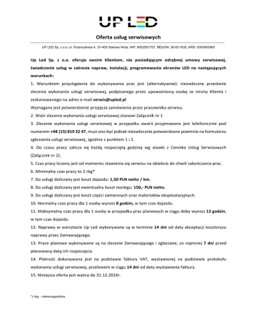 Oferta usług serwisowych UP LED Sp. z o.o. ul. Przemysłowa 4, 37-450 Stalowa Wola, NIP: 8652561757, REGON: 361811635, KRS: 0000563983 Up Led Sp. z o.o. oferuje swoim klientom, nie posiadającym odrębnej umowy serwisowej, świadczenie usług w zakresie napraw, instalacji, programowania ekranów LED na następujących warunkach: 1. Warunkiem przystąpienia do wykonywania prac jest (alternatywnie): niezwłoczne przesłanie zlecenia wykonania usługi serwisowej, podpisanego przez upoważnioną osobę ze strony Klienta i zeskanowanego na adres e-mail [email protected] Wymagane jest potwierdzenie przyjęcia zamówienia przez pracownika serwisu. 2. Wzór zlecenia wykonania usługi serwisowej stanowi Załącznik nr 1 3. Zlecenie wykonania usługi serwisowej w przypadku awarii przyjmowane jest telefonicznie pod numerem +48 (15) 819 32 47, musi ono być jednak niezwłocznie potwierdzone pisemnie na formularzu zgłoszenia usługi serwisowej, zgodnie z punktem 1 i 2. 4. Do czasu pracy zalicza się każdą rozpoczętą godzinę wg stawki z Cennika Usług Serwisowych (Załącznik nr 2). 5. Czas pracy liczony jest od momentu stawienia się serwisu na obiekcie do chwili zakończenia prac. 6. Minimalny czas pracy to 2 rbg* 7. Do usługi doliczany jest koszt dojazdu: 1,50 PLN netto / km. 8. Do usługi doliczany jest ewentualny koszt noclegu: 150,- PLN netto. 9. Do usługi doliczany jest koszt części zamiennych oraz materiałów eksploatacyjnych. 10. Normalny czas pracy dla 1 osoby wynosi 8 godzin, w tym czas dojazdu. 11. Maksymalny czas pracy dla 1 osoby w przypadku prac planowych w ciągu doby wynosi 13 godzin, w tym czas dojazdu. 12. Naprawy w warsztacie Up Led wykonywane są w terminie 14 dni od daty akceptacji kosztorysu naprawy przez Zamawiającego. 13. Prace planowe wykonywane są na zlecenie Zamawiającego i zgłaszane, co najmniej 7 dni przed planowaną datą ich rozpoczęcia. 14. Płatność dokonywana jest na podstawie faktury VAT, wystawionej na podstawie protokołu wykonania usługi serwisowej, przelewem w ciągu 14 dni od daty wystawienia faktury. 15. Niniejsza oferta jest ważna do 31.12.2016r. *) rbg – roboczogodzina