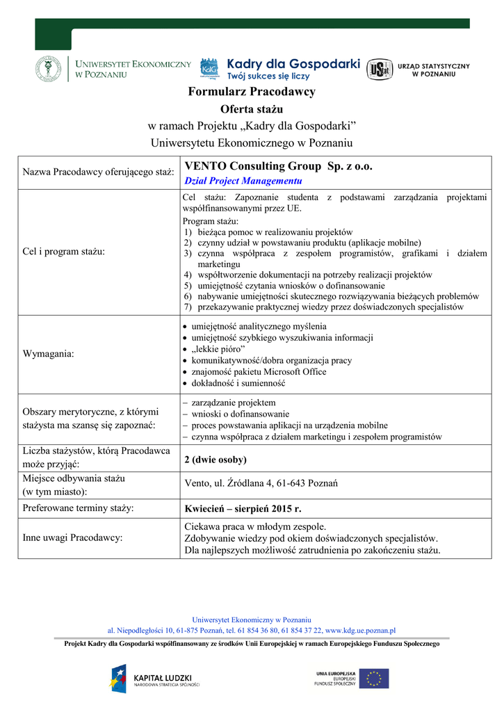 Formularz Pracodawcy Oferta stażu w ramach Projektu „Kadry dla Gospodarki” Uniwersytetu Ekonomicznego w Poznaniu Nazwa Pracodawcy oferującego staż: VENTO Consulting Group Sp. z o.o. Dział Project Managementu Cel i program stażu: Cel stażu: Zapoznanie studenta z podstawami zarządzania projektami współfinansowanymi przez UE. Program stażu: 1) bieżąca pomoc w realizowaniu projektów 2) czynny udział w powstawaniu produktu (aplikacje mobilne) 3) czynna współpraca z zespołem programistów, grafikami i działem marketingu 4) współtworzenie dokumentacji na potrzeby realizacji projektów 5) umiejętność czytania wniosków o dofinansowanie 6) nabywanie umiejętności skutecznego rozwiązywania bieżących problemów 7) przekazywanie praktycznej wiedzy przez doświadczonych specjalistów Wymagania: umiejętność analitycznego myślenia umiejętność szybkiego wyszukiwania informacji „lekkie pióro” komunikatywność/dobra organizacja pracy znajomość pakietu Microsoft Office dokładność i sumienność Obszary merytoryczne, z którymi stażysta ma szansę się zapoznać: zarządzanie projektem wnioski o dofinansowanie proces powstawania aplikacji na urządzenia mobilne czynna współpraca z działem marketingu i zespołem programistów Liczba stażystów, którą Pracodawca może przyjąć: Miejsce odbywania stażu (w tym miasto): 2 (dwie osoby) Vento, ul. Źródlana 4, 61-643 Poznań Preferowane terminy staży: Kwiecień – sierpień 2015 r. Inne uwagi Pracodawcy: Ciekawa praca w młodym zespole. Zdobywanie wiedzy pod okiem doświadczonych specjalistów. Dla najlepszych możliwość zatrudnienia po zakończeniu stażu. Uniwersytet Ekonomiczny w Poznaniu al. Niepodległości 10, 61-875 Poznań, tel. 61 854 36 80, 61 854 37 22, www.kdg.ue.poznan.pl Projekt Kadry dla Gospodarki współfinansowany ze środków Unii Europejskiej w ramach Europejskiego Funduszu Społecznego
