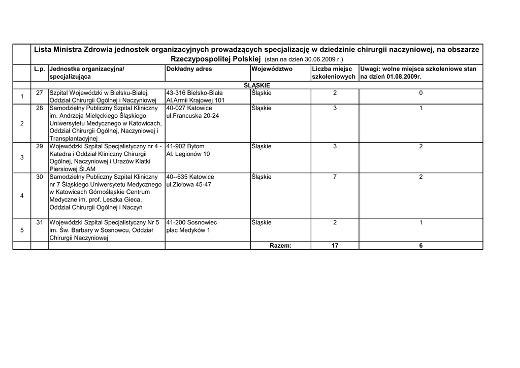 Lista Ministra Zdrowia jednostek organizacyjnych prowadzących specjalizację w dziedzinie chirurgii naczyniowej, na obszarze Rzeczypospolitej Polskiej (stan na dzień 30.06.2009 r.) L.p. Jednostka organizacyjna/ specjalizująca 1 27 28 2 29 3 30 4 31 5 Dokładny adres Województwo Liczba miejsc Uwagi: wolne miejsca szkoleniowe stan szkoleniowych na dzień 01.08.2009r. ŚLĄSKIE Śląskie 2 0 Śląskie 3 1 41-902 Bytom Al. Legionów 10 Śląskie 3 2 40--635 Katowice ul.Ziołowa 45-47 Śląskie 7 2 41-200 Sosnowiec plac Medyków 1 Śląskie 2 1 17 6 Szpital Wojewódzki w Bielsku-Białej, Oddział Chirurgii Ogólnej i Naczyniowej Samodzielny Publiczny Szpital Kliniczny im. Andrzeja Mielęckiego Śląskiego Uniwersytetu Medycznego w Katowicach, Oddział Chirurgii Ogólnej, Naczyniowej i Transplantacyjnej Wojewódzki Szpital Specjalistyczny nr 4 Katedra i Oddział Kliniczny Chirurgii Ogólnej, Naczyniowej i Urazów Klatki Piersiowej Śl.AM Samodzielny Publiczny Szpital Kliniczny nr 7 Śląskiego Uniwersytetu Medycznego w Katowicach Górnośląskie Centrum Medyczne im. prof. Leszka Gieca, Oddział Chirurgii Ogólnej i Naczyń 43-316 Bielsko-Biała Al.Armii Krajowej 101 40-027 Katowice ul.Francuska 20-24 Wojewódzki Szpital Specjalistyczny Nr 5 im. Św. Barbary w Sosnowcu, Oddział Chirurgii Naczyniowej Razem: