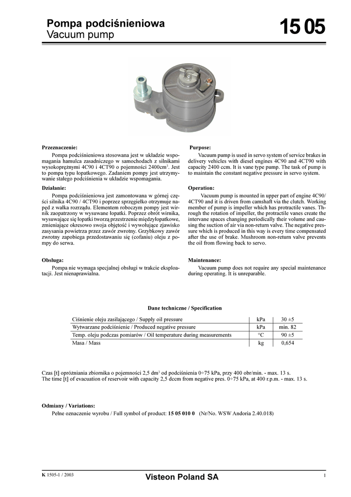 15 05 Pompa podcinieniowa Vacuum pump Przeznaczenie: Pompa podcinieniowa stosowana jest w uk³adzie wspomagania hamulca zasadniczego w samochodach z silnikami wysokoprê¿nymi 4C90 i 4CT90 o pojemnoci 2400cm3. Jest to pompa typu ³opatkowego. Zadaniem pompy jest utrzymywanie sta³ego podcinienia w uk³adzie wspomagania. Purpose: Vacuum pump is used in servo system of service brakes in delivery vehicles with diesel engines 4C90 and 4CT90 with capacity 2400 ccm. It is vane type pump. The task of pump is to maintain the constant negative pressure in servo system. Dzia³anie: Pompa podcinieniowa jest zamontowana w górnej czêci silnika 4C90 / 4CT90 i poprzez sprzêgie³ko otrzymuje napêd z wa³ka rozrz¹du. Elementem roboczym pompy jest wirnik zaopatrzony w wysuwane ³opatki. Poprzez obrót wirnika, wysuwaj¹ce siê ³opatki tworz¹ przestrzenie miêdzy³opatkowe, zmieniaj¹ce okresowo swoja objêtoæ i wywo³uj¹ce zjawisko zasysania powietrza przez zawór zwrotny. Grzybkowy zawór zwrotny zapobiega przedostawaniu siê (cofaniu) oleju z pompy do serwa. Operation: Vacuum pump is mounted in upper part of engine 4C90/ 4CT90 and it is driven from camshaft via the clutch. Working member of pump is impeller which has protractile vanes. Through the rotation of impeller, the protractile vanes create the intervane spaces changing periodically their volume and causing the suction of air via non-return valve. The negative pressure which is produced in this way is every time compensated after the use of brake. Mushroom non-return valve prevents the oil from flowing back to servo. Obs³uga: Pompa nie wymaga specjalnej obs³ugi w trakcie eksploatacji. Jest nienaprawialna. Maintenance: Vacuum pump does not require any special maintenance during operating. It is unreparable. Dane techniczne / Specification Cinienie oleju zasilaj¹cego / Supply oil pressure Wytwarzane podcinienie / Produced negative pressure Temp. oleju podczas pomiarów / Oil temperature during measurements Masa / Mass kPa kPa °C kg 30 ±5 min. 82 90 ±5 0,654 Czas [t] opró¿niania zbiornika o pojemnoci 2,5 dm3 od podcinienia 0÷75 kPa, przy 400 obr/min. - max. 13 s. The time [t] of evacuation of reservoir with capacity 2,5 dccm from negative pres. 0÷75 kPa, at 400 r.p.m. - max. 13 s. Odmiany / Variations: Pe³ne oznaczenie wyrobu / Full symbol of product: 15 05 010 0 (Nr/No. WSW Andoria 2.40.018) K 1505-1 / 2003 Visteon Poland SA 1 2 K 1505-1 / 2003
