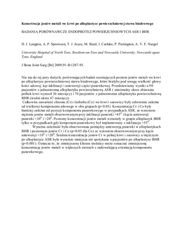 Koncetracja jonów metali we krwi po alloplastyce powie rzchniowe j stawu biodrowego BADANIA PORÓWNAWCZE ENDOPROTEZ POWIERZCHNIOWYCH ASR I BHR D. J. Langton, A. P. Sprowson, T. J. Joyce, M. Reed, I. Carluke, P. Partington, A. V. F. Nargol University Hospital of North Tees, Stockton-on-Tees and Newcastle University, Newcastle upon Tyne, England J Bone Joint Surg [Br] 2009;91-B:1287-95. Nie ma do tej pory dużych, porównujących badań oceniających poziom jonów metali we krwi po alloplastyce powierzchniowej stawu biodrowego, które brałyby pod uwagę wielkość głowy kości udowej, kąt inklinacji i antewersji części panewkowej. Przedstawiamy wyniki u 9 0 pacjentów z jednostronną alloplastyka powierzchniową ASR ( minimalny okres zbierania próbek krwi wynosił 26 miesięcy) i 70 pacjentów z jednostronna alloplastyka powierzchniową BHR (średni okres 47 miesięcy). Całkowita zawartość chromu (Cr) i kobaltu (Co ) we krwi i surowicy były odwrotnie zależne od wielkości komponentu udowego w obu grupach (p<0.05). Koncentracja Cr i Co były bardziej zależne od pozycji komponentu panewkowego w przypadkach ASR, ze wzrostem stężenia jonów metali obserwowanym przy inklinacji panewki >45 0 i kącie antewersji panewki <100 i >200 . Poziomy koncentracji jonów metali wzrastały w grupie alloplastyk BHR tylko w przypadkach gdy komponent panewkowy był implantowany z inklinacja >55 0 . Wyraźna zależność była obserwowana pomiędzy antewersją panewki w alloplastykach BHR i poziomem jonów Cr i Co (p<0.05 dla Co) ze wzrostem obserwowanym przy kącie antewersji <100 i >200 . Średnia koncentracja jonów Cr w pełnej krwi i surowicy u mężczyzn po alloplastyce ASR była wyraźnie mniejsza niż spotykana u pacjentów po alloplastyce BHR (p<0.001). Oznacza to, że zmniejszony klirans średnicy może oznaczać zmniejszoną koncentrację jonów metali w większych stawach z zadowalającą orientacją komponentu panewkowego.
