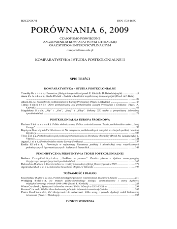 ROCZNIK VI ISSN 1733-165X PORÓWNANIA 6, 2009 CZASOPISMO POŚWIĘCONE ZAGADNIENIOM KOMPARATYSTYKI LITERACKIEJ ORAZ STUDIOM INTERDYSCYPLINARNYM [email protected] KOMPARATYSTYKA I STUDIA POSTKOLONIALNE II SPIS TREŚCI KOMPARATYSTYKA – STUDIA POSTKOLONIALNE Timothy B r e n n a n, Humanizm, filologia i imperializm (przeł. E. Kledzik, D. Kołodziejczyk)……………….9 Anna Z e l e n k o v á, Studia Wschód – Zachód w kontekście współczesnej komparatystyki (Przeł. A.F. Kola) ............................................................................................................................................................... ………39 Alison R i c e, Frankofoński postkolonializm z Europy Wschodniej (Przeł. E. Kledzik) ........................... ………47 Tamás S c h e i b n e r, Okres postkolonialny czy postkolonialna Europa Wschodnia i Środkowa (Przeł. A. Czövek) ............................................................................................................................................... ………65 Magdalena K o c h, „My” i „Oni”, „Swój” i „Obcy”. Bałkany XX wieku z perspektywy kolonialnej i postkolonialnej .................................................................................................................................... ………75 POSTKOLONIALNA EUROPA ŚRODKOWA Dariusz S k ó r c z e w s k i, Polska skolonizowana, Polska zorientalizowana. Teoria postkolonialna wobec „innej Europy” ............................................................................................................................................... ………95 Krystyna K a r d y n i-P e l i k á n o v á, Na marginesie postkolonialnych odczytań w relacjach polskiej i czeskiej literatury ............................................................................................................................................... ……..107 Tibor Ţ i l k a, Postkolonializm pod postacią postmodernizmu w literaturze słowackiej (Przeł. M. Lemańczyk i L. Vitová) ................................................................................................................................................. ……..121 Agata L i s i a k, (Post)kolonialne miasta Europy Środkowej ...................................................................... ..........137 Emilia K l e d z i k, Prowincja w najnowszej literaturze polskiej i niemieckiej oraz współczesnych polonistycznych i germanistycznych badaniach literackich............................................................. ……..149 FEMINISTYCZNA PERSPEKTYWA TEORII POSTKOLONIALNEJ Barbara C z a p i k-L i t y ń s k a, „Uwikłane w przemoc”. Ţensko pismo – dyskurs emancypacyjny i krytyczny z perspektywy teorii postkolonialnej .................................................................................. ……..165 Dobrochna D a b e r t, Kwestie kobiece w czeskiej i słowackiej refleksji filmowej po roku 1989 ................. ……..179 Agnieszka M a t u s i a k, Kolonialna tancerka w Orgii Łesi Ukrainki ...................................................... ……..197 TOŻSAMOŚĆ I DIALOG Mieczysław D ą b r o w s k i, Wokół stereotypów polskości i niemieckości. Rudnicki i Załuski ...........................211 Wolfgang S c h l o t t, Na tropach polsko-ukraińskiego dialogu: uwarunkowania i areny dyskursu międzykulturowego w latach 1946–1989 (Przeł. E. Kledzik) ............................................................. ……..225 Wiera O c c h e l i, Społeczne i kulturalne stosunki Polski i Gruzji w XVI–XVIII w. ................................ ……..239 Hanna C i s z e k, Wielka idea a budowanie jedności i tożsamości narodowej Greków ............................... ……..245 Piotra R u d k o u s k i, Od identyczności do sobornosti. Kilka uwag z powodu dyskusji wokół białoruskiej tożsamości (Przeł. I. Blotskaya) .......................................................................................................... ……..255 PUNKTY WIDZENIA Dipesh C h a k r a b a r t y, Od Subaltern Studies do Provincializing Europe: kilka postkolonialnych refleksji na temat historii (Przeł. E. Kledzik) ................................................................................................. ……..263 György S p i r ó, Dwie mentalności Europy Środkowo-Wschodniej z punktu widzenia państwowości (Przeł. W. Kasprzak) ............................................................................................................................................ ……..271 RECENZJE Halina Janaszek-Ivaničková: Kilka uwag o kwestii żydowskiej w Słowacji i w Polsce. Na marginesie książki Barbary Suchoń-Chmiel, Spóźnione spowiedzi, czyli autobiografie uwikłanych w historię pisarzy słowackich XX wieku (Barbara Suchoń-Chmiel, Spóźnione spowiedzi czyli autobiografie uwikłanych w historię pisarzy słowackich XX wieku. Wydawnictwo Uniwersytetu Jagiellońskiego, Kraków 2007, ss. 214). – Anastasia Chatzigiannidi: Miłość (anty)narodowa. Erotyka i tożsamość w XIX-wiecznej Grecji (Mairī Mike, Erōs (ant)ethnikos. Erōtikī Epithymia kai Ethniki Tautotīta ton 19ο aiōna. Polis, Ateny 2007). – Agnieszka Matusiak: „Wszystko, co jest lub było sztuką, może stać się kiczem” (Tamara Gundorova, Kitč i literatura. Travestiji. Vyd. „Fakt”, Kyiv 2008, ss. 280). – Emilia Kledzik: Poeta i władza (Anna Artwińska, Poeta w służbie polityki. Instrumentalizacja Mickiewicza w PRL-u i Goethego w NRD, Poznań 2008, ss. 266). – Dobrochna Dabert: Praska Wiosna 1968 (Pražské jaro 1968. Literatura – film – média. Materiály z mezinárodní konference pořádané Literární akademií za spolupráce s Městskou knihovnou Praha 20. – 22. května 2008. Literární akademie (Soukromá vysoká škola Josefa Škvoreckého), Praha 2009, ss. 388) ...................................................................