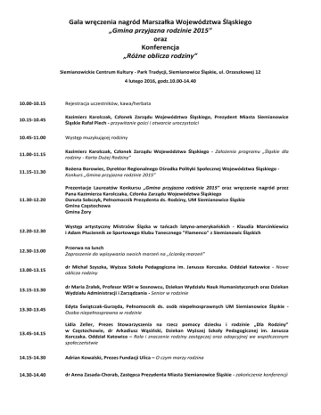 Gala wręczenia nagród Marszałka Województwa Śląskiego „Gmina przyjazna rodzinie 2015” oraz Konferencja „Różne oblicza rodziny” Siemianowickie Centrum Kultury - Park Tradycji, Siemianowice Śląskie, ul. Orzeszkowej 12 4 lutego 2016, godz.10.00-14.40 10.00-10.15 Rejestracja uczestników, kawa/herbata 10.15-10.45 Kazimierz Karolczak, Członek Zarządu Województwa Śląskiego, Prezydent Miasta Siemianowice Śląskie Rafał Piech - przywitanie gości i otwarcie uroczystości 10.45-11.00 Występ muzykującej rodziny 11.00-11.15 Kazimierz Karolczak, Członek Zarządu Województwa Śląskiego - Założenia programu „Śląskie dla rodziny - Karta Dużej Rodziny” 11.15-11.30 Bożena Borowiec, Dyrektor Regionalnego Ośrodka Polityki Społecznej Województwa Śląskiego Konkurs „Gmina przyjazna rodzinie 2015” 11.30-12.20 Prezentacje Laureatów Konkursu „Gmina przyjazna rodzinie 2015” oraz wręczenie nagród przez Pana Kazimierza Karolczaka, Członka Zarządu Województwa Śląskiego Danuta Sobczyk, Pełnomocnik Prezydenta ds. Rodziny, UM Siemianowice Śląskie Gmina Częstochowa Gmina Żory 12.20-12.30 Występ artystyczny Mistrzów Śląska w tańcach latyno-amerykańskich - Klaudia Marcinkiewicz i Adam Płuciennik ze Sportowego Klubu Tanecznego "Flamenco" z Siemianowic Śląskich 12.30-13.00 Przerwa na lunch Zaproszenie do wpisywania swoich marzeń na „ściankę marzeń” 13.00-13.15 dr Michał Szyszka, Wyższa Szkoła Pedagogiczna im. Janusza Korczaka. Oddział Katowice - Nowe oblicza rodziny 13.15-13.30 dr Maria Zrałek, Profesor WSH w Sosnowcu, Dziekan Wydziału Nauk Humanistycznych oraz Dziekan Wydziału Administracji i Zarządzania - Senior w rodzinie 13.30-13.45 Edyta Świątczak-Gurzęda, Pełnomocnik ds. osób niepełnosprawnych UM Siemianowice Śląskie Osoba niepełnosprawna w rodzinie 13.45-14.15 Lidia Zeller, Prezes Stowarzyszenia na rzecz pomocy dziecku i rodzinie „Dla Rodziny” w Częstochowie, dr Arkadiusz Wąsiński, Dziekan Wyższej Szkoły Pedagogicznej im. Janusza Korczaka. Oddział Katowice – Rola i znaczenie rodziny zastępczej oraz adopcyjnej we współczesnym społeczeństwie 14.15-14.30 Adrian Kowalski, Prezes Fundacji Ulica – O czym marzy rodzina 14.30-14.40 dr Anna Zasada-Chorab, Zastępca Prezydenta Miasta Siemianowice Śląskie - zakończenie konferencji