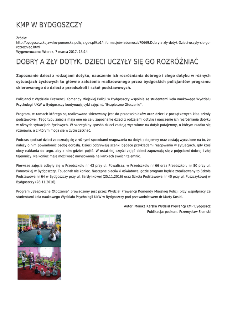 KMP W BYDGOSZCZY Źródło: http://bydgoszcz.kujawsko-pomorska.policja.gov.pl/kb1/informacje/wiadomosci/70669,Dobry-a-zly-dotyk-Dzieci-uczyly-sie-gorozrozniac.html Wygenerowano: Wtorek, 7 marca 2017, 13:14 DOBRY A ZŁY DOTYK. DZIECI UCZYŁY SIĘ GO ROZRÓŻNIAĆ Zapoznanie dzieci z rodzajami dotyku, nauczenie ich rozróżniania dobrego i złego dotyku w różnych sytuacjach życiowych to główne założenia realizowanego przez bydgoskich policjantów programu skierowanego do dzieci z przedszkoli i szkół podstawowych. Policjanci z Wydziału Prewencji Komendy Miejskiej Policji w Bydgoszczy wspólnie ze studentami koła naukowego Wydziału Psychologii UKW w Bydgoszczy kontynuują cykl zajęć nt. "Bezpieczne Otoczenie". Program, w ramach którego są realizowane skierowany jest do przedszkolaków oraz dzieci z początkowych klas szkoły podstawowej. Tego typu zajęcia mają one na celu zapoznanie dzieci z rodzajami dotyku i nauczenie ich rozróżniania dotyku w różnych sytuacjach życiowych. W szczególny sposób dzieci zostają wyczulone na dotyk potajemny, o którym rzadko się rozmawia, a z którym mogą się w życiu zetknąć. Podczas spotkań dzieci zapoznają się z różnymi sposobami reagowania na dotyk potajemny oraz zostają wyczulone na to, że należy o nim powiadomić osobę dorosłą. Dzieci odgrywają scenki będące przykładami reagowania w sytuacjach, gdy ktoś obcy nakłania do tego, aby z nim gdzieś pójść. W ostatniej części zajęć dzieci zapoznają się z pojęciami dobrej i złej tajemnicy. Na koniec mają możliwość narysowania na kartkach swoich tajemnic. Pierwsze zajęcia odbyły się w Przedszkolu nr 43 przy ul. Powalisza, w Przedszkolu nr 66 oraz Przedszkolu nr 80 przy ul. Pomorskiej w Bydgoszczy. To jednak nie koniec. Następne placówki oświatowe, gdzie program będzie zrealizowany to Szkoła Podstawowa nr 64 w Bydgoszczy przy ul. Sardynkowej (25.11.2016) oraz Szkoła Podstawowa nr 40 przy ul. Puszczykowej w Bydgoszczy (28.11.2016). Program „Bezpieczne Otoczenie” prowadzony jest przez Wydział Prewencji Komendy Miejskiej Policji przy współpracy ze studentami koła naukowego Wydziału Psychologii UKW w Bydgoszczy pod przewodnictwem dr Marty Kosiol. Autor: Monika Karska Wydział Prewencji KMP Bydgoszcz Publikacja: podkom. Przemysław Słomski Ocena: 0/5 (0) Tweetnij