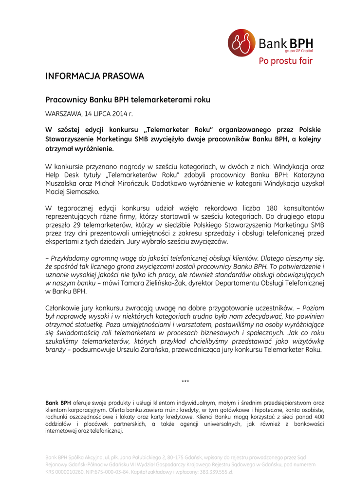 INFORMACJA PRASOWA Pracownicy Banku BPH telemarketerami roku WARSZAWA, 14 LIPCA 2014 r. W szóstej edycji konkursu „Telemarketer Roku” organizowanego przez Polskie Stowarzyszenie Marketingu SMB zwyciężyło dwoje pracowników Banku BPH, a kolejny otrzymał wyróżnienie. W konkursie przyznano nagrody w sześciu kategoriach, w dwóch z nich: Windykacja oraz Help Desk tytuły „Telemarketerów Roku” zdobyli pracownicy Banku BPH: Katarzyna Muszalska oraz Michał Mirończuk. Dodatkowo wyróżnienie w kategorii Windykacja uzyskał Maciej Siemaszko. W tegorocznej edycji konkursu udział wzięła rekordowa liczba 180 konsultantów reprezentujących różne firmy, którzy startowali w sześciu kategoriach. Do drugiego etapu przeszło 29 telemarketerów, którzy w siedzibie Polskiego Stowarzyszenia Marketingu SMB przez trzy dni prezentowali umiejętności z zakresu sprzedaży i obsługi telefonicznej przed ekspertami z tych dziedzin. Jury wybrało sześciu zwycięzców. – Przykładamy ogromną wagę do jakości telefonicznej obsługi klientów. Dlatego cieszymy się, że spośród tak licznego grona zwycięzcami zostali pracownicy Banku BPH. To potwierdzenie i uznanie wysokiej jakości nie tylko ich pracy, ale również standardów obsługi obowiązujących w naszym banku – mówi Tamara Zielińska-Żak, dyrektor Departamentu Obsługi Telefonicznej w Banku BPH. Członkowie jury konkursu zwracają uwagę na dobre przygotowanie uczestników. – Poziom był naprawdę wysoki i w niektórych kategoriach trudno było nam zdecydować, kto powinien otrzymać statuetkę. Poza umiejętnościami i warsztatem, postawiliśmy na osoby wyróżniające się świadomością roli telemarketera w procesach biznesowych i społecznych. Jak co roku szukaliśmy telemarketerów, których przykład chcielibyśmy przedstawiać jako wizytówkę branży – podsumowuje Urszula Zarańska, przewodnicząca jury konkursu Telemarketer Roku. *** Bank BPH oferuje swoje produkty i usługi klientom indywidualnym, małym i średnim przedsiębiorstwom oraz klientom korporacyjnym. Oferta banku zawiera m.in.: kredyty, w tym gotówkowe i hipoteczne, konta osobiste, rachunki oszczędnościowe i lokaty oraz karty kredytowe. Klienci Banku mogą korzystać z sieci ponad 400 oddziałów i placówek partnerskich, a także agencji uniwersalnych, jak również z bankowości internetowej oraz telefonicznej. Bank BPH Spółka Akcyjna, ul. płk. Jana Pałubickiego 2, 80-175 Gdańsk, wpisany do rejestru prowadzonego przez Sąd Rejonowy Gdańsk-Północ w Gdańsku VII Wydział Gospodarczy Krajowego Rejestru Sądowego w Gdańsku, pod numerem KRS 0000010260. NIP:675-000-03-84. Kapitał zakładowy i wpłacony: 383.339.555 zł. Bank BPH jest obecny na polskim rynku od ponad 20 lat. Jest spółką publiczną notowaną na Giełdzie Papierów Wartościowych w Warszawie i wchodzi w skład indeksu Respect. Siedzibą prawną Banku BPH jest Gdańsk, biuro centrali znajduje się w Warszawie, a główne centra operacyjne w Krakowie i Gdańsku. Bank BPH wchodzi w skład grupy kapitałowej GE, jednej z największych korporacji na świecie. Bank BPH Spółka Akcyjna, ul. płk. Jana Pałubickiego 2, 80-175 Gdańsk, wpisany do rejestru prowadzonego przez Sąd Rejonowy Gdańsk-Północ w Gdańsku VII Wydział Gospodarczy Krajowego Rejestru Sądowego w Gdańsku, pod numerem KRS 0000010260. NIP:675-000-03-84. Kapitał zakładowy i wpłacony: 383.339.555 zł.