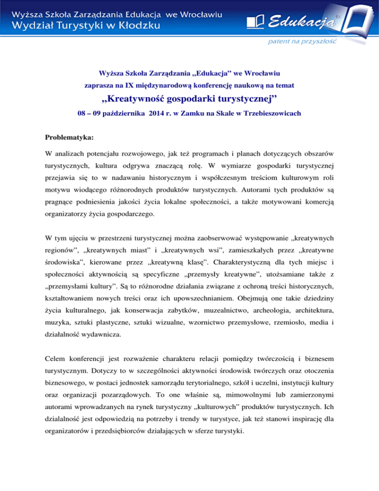 Wyższa Szkoła Zarządzania „Edukacja” we Wrocławiu zaprasza na IX międzynarodową konferencję naukową na temat „Kreatywność gospodarki turystycznej” 08 – 09 października 2014 r. w Zamku na Skale w Trzebieszowicach Problematyka: W analizach potencjału rozwojowego, jak też programach i planach dotyczących obszarów turystycznych, kultura odgrywa znaczącą rolę. W wymiarze gospodarki turystycznej przejawia się to w nadawaniu historycznym i współczesnym treściom kulturowym roli motywu wiodącego różnorodnych produktów turystycznych. Autorami tych produktów są pragnące podniesienia jakości życia lokalne społeczności, a także motywowani komercją organizatorzy życia gospodarczego. W tym ujęciu w przestrzeni turystycznej można zaobserwować występowanie „kreatywnych regionów”, „kreatywnych miast” i „kreatywnych wsi”, zamieszkałych przez „kreatywne środowiska”, kierowane przez „kreatywną klasę”. Charakterystyczną dla tych miejsc i społeczności aktywnością są specyficzne „przemysły kreatywne”, utożsamiane także z „przemysłami kultury”. Są to różnorodne działania związane z ochroną treści historycznych, kształtowaniem nowych treści oraz ich upowszechnianiem. Obejmują one takie dziedziny życia kulturalnego, jak konserwacja zabytków, muzealnictwo, archeologia, architektura, muzyka, sztuki plastyczne, sztuki wizualne, wzornictwo przemysłowe, rzemiosło, media i działalność wydawnicza. Celem konferencji jest rozważenie charakteru relacji pomiędzy twórczością i biznesem turystycznym. Dotyczy to w szczególności aktywności środowisk twórczych oraz otoczenia biznesowego, w postaci jednostek samorządu terytorialnego, szkół i uczelni, instytucji kultury oraz organizacji pozarządowych. To one właśnie są, mimowolnymi lub zamierzonymi autorami wprowadzanych na rynek turystyczny „kulturowych” produktów turystycznych. Ich dzialalność jest odpowiedzią na potrzeby i trendy w turystyce, jak też stanowi inspirację dla organizatorów i przedsiębiorców działających w sferze turystyki. Zakres tematyczny W relacjach z badań naukowych i osobistych doświadczeń będących podstawą dyskusji i wymiany poglądów, poszukuje się odniesień do następujących problemów: • specyfika sektora kreatywnego w turystyce; • sztuka jako odpowiedź na nowe potrzeby i trendom we współczesnej turystyce; • trendy i potrzeby sektora kreatywnego; • zarządzanie sektorem kreatywnym w turystyce; • instytucjonalne wsparcie sztuki dla potrzeb turystyki; • powiązania nauki z biznesem w sferze przemysłów kreatywnych; • oryginalność turystycznych, „kulturowych” produktów w świetle etyki i prawa; • ekonomika wytwarzania „produktów kreatywnych” dla potrzeb turystyki; Intencją organizatorów jest to, aby konferencja miała charakter interdyscyplinarny, co pozwoli na konfrontację obserwacji dokonanych z różnej perspektywy badawczej. Komitet naukowy: Przewodniczący: dr inż. arch. Mieczysław K. Leniartek Sekretarz naukowy: dr Teresa Bogacz Członkowie: prof. dr hab. Jan Grad, Uniwersytet im. Adama Mickiewicza w Poznaniu prof. dr hab. Ryszard W. Kluszczyński, Uniwersytet Łódzki prof. dr hab. Lesław Koćwin, Wyższa Szkoła Handlowa we Wrocławiu prof. dr hab. Włodzimierz Kurek, Uniwersytet Jagielloński prof. dr hab. Krzysztof R. Mazurski, Wyższa Szkoła Zarządzania „Edukacja” we Wrocławiu prof. dr hab. inż. arch. Anna Mitkowska, Politechnika Krakowska prof. dr hab. inż. arch. Jacek Suchodolski, Politechnika Wrocławska dr hab. Barbara Lubicz-Miszewska, Wyższa Szkoła Zarządzania „Edukacja” we Wrocławiu dr hab. Wiesława Żyszkowska, Wyższa Szkoła Zarządzania „Edukacja” we Wrocławiu Komitet organizacyjny: dr Jolanta Kowal – Prorektor WSZ „Edukacja” dr Robert Piechota – Dziekan Wydziału Turystyki WSZ-E dr Włodzimierz Ranoszek Komitet honorowy: dr Marek Lewandowski – Rektor WSZ „Edukacja” Urszula Nowak – Prezes OKiDZ „Edukacja” Maciej Awiżeń – Starosta Kłodzki Bogusław Szpytma – Burmistrz Kłodzka Stanisław Longawa – Wójt Gminy Kłodzko Sekretarz konferencji: Joanna Przerywacz- Orzechowska tel. 74 867 05 53 e-mail: [email protected] Miejsce konferencji: Hotel Zamek na Skale w Trzebieszowicach http://www.zameknaskale.com.pl Opłata konferencyjna wynosi 500,00 (pięćset) zł i pokrywa koszty opublikowania dostarczonego przez uczestników konferencji tekstu w recenzowanej pracy zbiorowej oraz otrzymanie materiałów konferencyjnych i pokonferencyjnych. Opłata nie obejmuje noclegu w Hotelu Zamek na Skale. Podaną kwotę należy wpłacić na konto: Wyższa Szkoła Zarządzania „Edukacja” we Wrocławiu 50-425 Wrocław, ul. Krakowska 56-62 11 1020 5226 0000 6702 0019 0918 do 30 sierpnia 2014 r., z adnotacją Konferencja Kłodzko 2014. Tekst w 2. egzemplarzach wydruku oraz na płycie CD należy dostarczyć najpóźniej do 7 października 2014 r. na niżej podany adres. Dodatkowo tekst referatu należy przesłać za pośrednictwem poczty elektronicznej na adres: [email protected] Wydział Turystyki Wyższej Szkoły Zarządzania „Edukacja”, ul. Wyspiańskiego 2 F, 57-300 Kłodzko z adnotacją KONFERENCJA KŁODZKO 2014. Informacje organizacyjne: Konferencja odbędzie się Termin nadsyłania kart zgłoszeń ze streszczeniami: Termin wniesienia opłaty konferencyjnej Termin ogłoszenia programu konferencji Termin nadsyłania referatów: 08 – 09 października 2014 r. 30 sierpnia 2014 r. 30 sierpnia 2014 r. 02 października 2014 r. 20 września 2014 r. W celu usprawnienia procesu wydawniczego prosimy o przestrzeganie poniższych zasad: • imię i nazwisko autora/ów – czcionka 12 pkt; • nazwa uczelni i jednostki organizacyjnej (w jęz. polskim i angielskim) – czcionka 12 pkt; • tytuł referatu (w jęz. polskim i angielskim) – czcionka 14 pkt, bold; podtytuły – czcionka 12 pkt. bold; • objętość referatu (