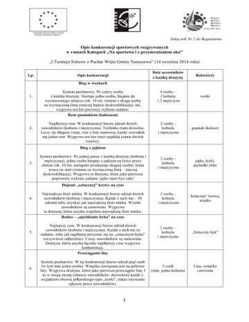 Załącznik Nr 2 do Regulaminu Opis konkurencji sportowych rozgrywanych w ramach Kategorii „Na sportowo i z przymruŜeniem oka” „I Turnieju Sołectw o Puchar Wójta Gminy Naruszewo” (14 września 2014 roku) Lp. Ilość uczestników z kaŜdej druŜyny Rekwizyty System pucharowy. Po cztery osoby z kaŜdej druŜyny. Startuje jedna osoba, biegnie do wyznaczonego miejsca (ok. 10 m), zmiana z drugą osobą za wyznaczoną linią (inaczej będzie dyskwalifikacja), itd., wygrywa ten kto pierwszy wykona zadanie. Rzut gumiakiem (kaloszem) 4 osoby – 2 kobiety i 2 męŜczyzn worki NajdłuŜszy rzut. W konkurencji bierze udział dwóch zawodników (kobieta i męŜczyzna). Technika rzutu dowolna. Liczy się długość rzutu, rzut z linii startowej, kaŜdy zawodnik ma jeden rzut. Wygrywa ten kto rzuci najdalej (suma dwóch rzutów). 2 osoby kobieta i męŜczyzna gumiak (kalosz) 2 osoby kobieta i męŜczyzna jajka, łyŜki, pachołki Ŝółte 2 osoby kobieta i męŜczyzna Sztuczna” krowa, wiadro 2 osoby – kobieta i męŜczyzna „Sztuczny byk” 5 osób (min. jedna kobieta) Lina, wstąŜka czerwona Opis konkurencji Bieg w workach 1. 2. Bieg z jajkiem 3. System pucharowy. Po jednej parze z kaŜdej druŜyny (kobieta i męŜczyzna), jedna osoba biegnie z jajkiem na łyŜce przez slalom (ok. 10 m), następnie przekazuje drugiej osobie, która wraca na start (zmiana za wyznaczoną linią – inaczej dyskwalifikacja). Wygrywa ta druŜyna, która jako pierwsza poprawnie wykona zadanie: jajko musi być całe! Dojenie „sztucznej” krowy na czas 4. 5. 6. Największa ilość mleka. W konkurencji bierze udział dwóch zawodników (kobieta i męŜczyzna). KaŜde z nich ma – 30 sekund Ŝeby uzyskać jak największą ilość mleka. Wyniki zawodników są sumowane. Wygrywa ta druŜyna, która uzyska wspólnie największą ilość mleka. Rodeo – „ujeŜdŜanie byka” na czas Najlepszy czas. W konkurencji bierze udział dwóch zawodników (kobieta i męŜczyzna). KaŜde z nich ma za zadanie, Ŝeby jak najdłuŜej utrzymać się na „sztucznym byku” (oczywiście oddzielnie). Czasy zawodników są sumowane. DruŜyna, która uzyska łącznie najdłuŜszy czas wygrywa konkurencję. Przeciąganie liny System pucharowy. W tej konkurencji bierze udział pięć osób (w tym min jedna osoba). WstąŜka zawiązana jest na połowie liny. Wygrywa druŜyna, która jako pierwsza przeciągnie linę 3 m w swoją stronę (obuwie zawodników: dozwolone kaŜde z wyjątkiem obuwia piłkarskiego typu „korki”, zakaz uŜywania rękawic przez zawodników). 1