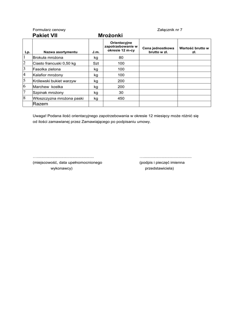 Formularz cenowy Załącznik nr 7 Pakiet VII Lp. 1 2 3 4 5 6 7 8 Nazwa asortymentu Mrożonki J.m. Orientacyjne zapotrzebowanie w okresie 12 m-cy Brokuła mrożona kg 80 Ciasto francuski 0,50 kg Szt 100 Fasolka zielona kg 100 Kalafior mrożony kg 100 Królewski bukiet warzyw kg 200 Marchew kostka kg 200 Szpinak mrożony kg 30 Włoszczyzna mrożona paski kg 450 Cena jednostkowa brutto w zł. Wartość brutto w zł. Razem Uwaga! Podana ilość orientacyjnego zapotrzebowania w okresie 12 miesięcy może różnić się od ilości zamawianej przez Zamawiającego po podpisaniu umowy. …................................................... …........................................... (miejscowość, data upełnomocnionego (podpis i pieczęć imienna wykonawcy) przedstawiciela)